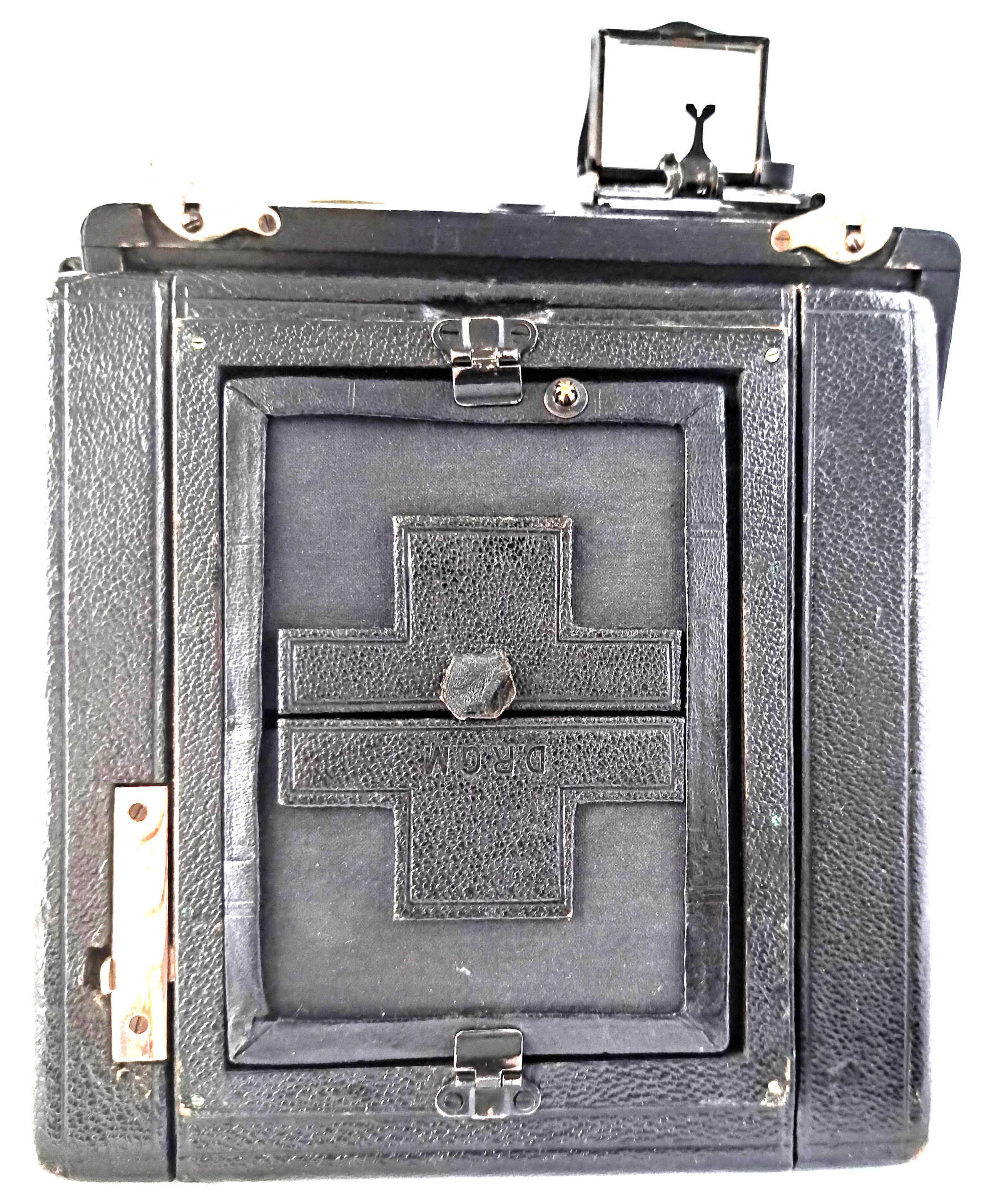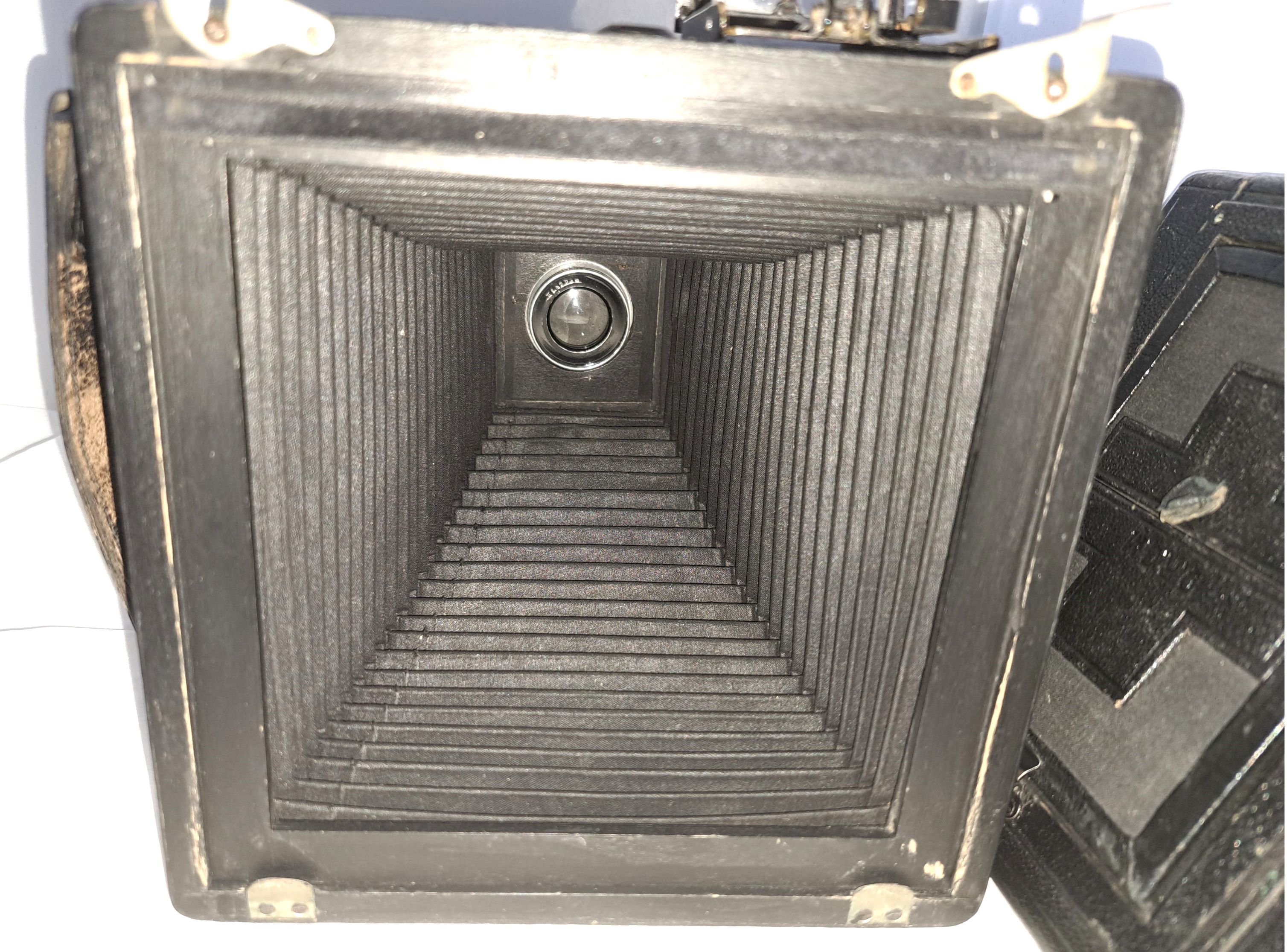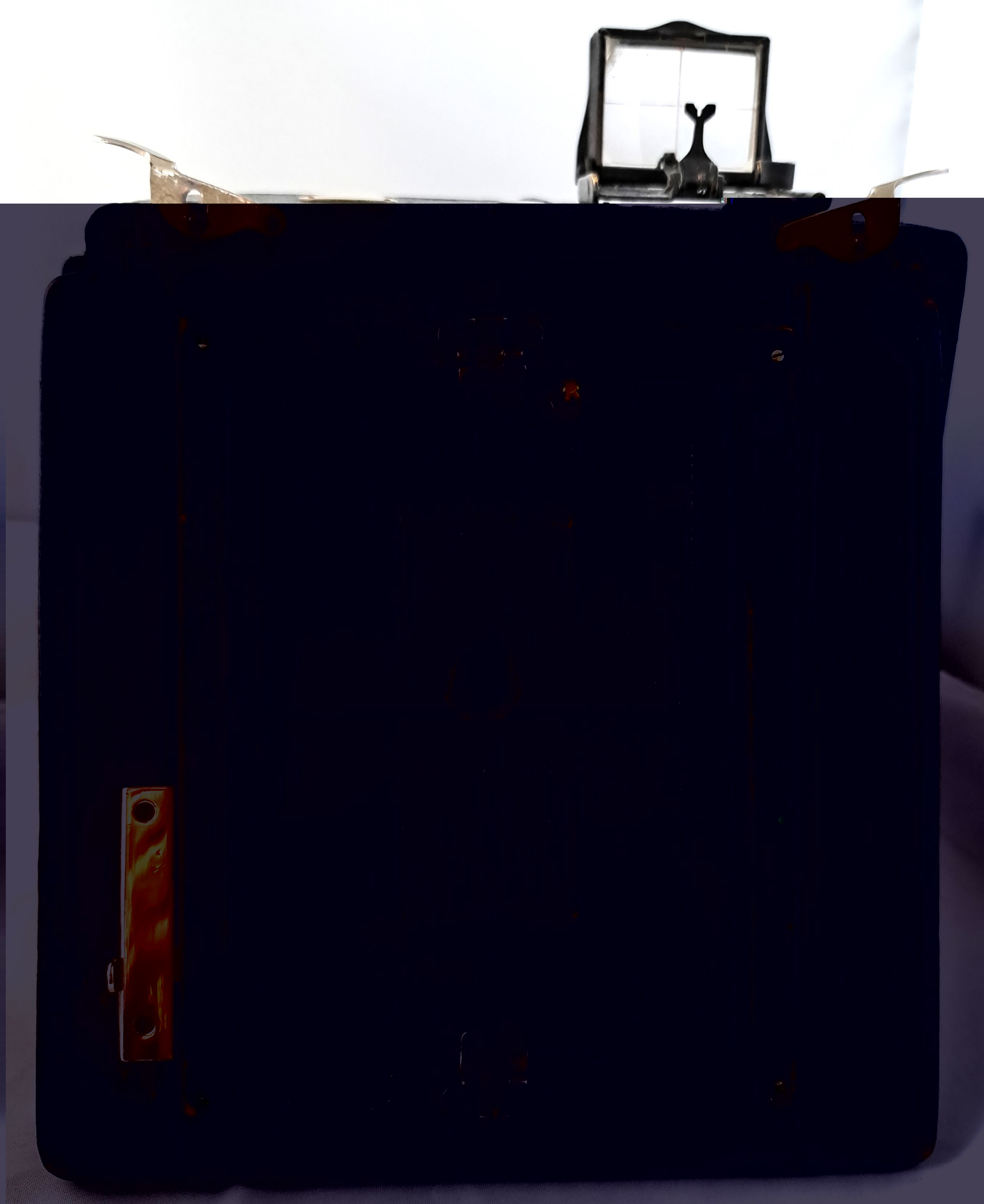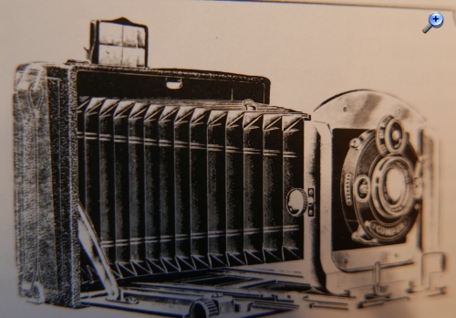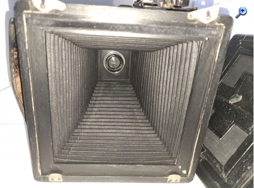 Das Gehäuse (bei Pferden spricht man von Gebäude) ist quadratisch, aus Holz und lederbezogen. Das Aufnahmeformat ist 9x12. Der Laufboden und das Objektivbrett sind aus dunklem (Teak) Holz - schwarz lackiert.
