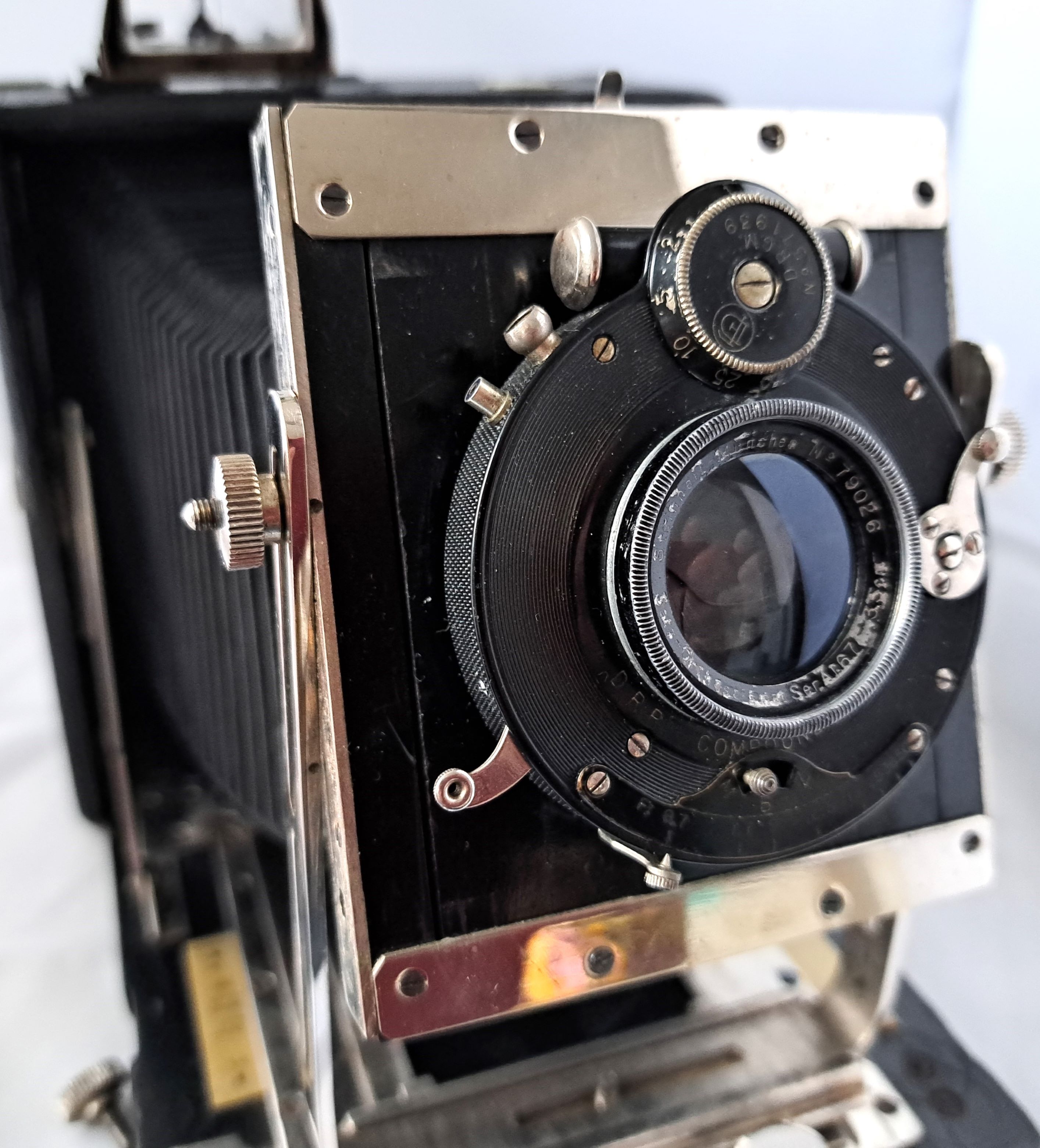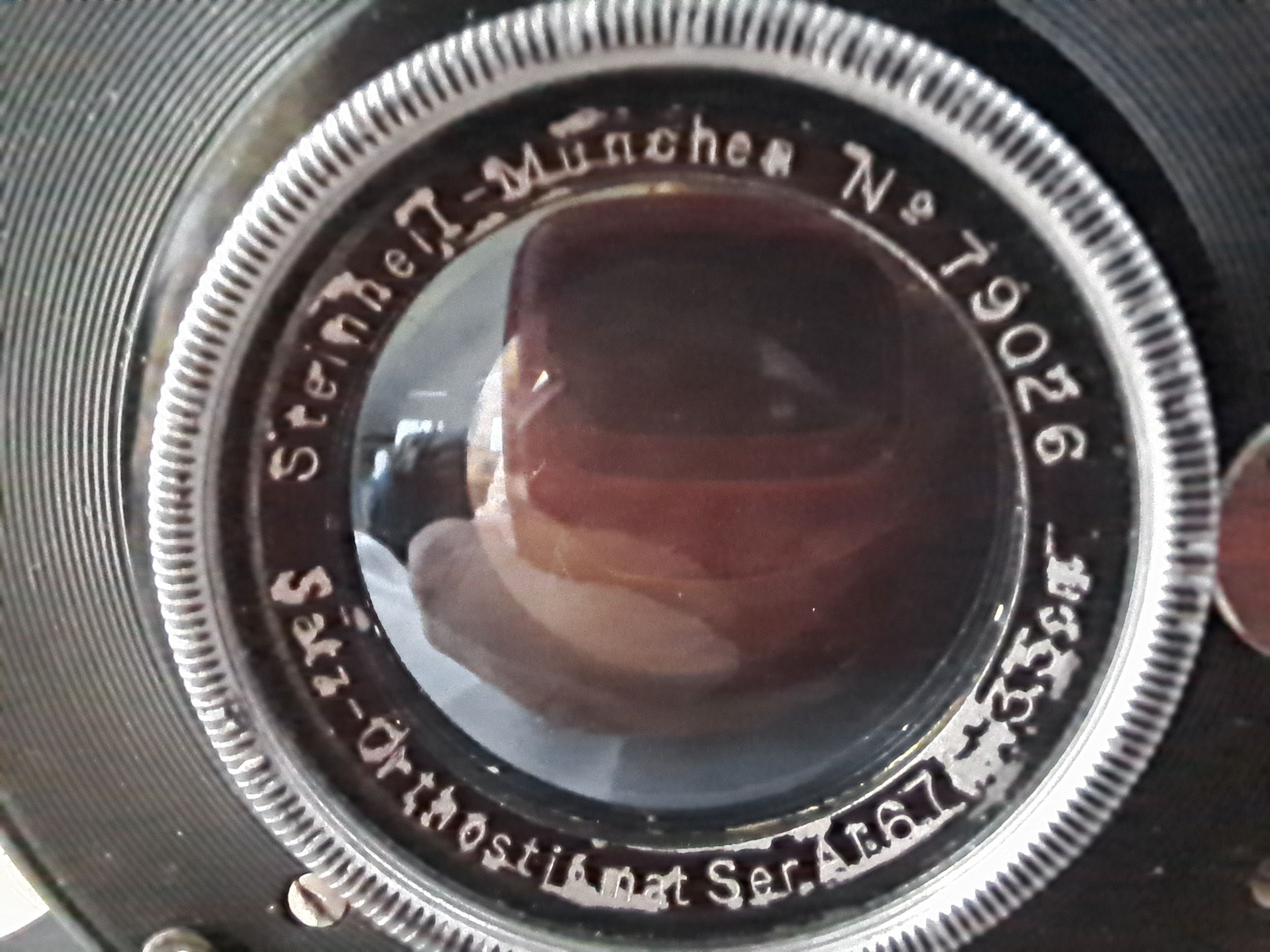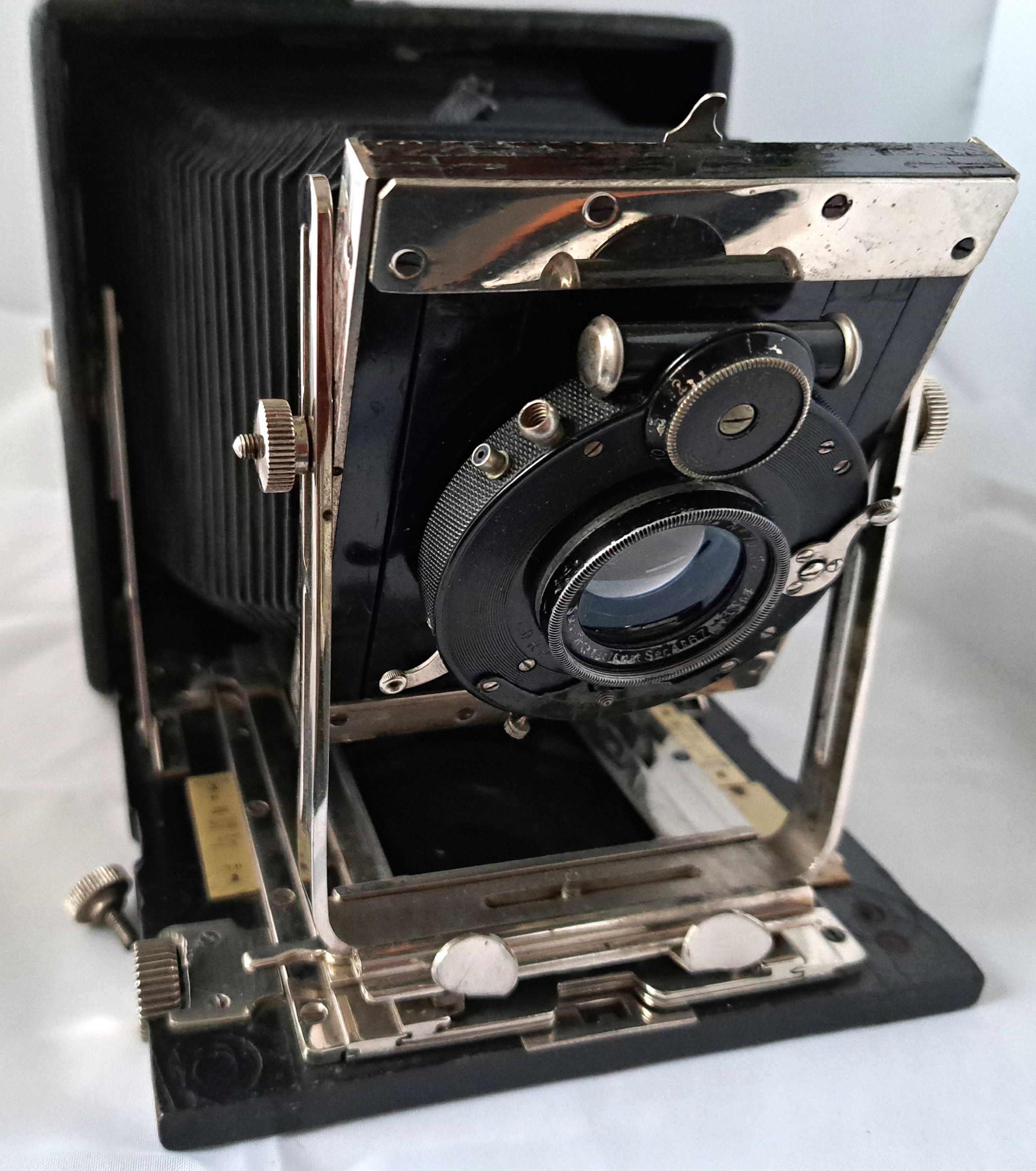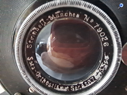 Das Objektiv ist von Steinheil Satz-Orthostigmat der Ser.A, Nr. 79026 327298, der Auto-Sektorenverschluss "Ibso" 371939 D.R.G.M. 1909. Der Blendenbereich liegt zwischen 6,7 und 50, die Brennweite beträgt 13,5 cm.