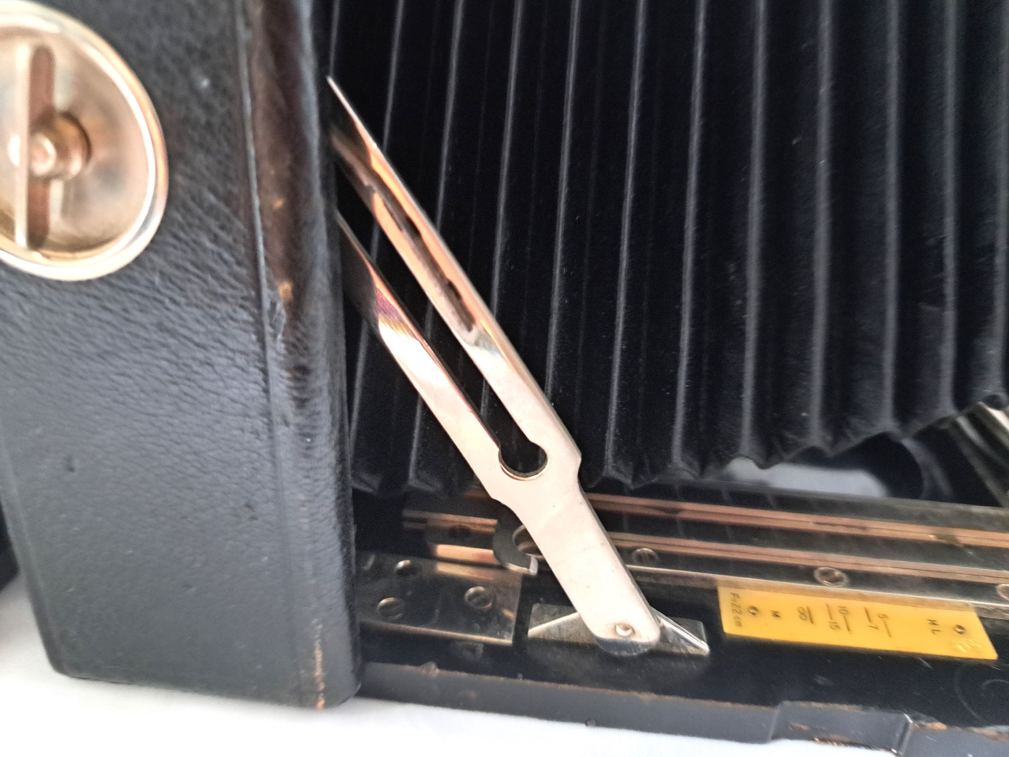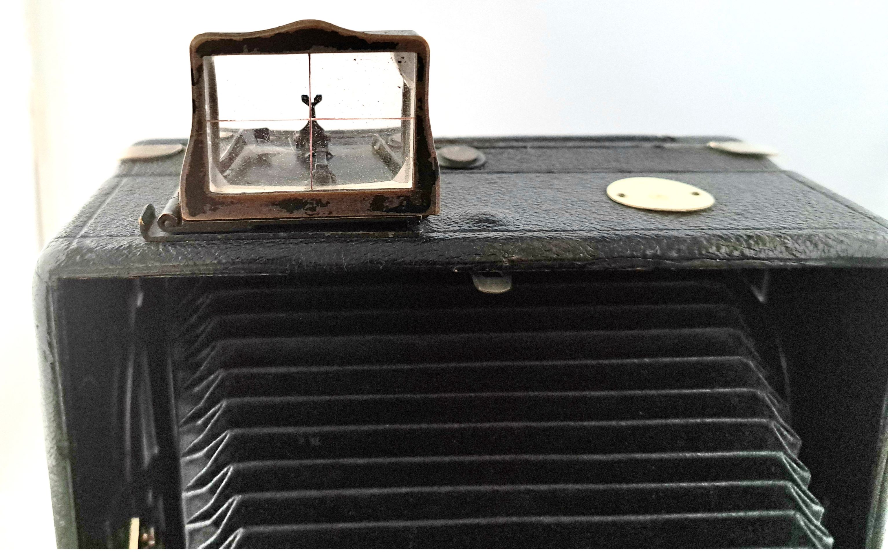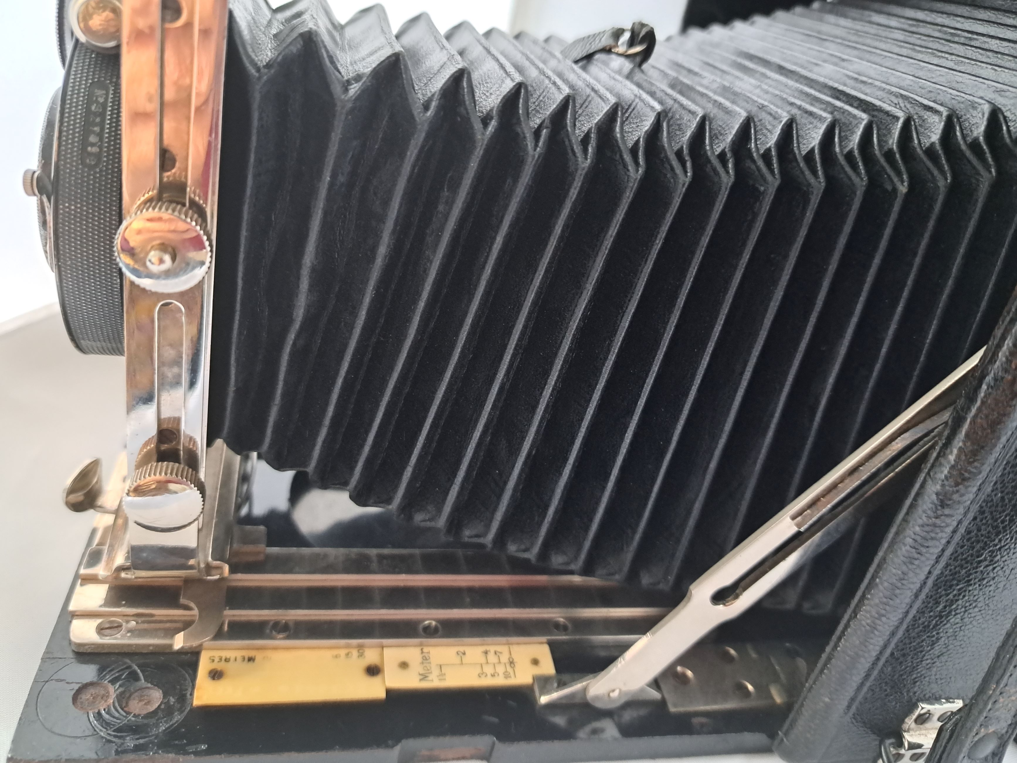 Der Balgen ist aus schwarzem Leder und hat einen dreifachen Auszug.