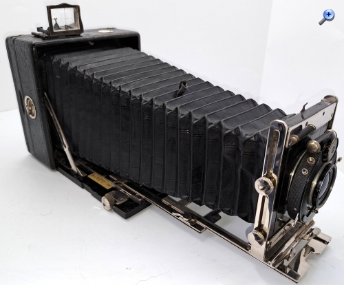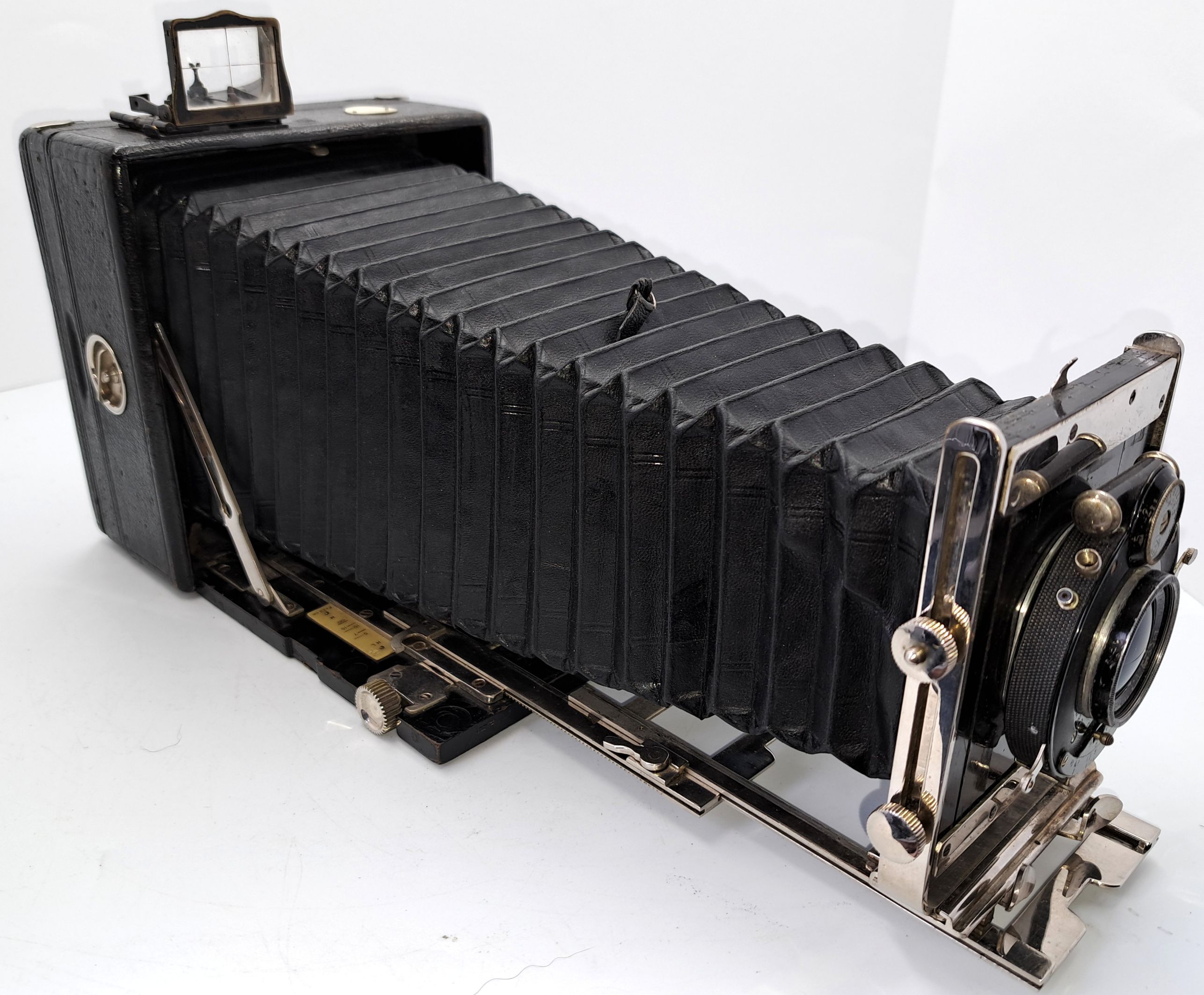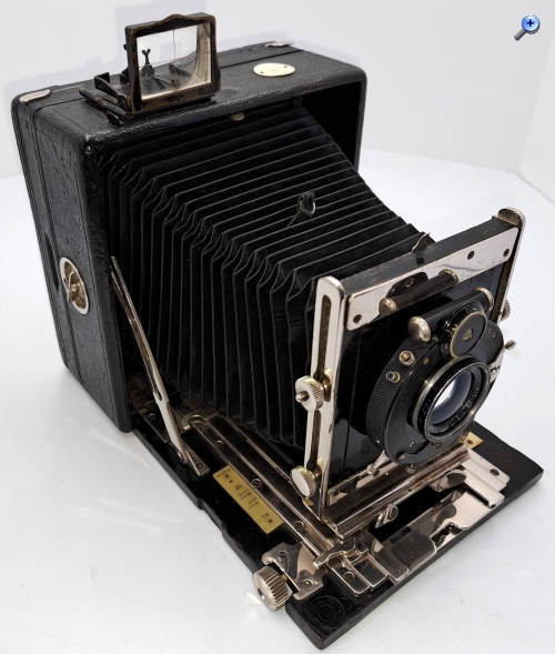 Das Objektiv ist von Steinheil Satz-Orthostigmat der Ser.A, Nr. 79026 327298, der Auto-Sektorenverschluss "Ibso" 371939 D.R.G.M. 1909 von Friedrich Deckel. Der Blendenbereich liegt zwischen 6,7 und 50, die Brennweite beträgt 13,5 cm.