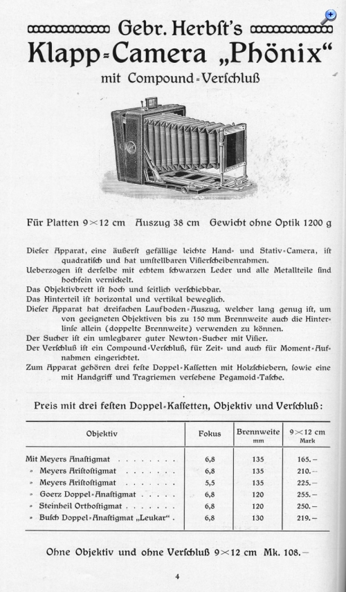 Hallo zusammen, heute möchte ich die Klapp-Camera "Phönix" von Steinheil/ Gebr. Herbst vorstellen. Sie stammt wahrscheinlich aus dem Jahr 1909/10. Ich möchte den Händler zitieren: "Eine etwas frühere Ausführung der Gebr. Herbst 1910 als Klapp-Camera "Phönix" im Katalog von Carl Amster und im Katalog von Steinheil als "Quadratische Universal-Hand-Camera" (Abbildungen 11 und 12)."