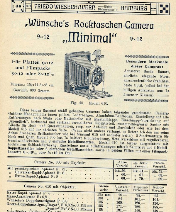 unter der treffenden Bezeichnung Minimal bot die Fa. Emil Wünsche Kameras in besonders flacher Bauart an, was zu Beginn des 20. Jahrhunderts offenbar als werbewirksamer Vorzug angesehen wurde. Dazu gehört auch das Modell Minimal 610, das hier vorgestellt werden soll.