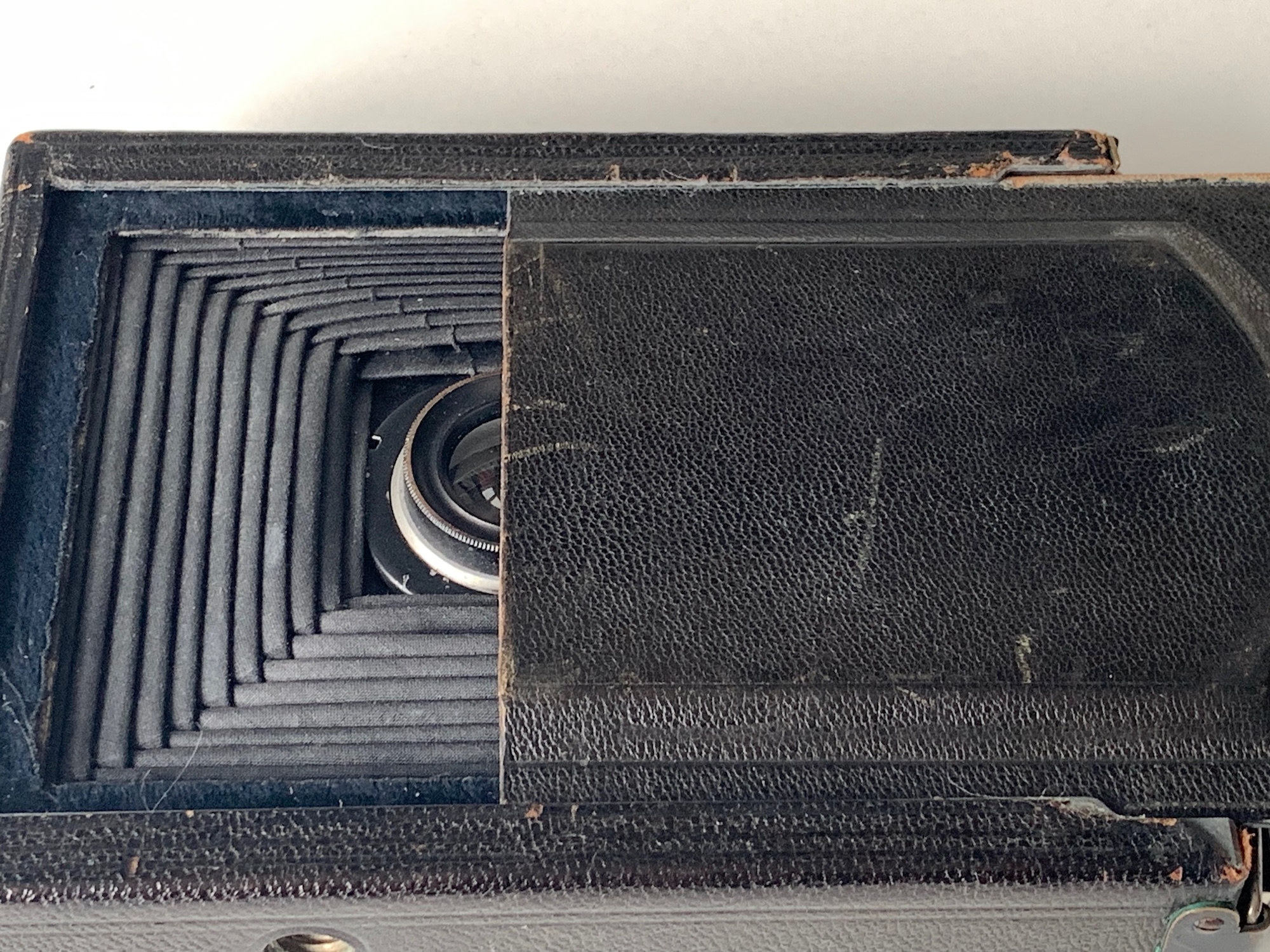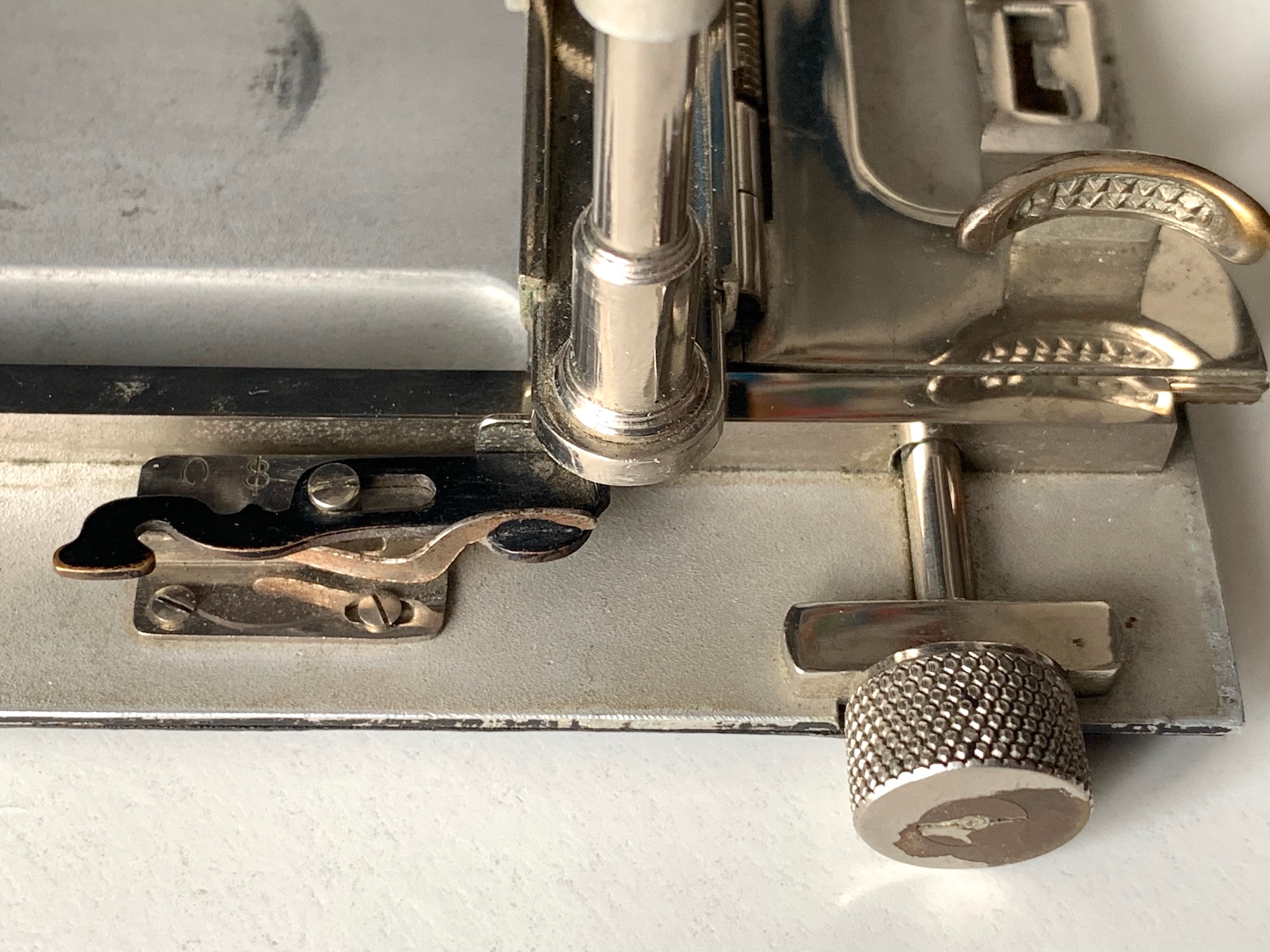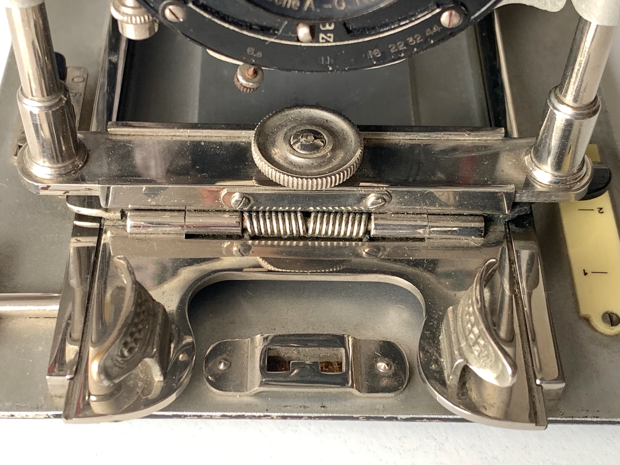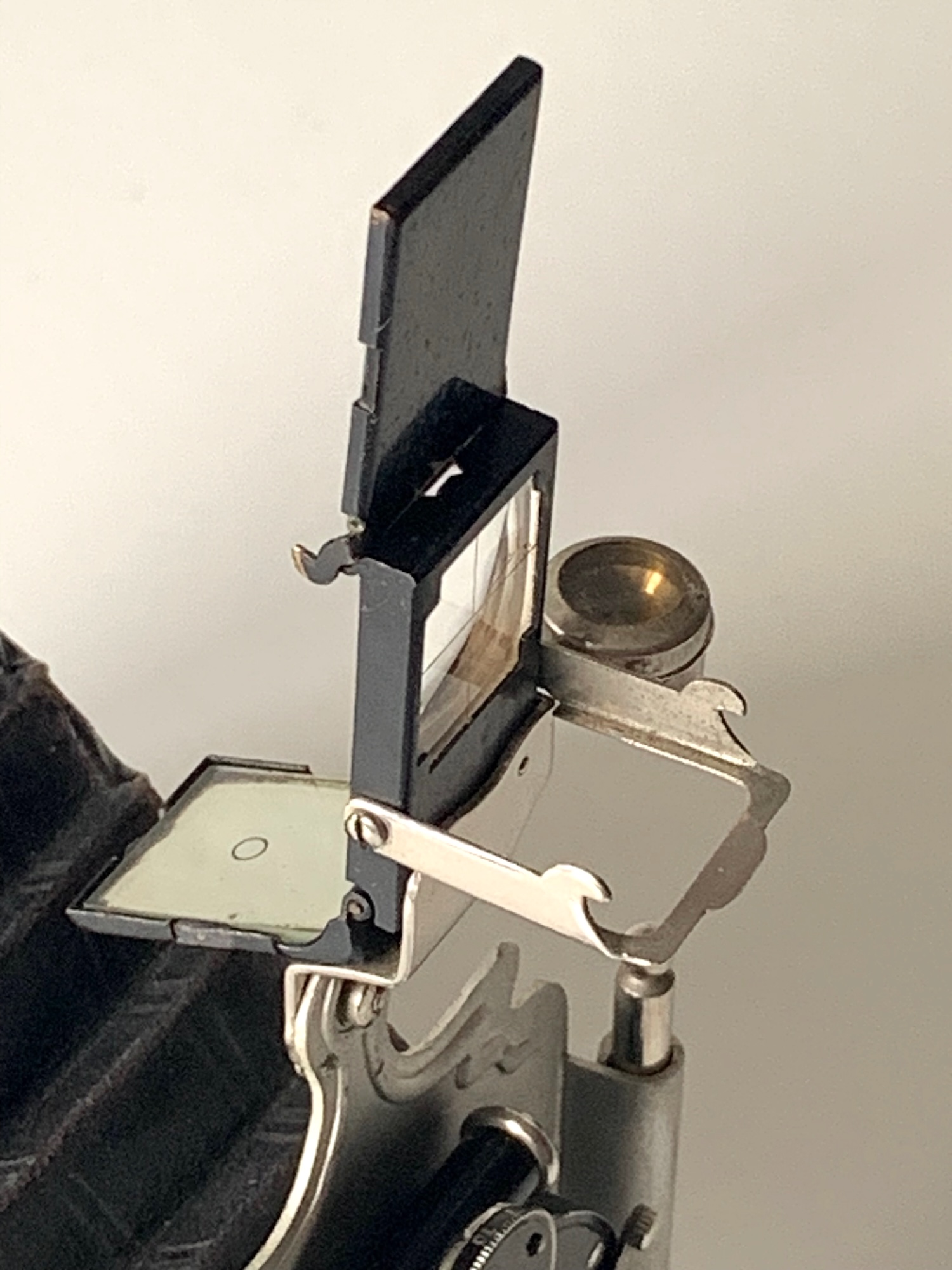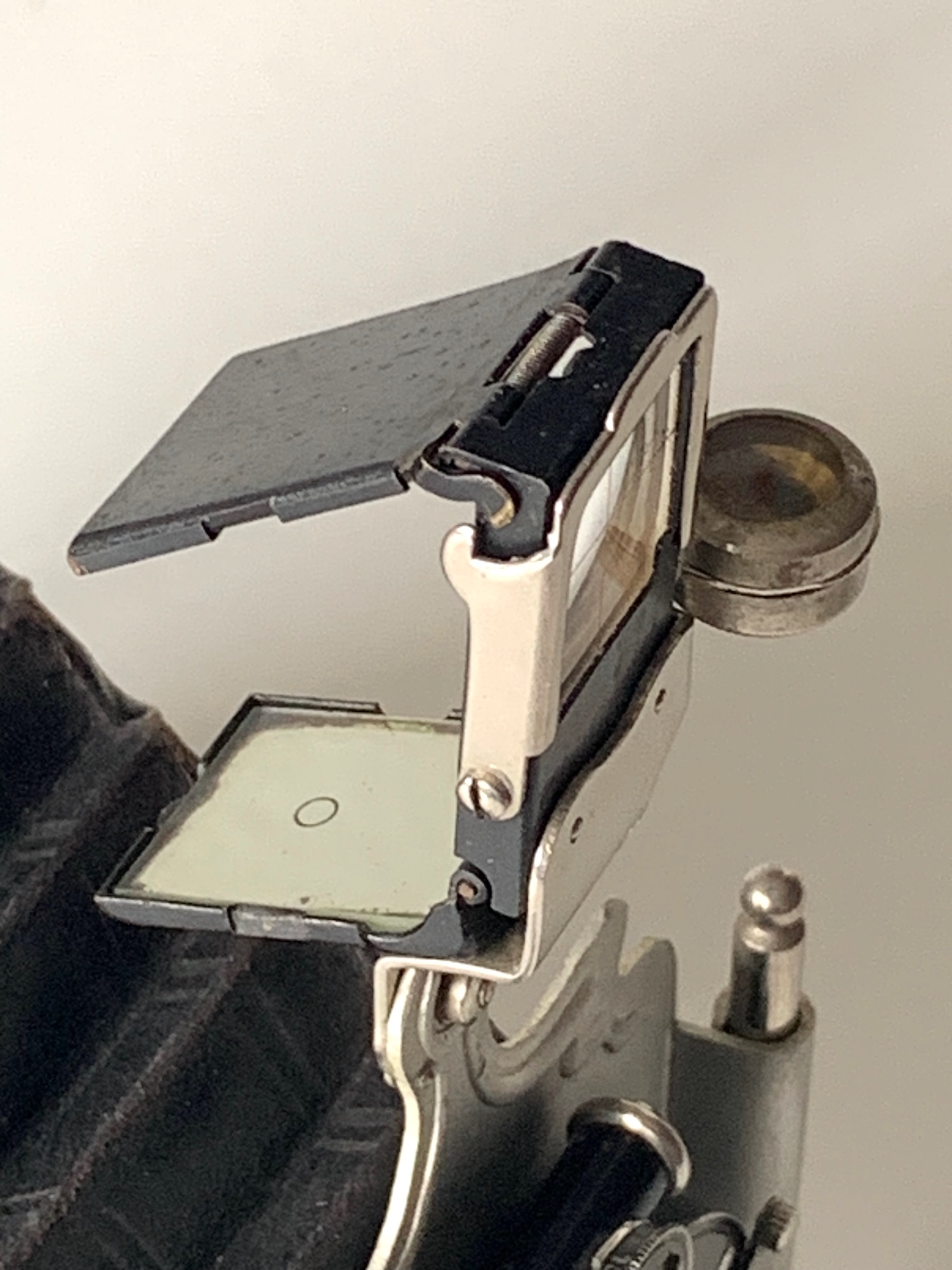 Dieser ungewöhnliche Sucher war auch für andere Wünsche-Modelle lieferbar; Sascha zeigt im Museum ein Exemplar einer Minimal 600 (--> https://blende-und-zeit.sirutor-und-comp...1&thread=93). Im erwähnten Katalog wird das vorliegende Modell mit diesem Sucher gezeigt, allerdings heißt es dazu: „Wenn nicht anders verlangt, so liefere ich den um seine Achse drehbaren Brillantsucher wie bei Minimal 615 auf nächster Seite“. Vermutlich war dieser Standard-Brillantsucher preiswerter in der Herstellung und weniger empfindlich. Rein technisch scheint mir dieser Patent-Newtonsucher überlegen zu sein; schade, dass er sich nicht durchgesetzt hat. Schon ins Ica-Programm hat er es nicht mehr geschafft, auch im Zubehörprogramm der frühen Kataloge finden sich nur gewöhnliche Newton- und Brillantsucher.