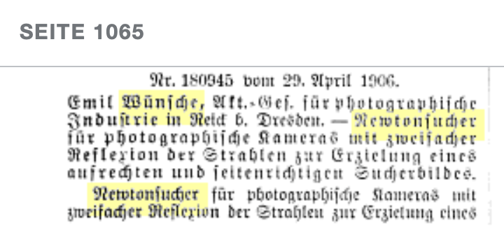 Für diesen „Newtonsucher für photographische Kameras mit zweifacher Reflexion der Strahlen zur Erzielung eines aufrechten und seitenrichtigen Sucherbildes“ hatte die Wünsche AG im April 1906 unter der Nr. 180945 ein Patent eintragen lassen, wie man im Jahrgang 1907 der Auszüge aus den Patentschriften erfährt.