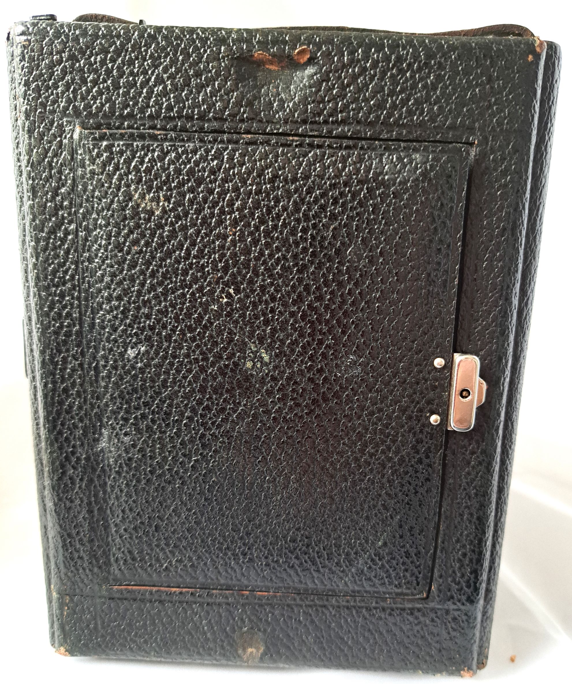 Insgesamt macht die Kamera einen wertigen Eindruck, hat aber keinerlei Hinweise auf den Hersteller. Das hochformatige Gehäuse ist aus beledertem Holz, Laufboden ist aus Metall (glaube nicht, dass es Alu ist, da die Kamera mir relativ schwer vorkommt) - schwarz lackiert und mit Leder bezogen. Die Standarte ist U-förmig aus einem Stück gegossen, mit Rändelschrauben über Spindeln höhen- und seitenverstellbar. Die Kamera verfügt über einen Brillant-, einen Rahmensucher und einen Visiersucher?