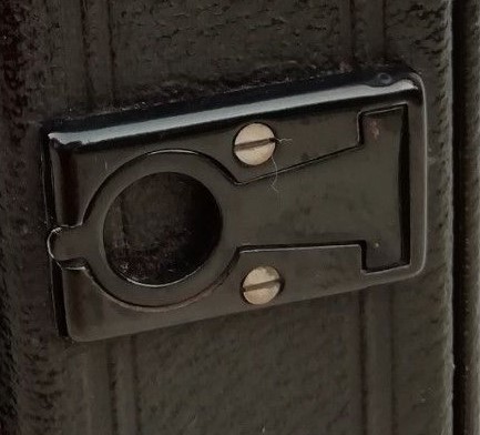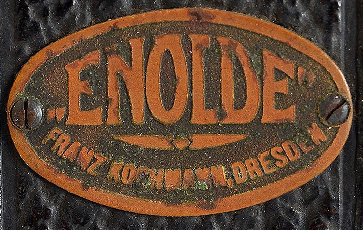 Dies ist ein typische 9x12 Enolde von Kochmann, man sieht, sie besitzt ins Gehäuse von oben her eingeschraubte Griffaufhängungen (was bei Metallgehäusen typisch ist):