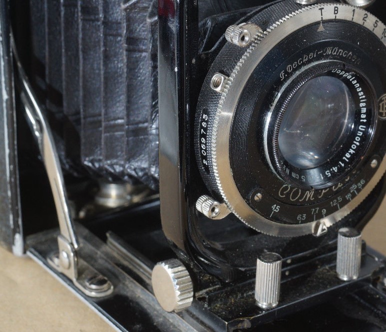 Das Objektiv, d.h. die Linse stammt von Leitmeyer Doppel Anastigmat Syter, 1:4,5 und F=135 mm, das Objektiv mit Compur Verschluss Nr. 960673 und D.R.P. Nr. 258646 - 1913