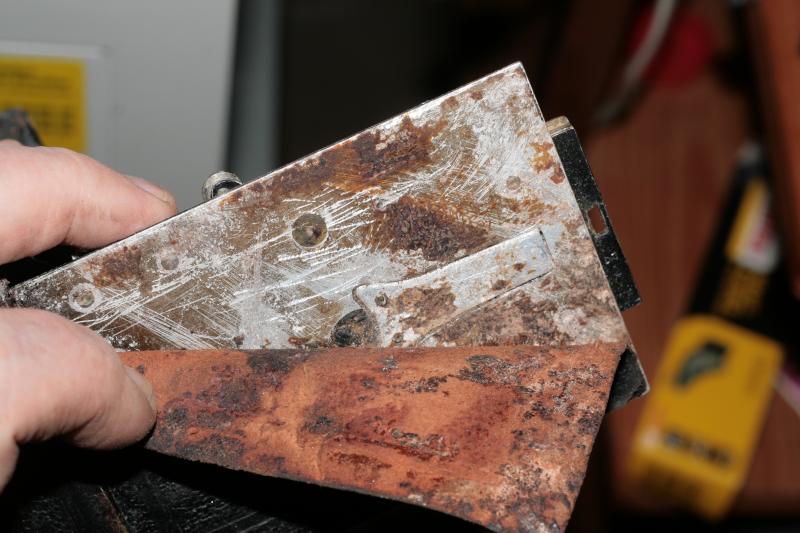Meine Contessa-Nettel Alino, eine 6x9-Laufboden- und Plattenkamera, war leider derart rostig (dieser weiße NE-Metall-, hier Alu-Rost), daß ich mich bemüßigt sah, das Leder unter dem Laufboden abzunehmen. Was ich sah, hat mich erstmal schon etwas verblüfft: