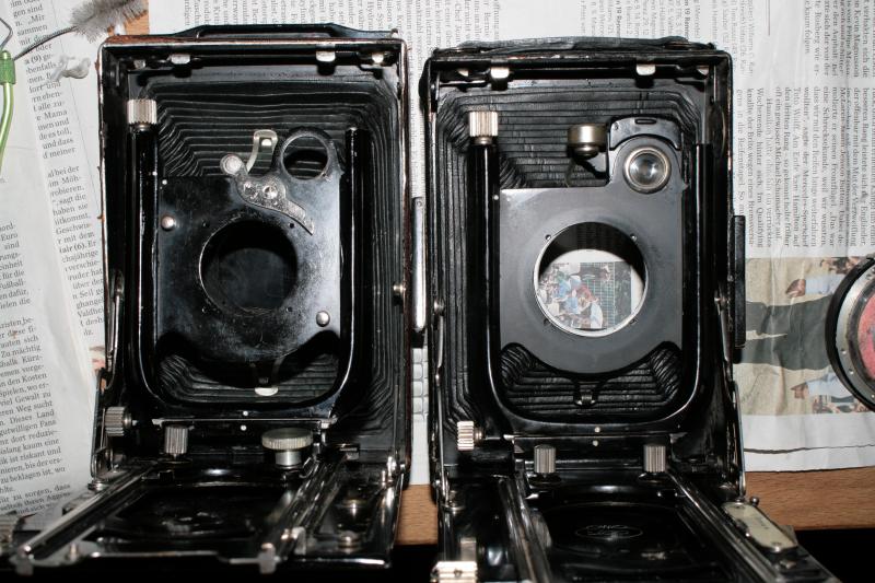 Für die Trona 210 mit Tessar 4.5/135 bohrte man das Objektivblech deshalb ein wenig auf und verzichtete auf Bajonett und damit auf Objektivwechsel. Zum Vergleich: links die Leiche einer Trona 210 mit Bajonett, rechts eine Trona 210 für Tessar 4.5/135