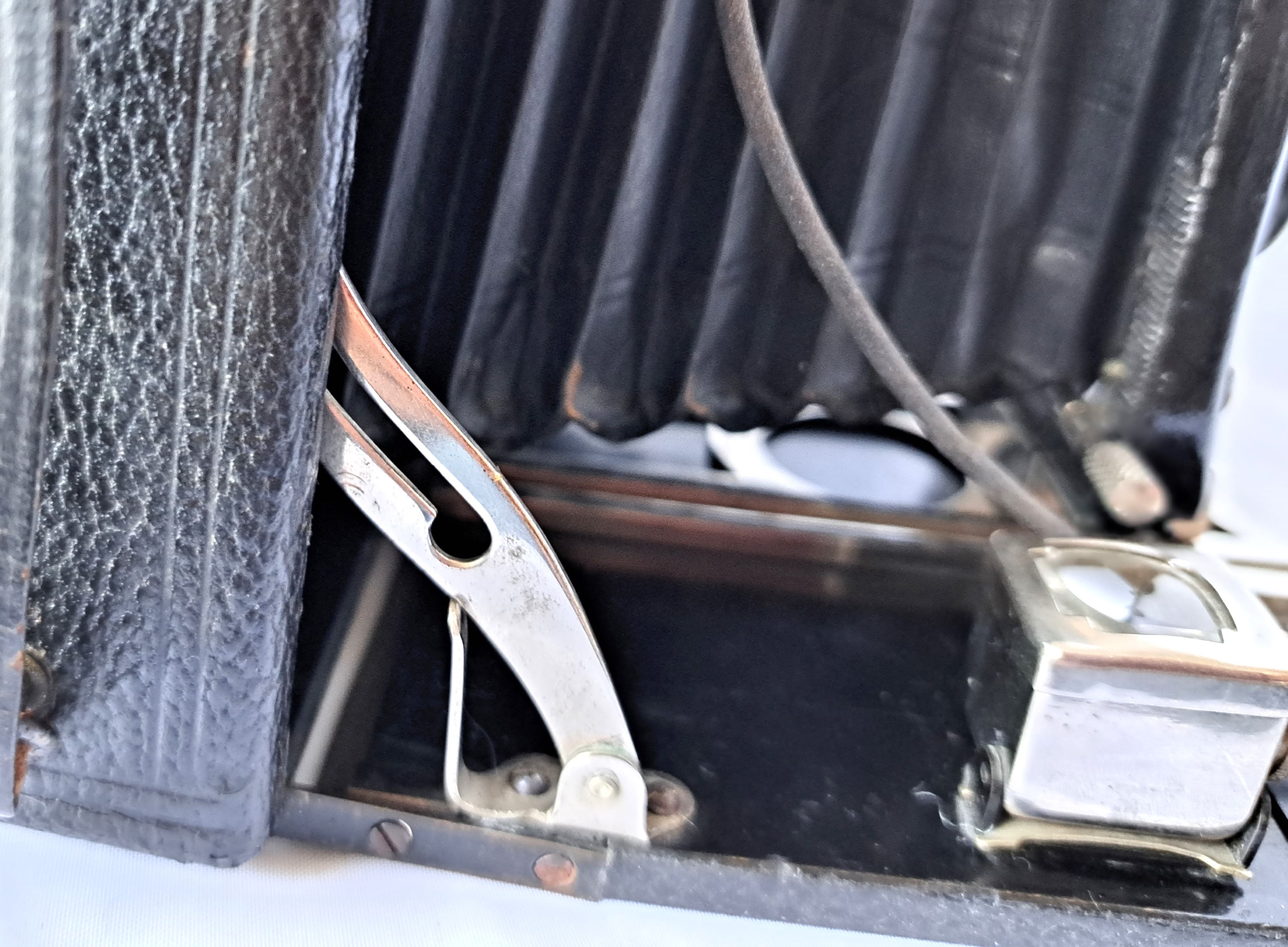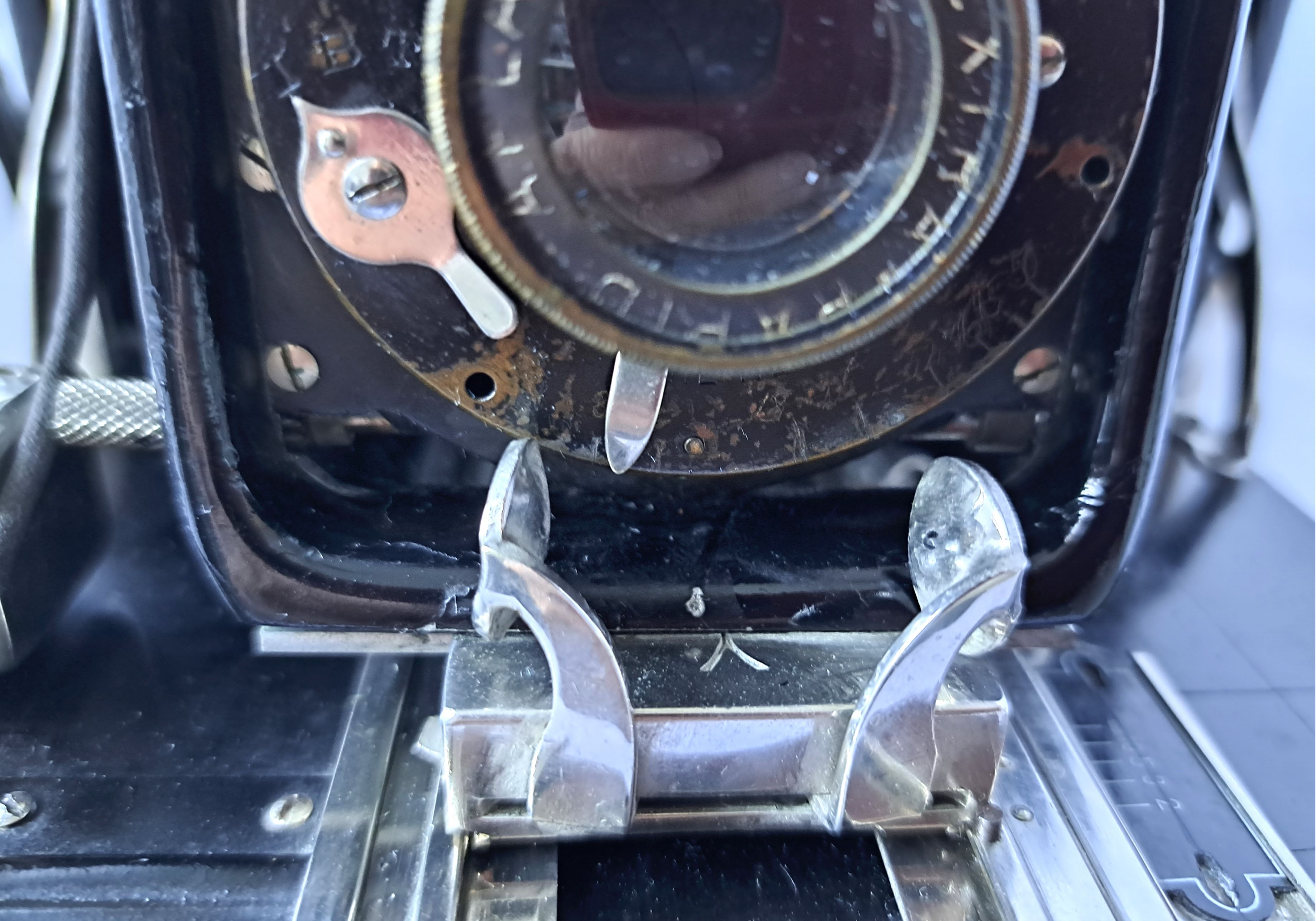 Bei der oberen Bohrung befand sich eventuell die Befestigung für den ursprünglich vorhanden originalen Drahtauslöser mit Zugdraht? Der aktuell vorhandene Drahtauslöseranschluss wurde sicherlich nachträglich montiert. Bei den zwei vorhandenen ungenutzten Schrauben war vielleicht mal ein Kolben befestigt?