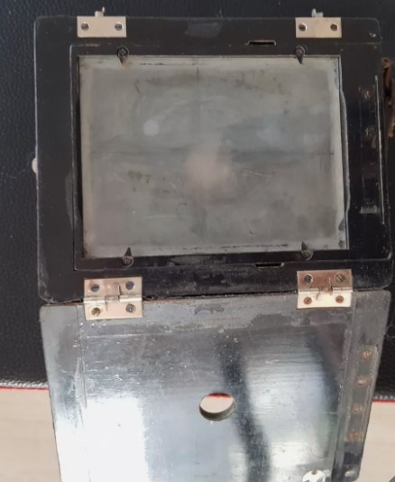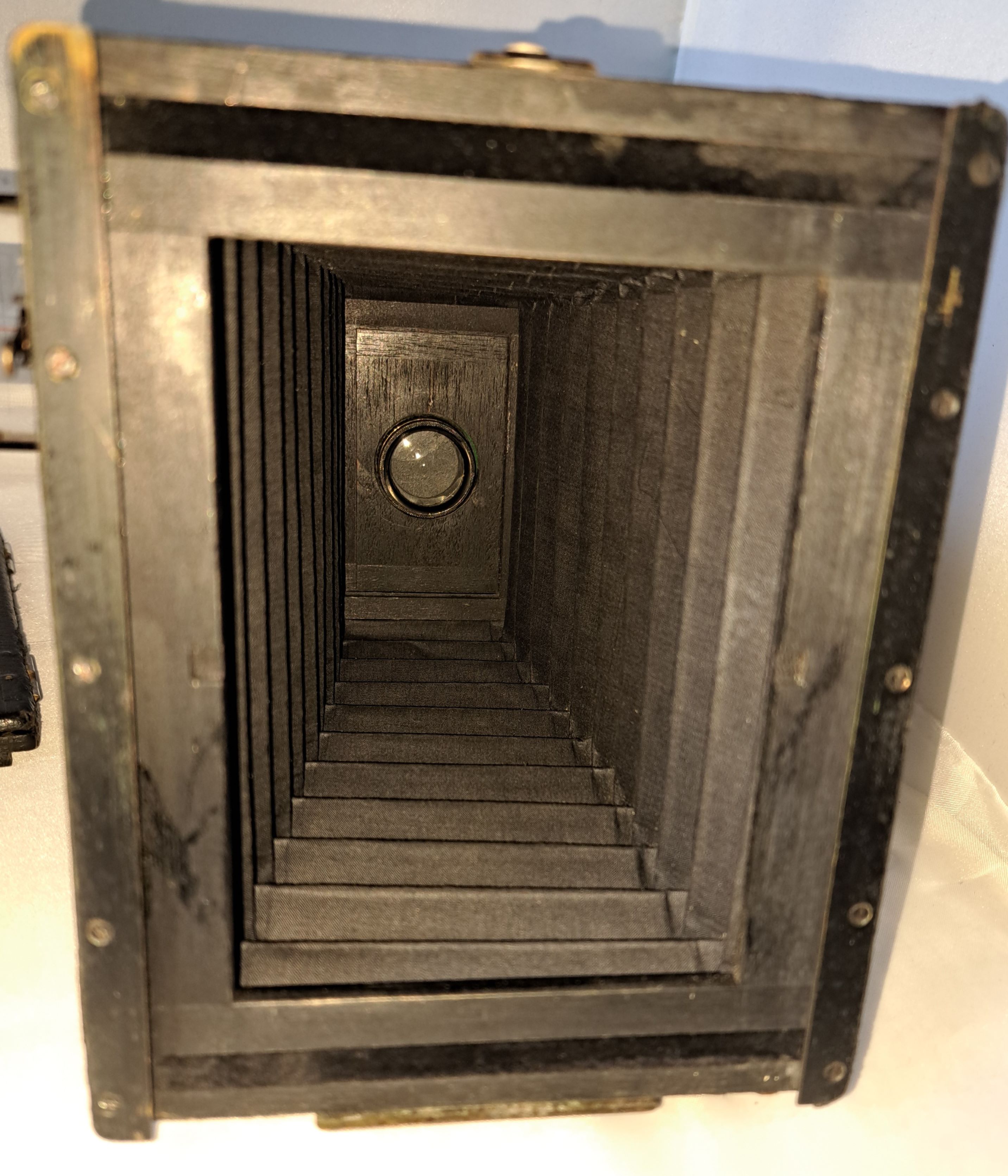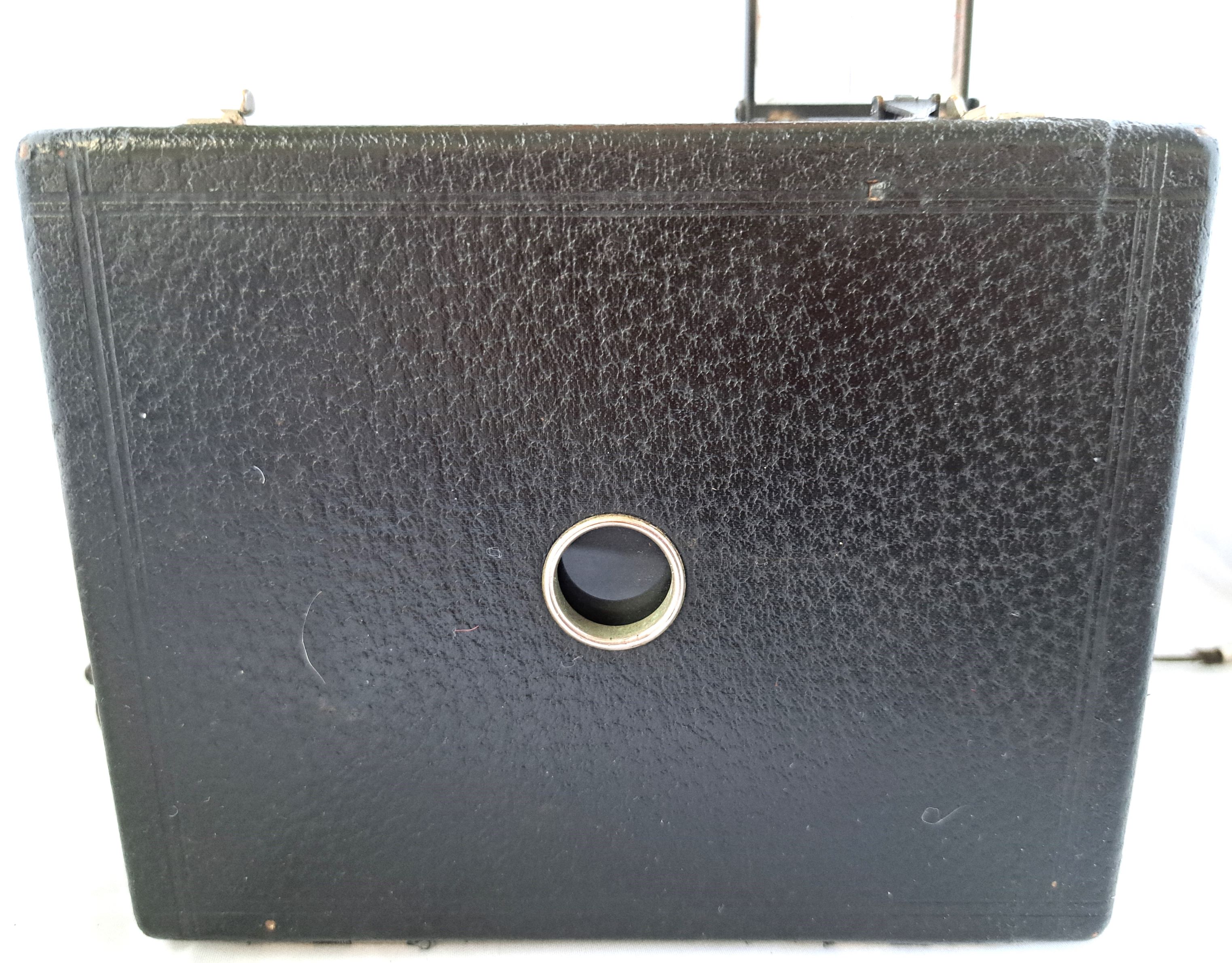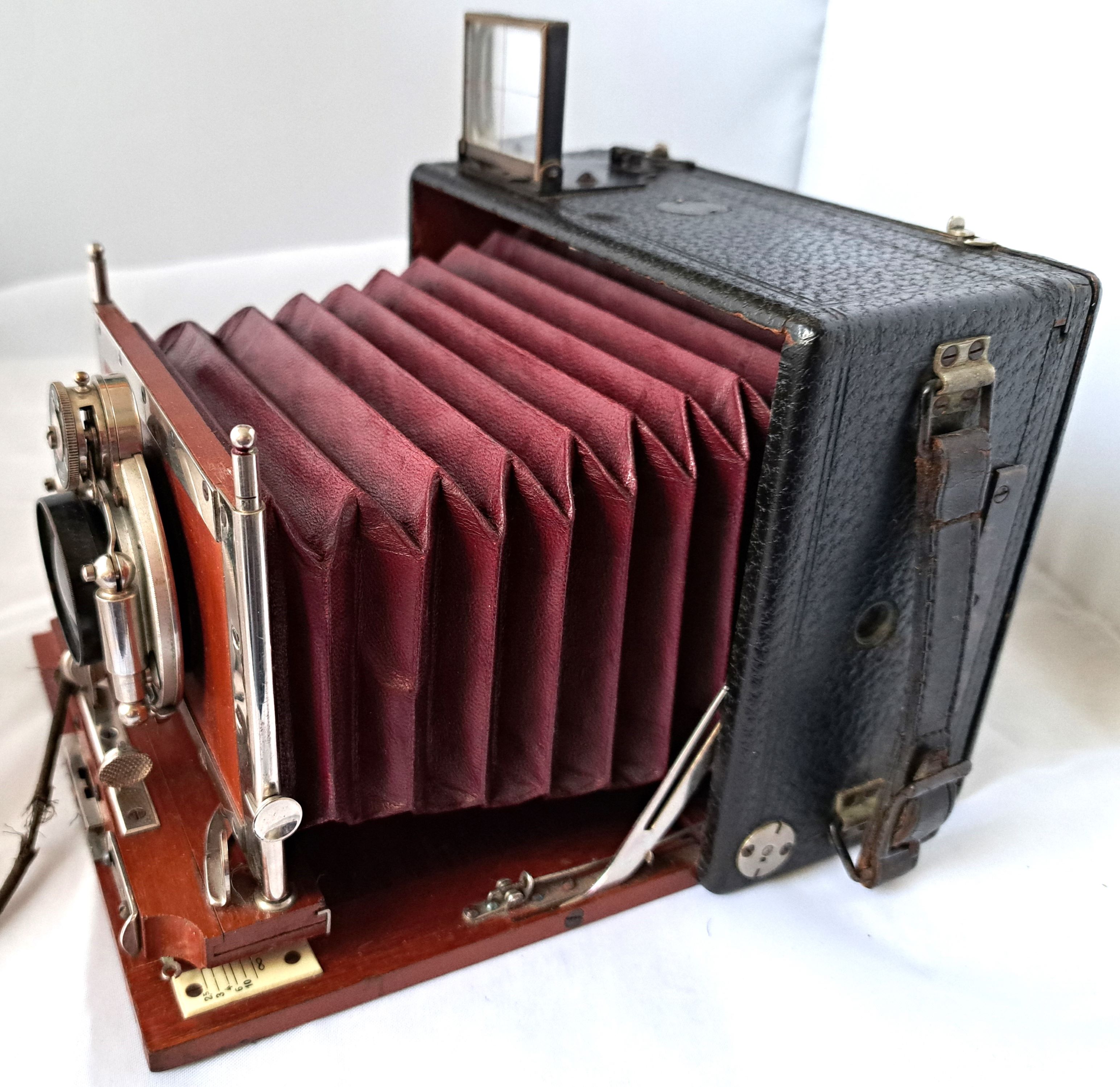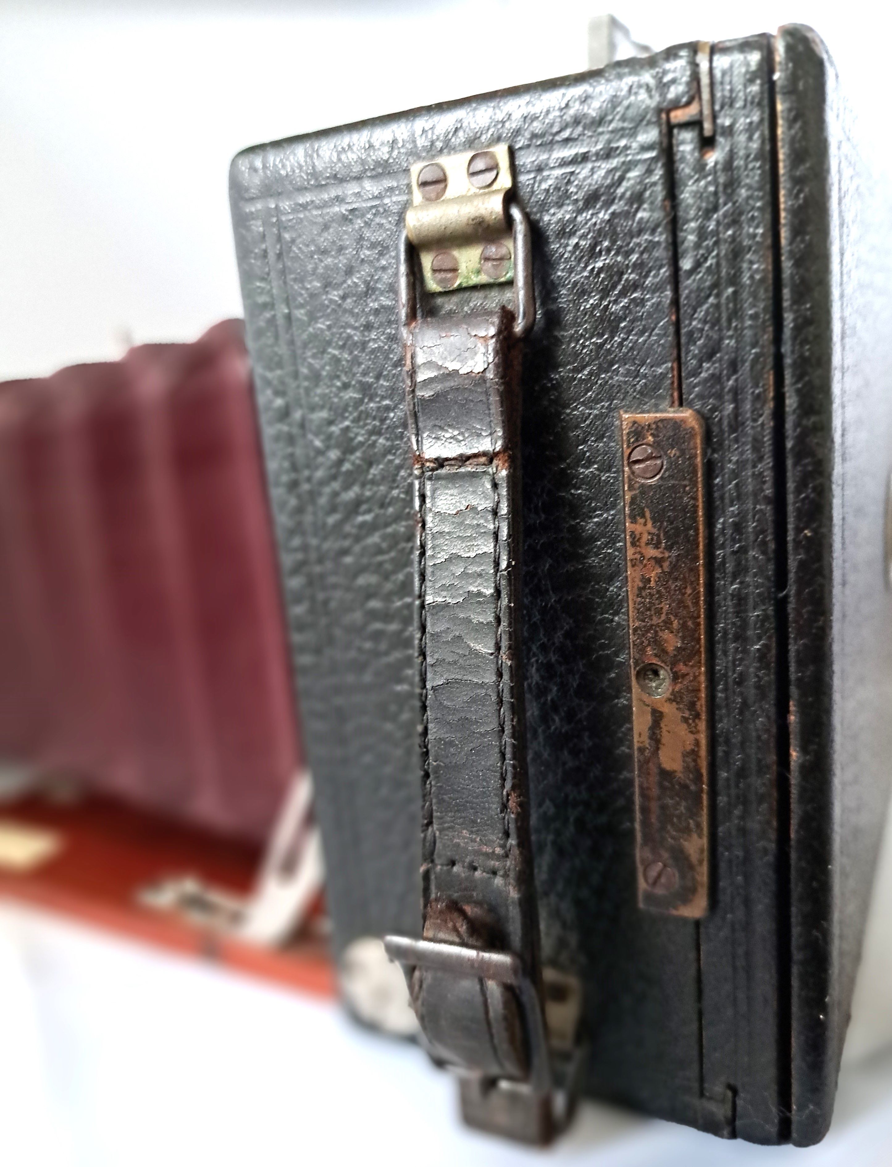 Der Balgen ist aus rotem Leder und noch dicht. Die belederte Rückwand enthält eine Sichtöffnung wie bei einer Rollfilmkamera.