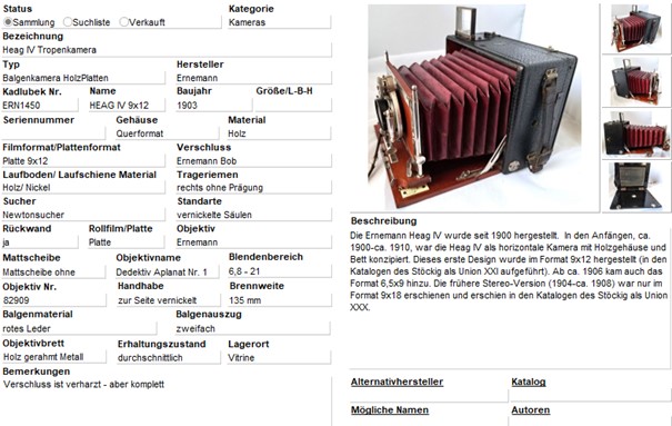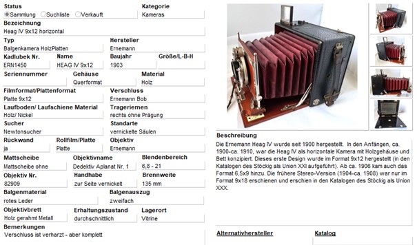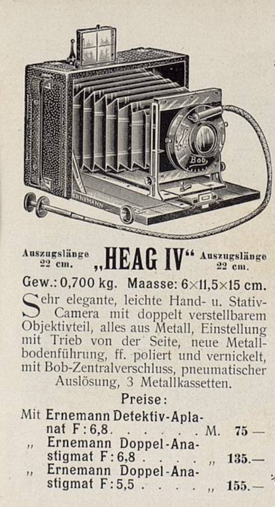 Die Heag IV im Querformat 9 x 12 der Firma Ernemann stammt aus dem Jahr 1904. Sie wird bei Kadlubeks unter ERN1450 als HEAG IV 9x12 gelistet.