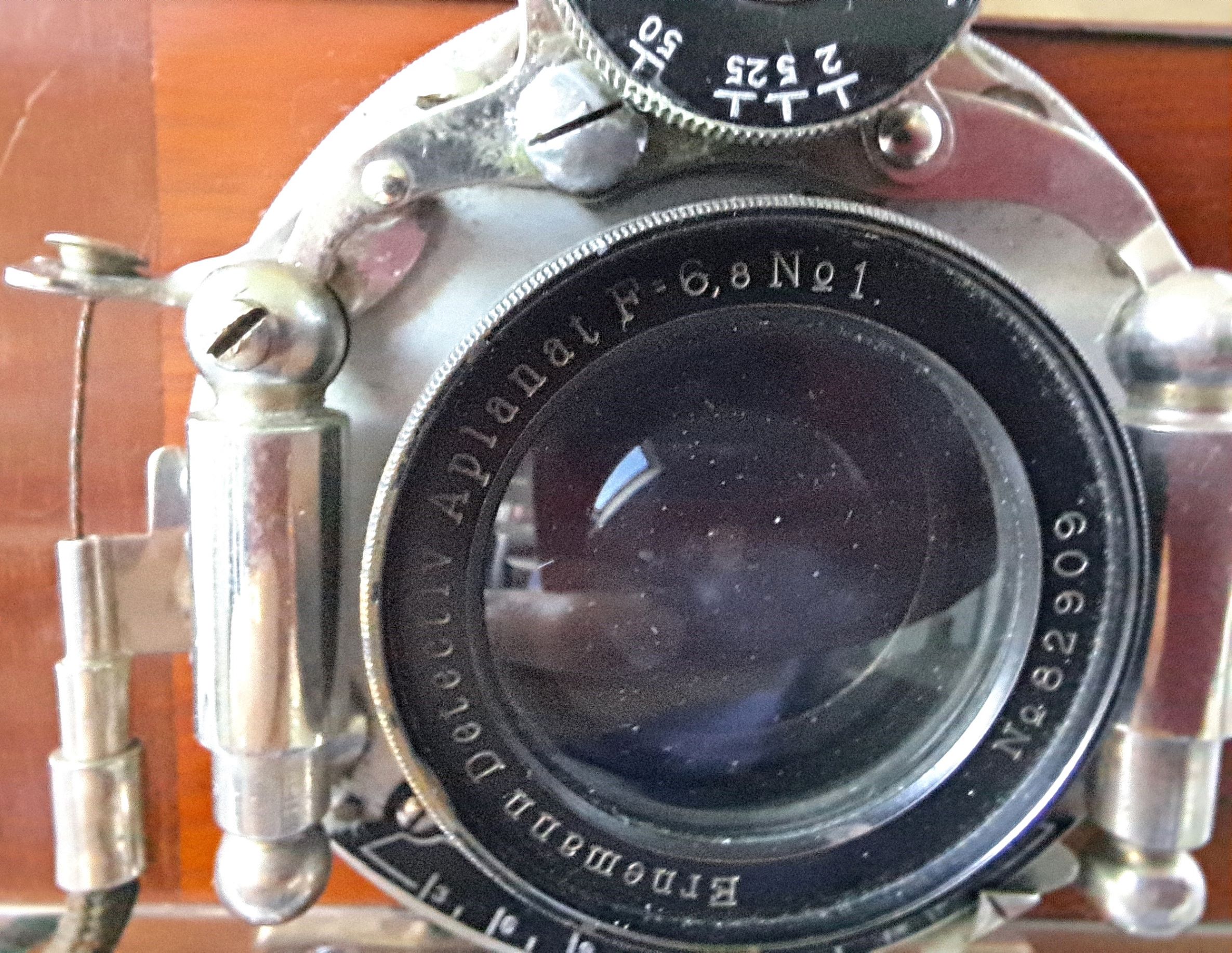 Das Objektiv mit Detektiv – Aplanat № 1 stammt von Ernemann mit der Nummer 82909 und hat einen Ernemann Bob-Verschluss.