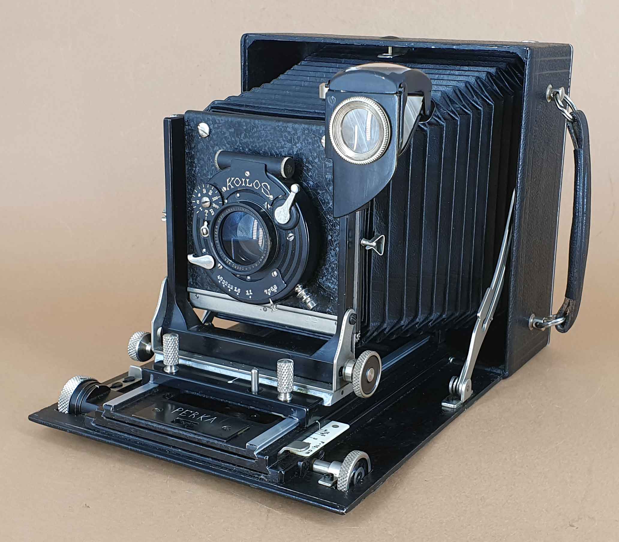 Auch die Bestückung mit Verschluss und Objektiv passt nicht zur Herstellungszeit der Kamera. Der Koilos-Verschluss und das Goerz-Berlin Serie III Dagor 6.8/15 cm können etwa in die Zeit um 1912 datiert werden, wohingegen die Kamera selbst um 1930 datiert.