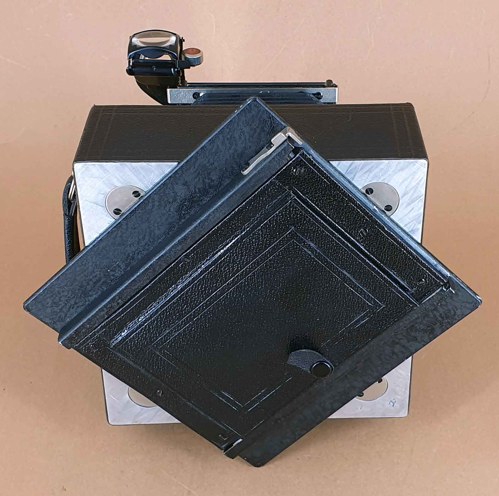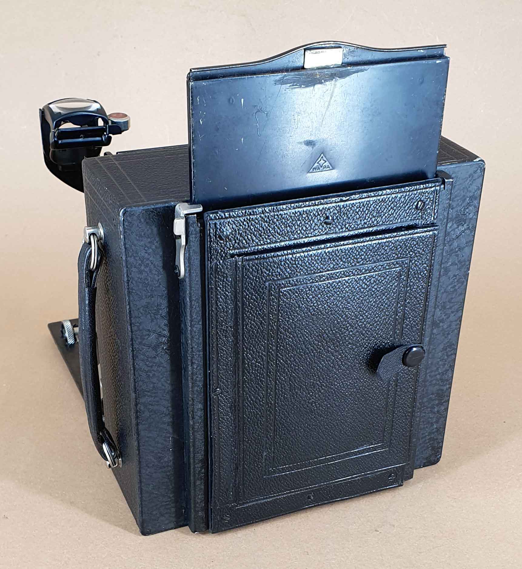 Zum Einschieben einer Plattenkassette muss das federnd gelagerte Mattscheibenrückteil nicht entfernt werden. Es wird einfach nach hinten geschoben (wie bereits bei der Perka Modell II beschrieben).
