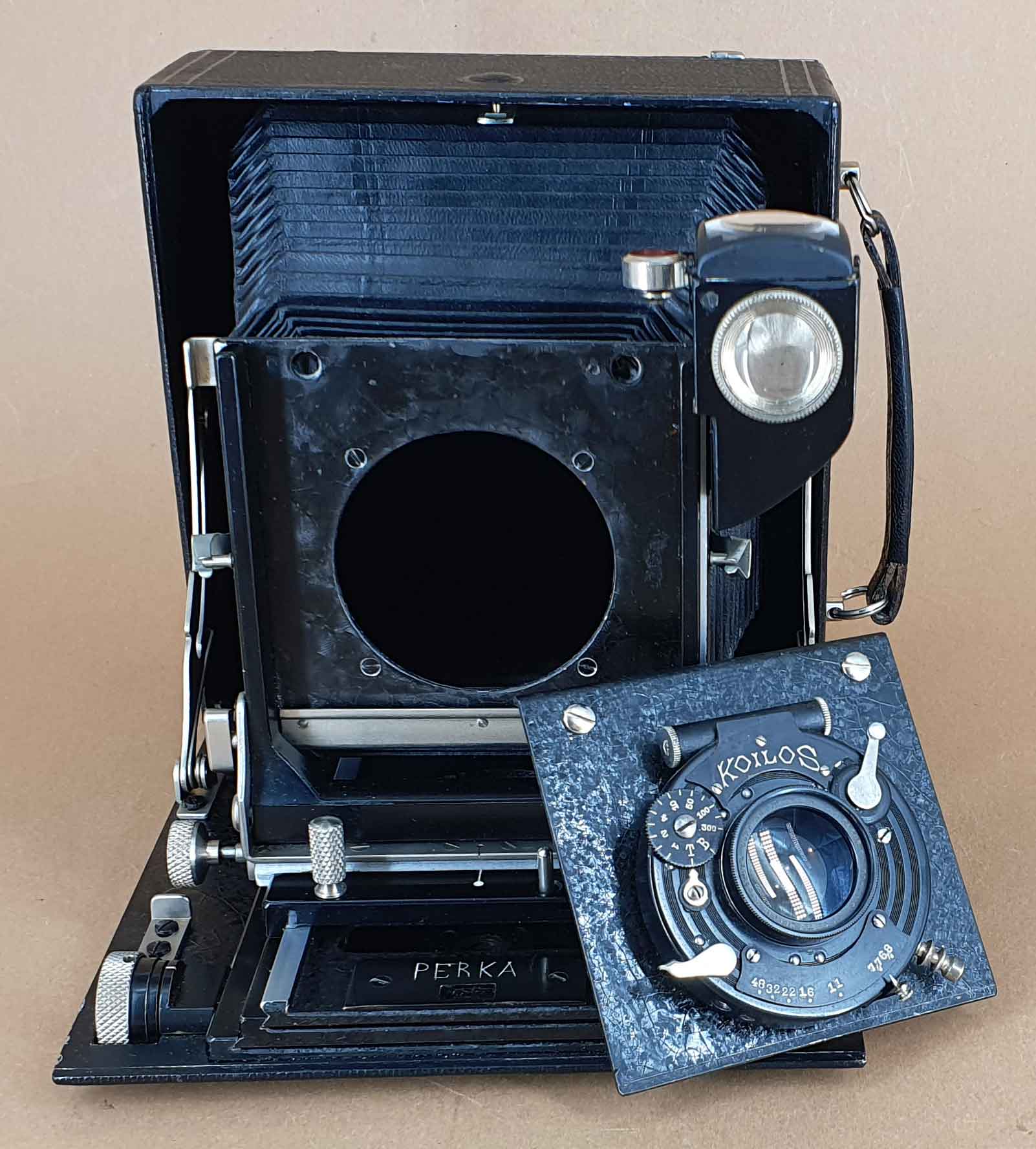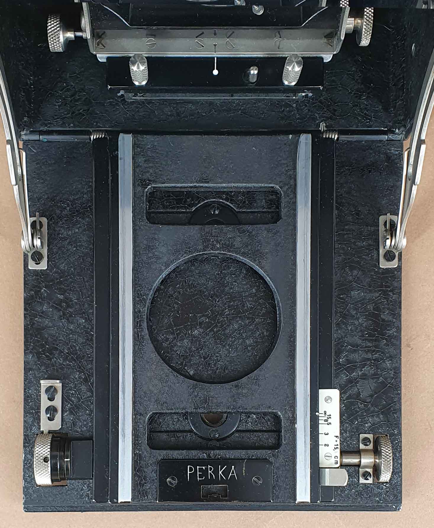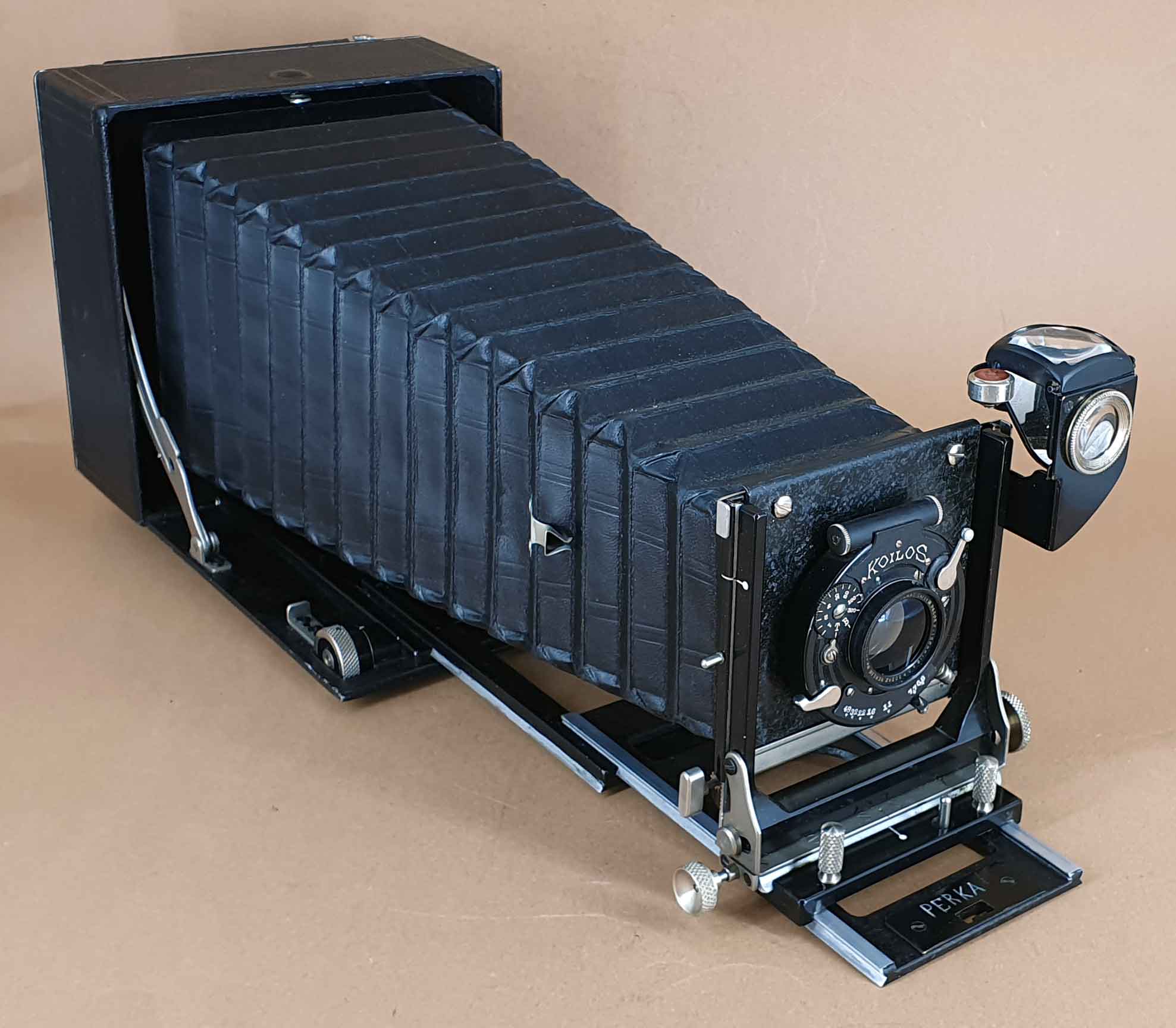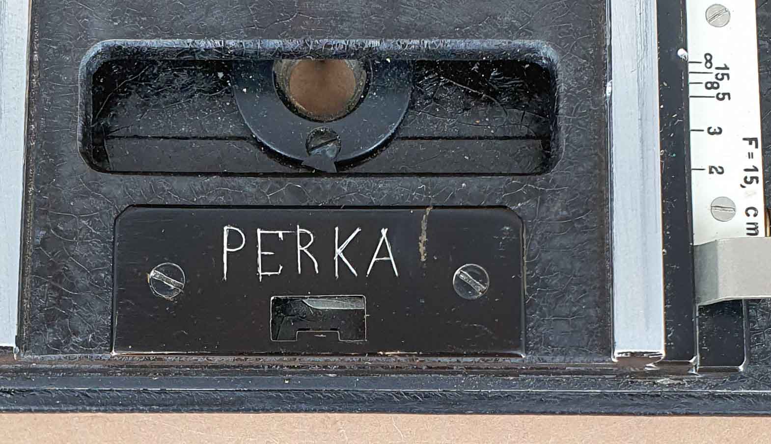 Alle Perka Modell I Kameras waren ursprünglich mit einem außenliegenden Newton-Klappsucher ausgestattet. Dies änderte sich ca. 1929, als statt des Newton-Suchers nun standartmäßig ein Drahtrahmensucher mit Visier verbaut wurde. Etwa zur selben Zeit erhielten die Perkas auch eine veränderte Griffbefestigung, wie sie das vorliegende Exemplar besitzt. Die hier gezeigte Kamera hat einen fest verbauten Brillantsucher mit Libelle und ist die einzige mir bekannte Perka Modell I Kamera, die offensichtlich werksmäßig mit einem Brillantsucher versehen wurde. Es sind auch keinerlei Spuren eines späteren Umbaus erkennbar. Der Sucher ist nicht die einzige Eigenheit dieses Exemplars. Die Kamera war ursprünglich unbezeichnet, der Schriftzug „Perka“ wurde erst nachträglich eingeritzt. Weiterhin ist die Perka-typische Trommelskala bei diesem Exemplar unbeschriftet. Stattdessen wurde eine ‚normale‘ Skala passend zur Objektivausstattung (Brennweite 15 cm) verbaut.