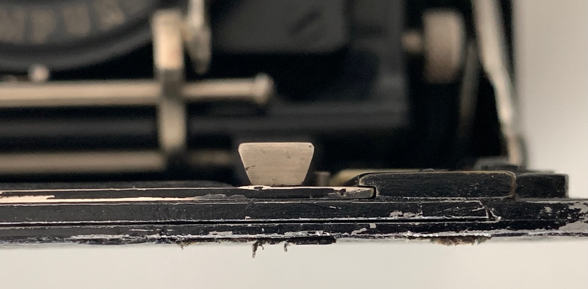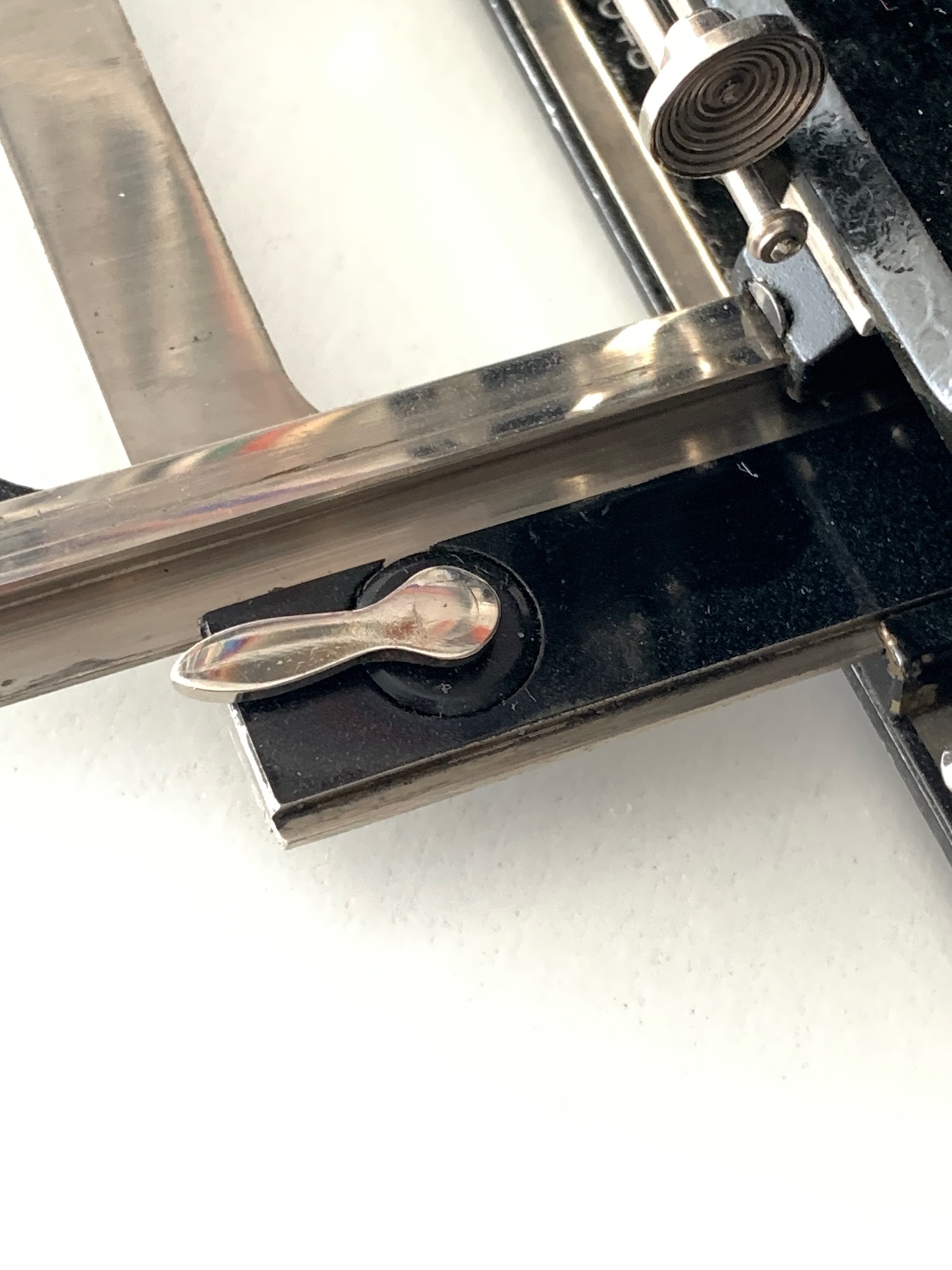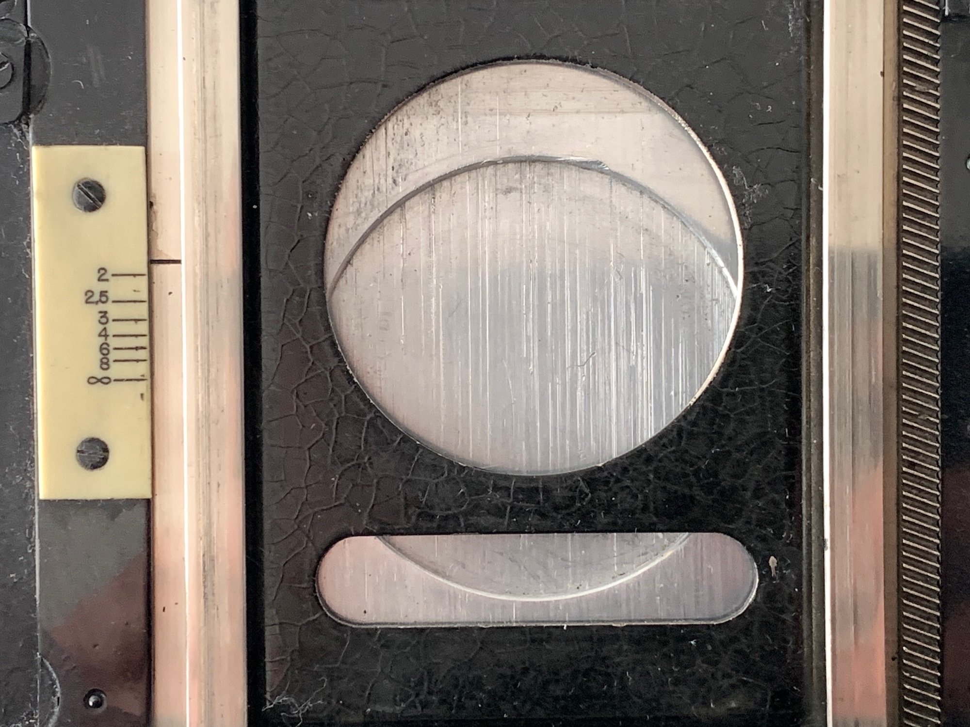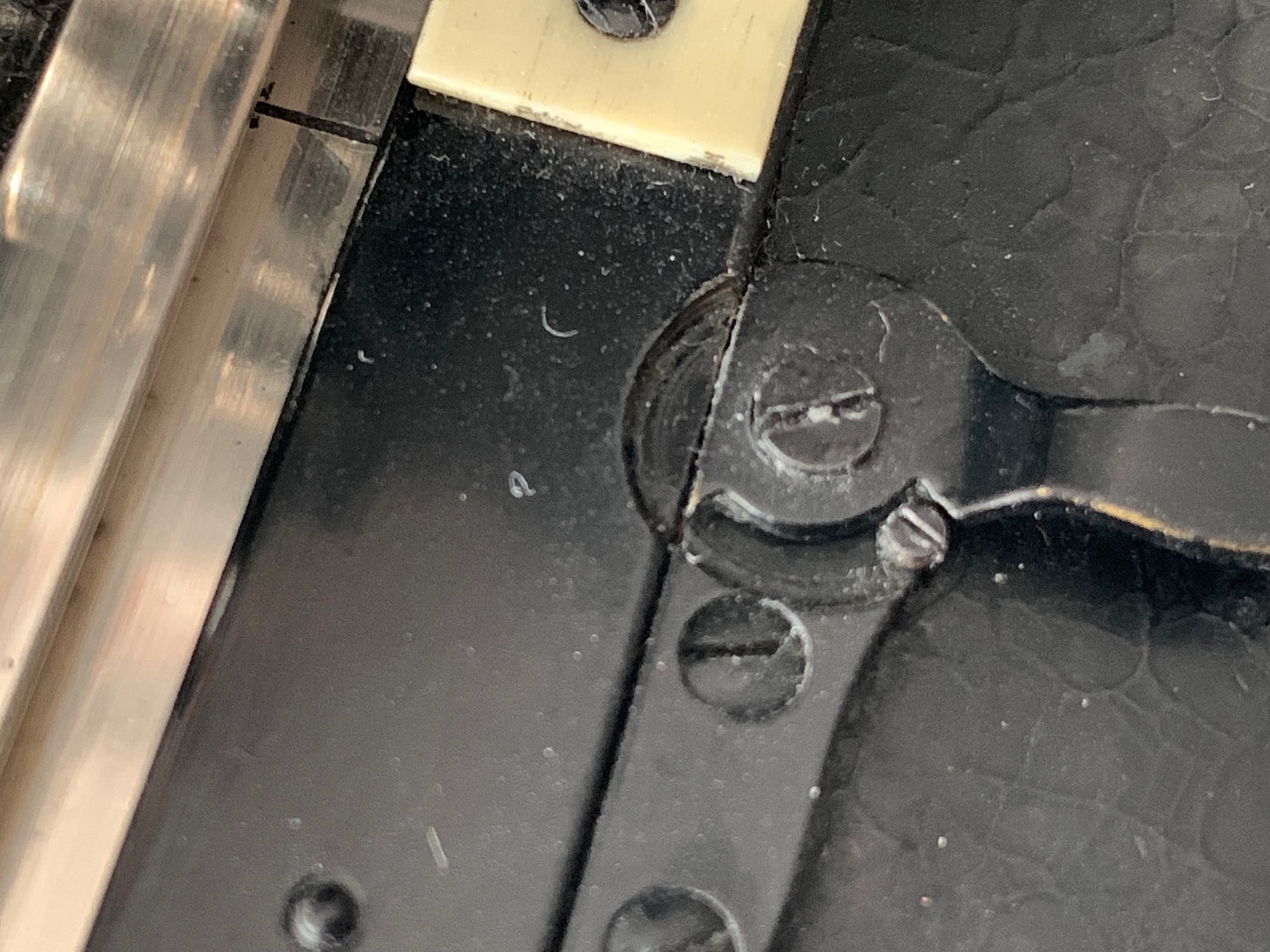 Das Problem: Auch wenn die Entriegelungen herausgedreht sind, lässt sich das Segment nicht bewegen. Von vorn sieht man die einzelnen Segmente übereinander. Mit einer dünnen Klinge kann man dazwischenfahren, die Teile sind nicht miteinander verklebt, es ist auch nichts verzogen. Mir ist aber auch nicht klar, was genau sich bewegen solle. Eigentlich müsste das obere Element mit der Entfernungsskala herausfahren, denn dort greifen die Sperren ein. Vor vorn scheint es, als gebe es ein darunter liegendes dünneres Stück.
