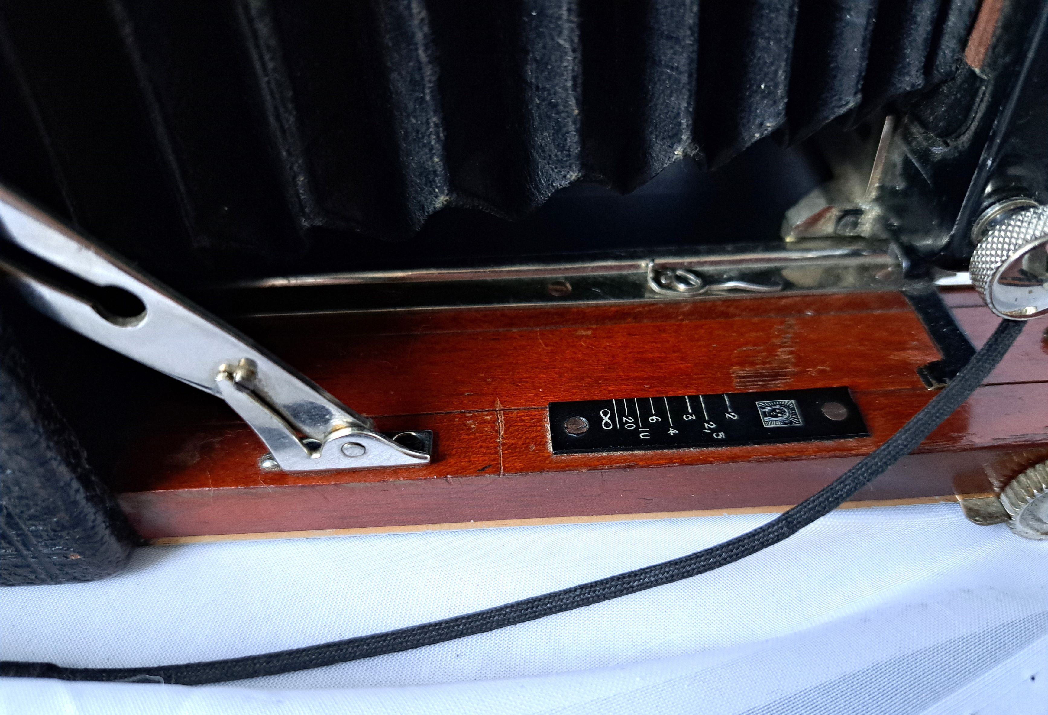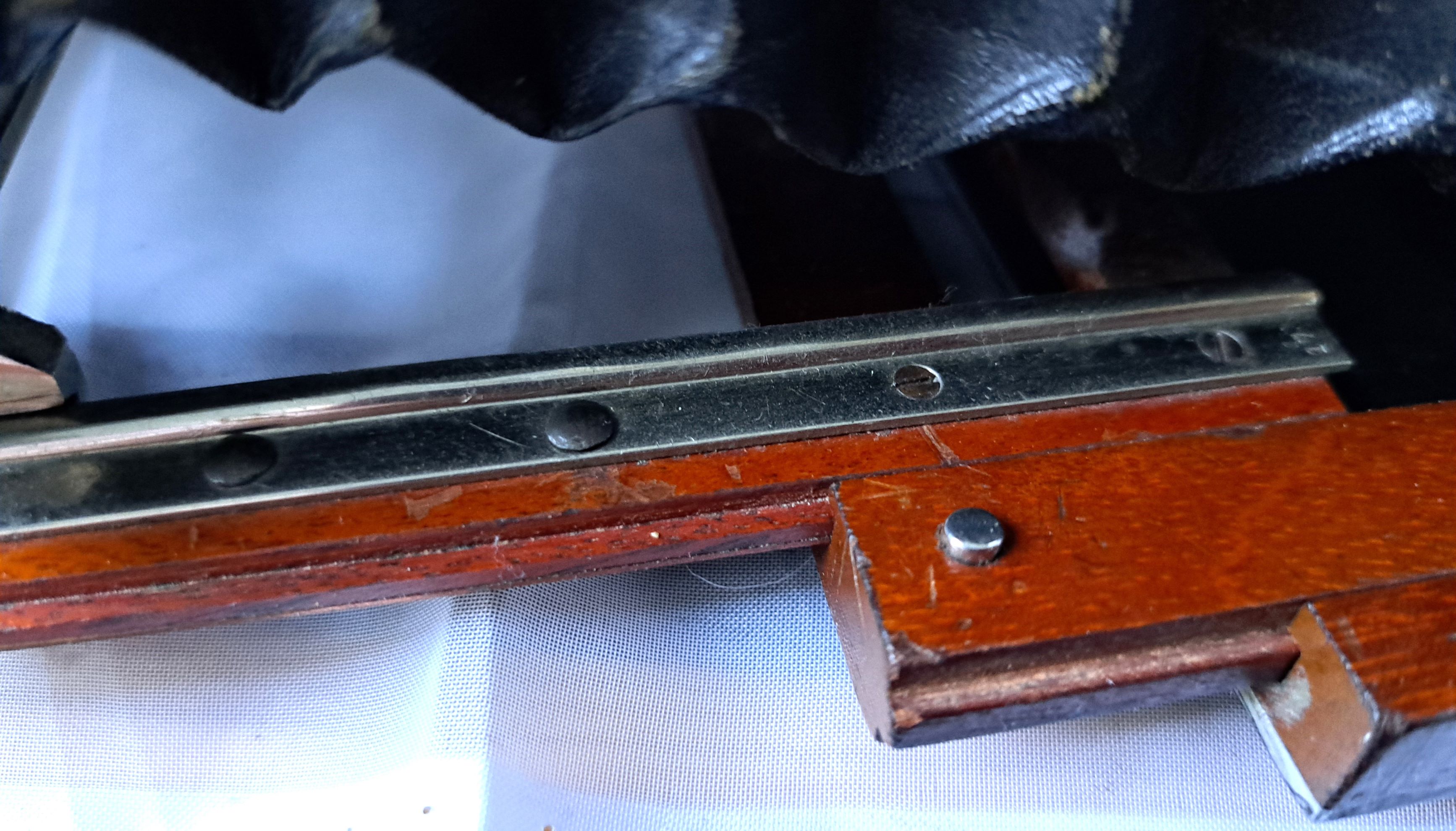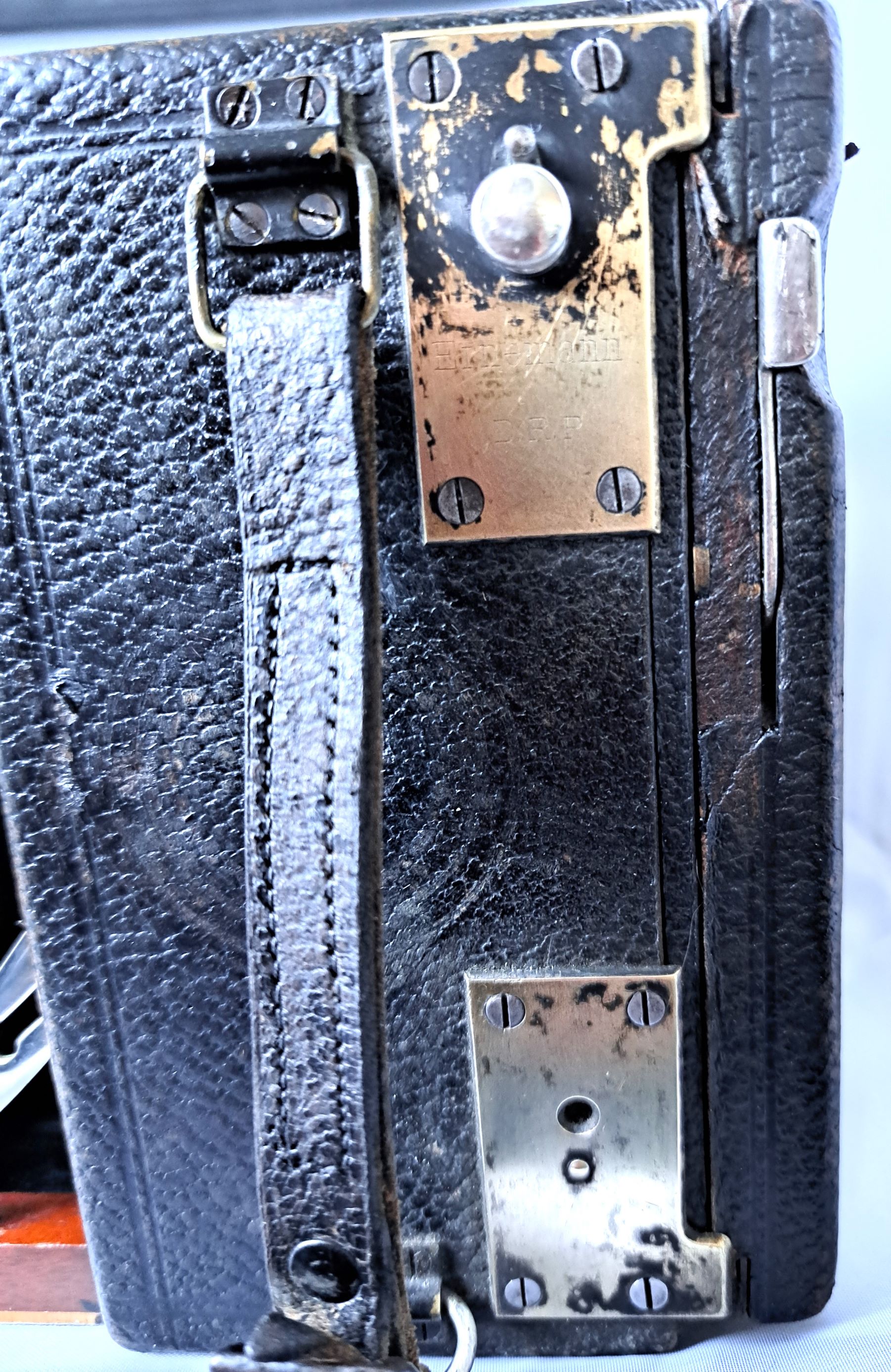 Das Kameragehäuse liegt im 10x15 vor, besteht komplett aus lederbezogenem Mahagoni. Ebenfalls aus Mahagoni ist der herausnehmbare Objektivträger, Laufboden und Schlitten sind ganz aus Holz und lagern auf einer belederten Metallplatte (Magnalium?/Aluminium).