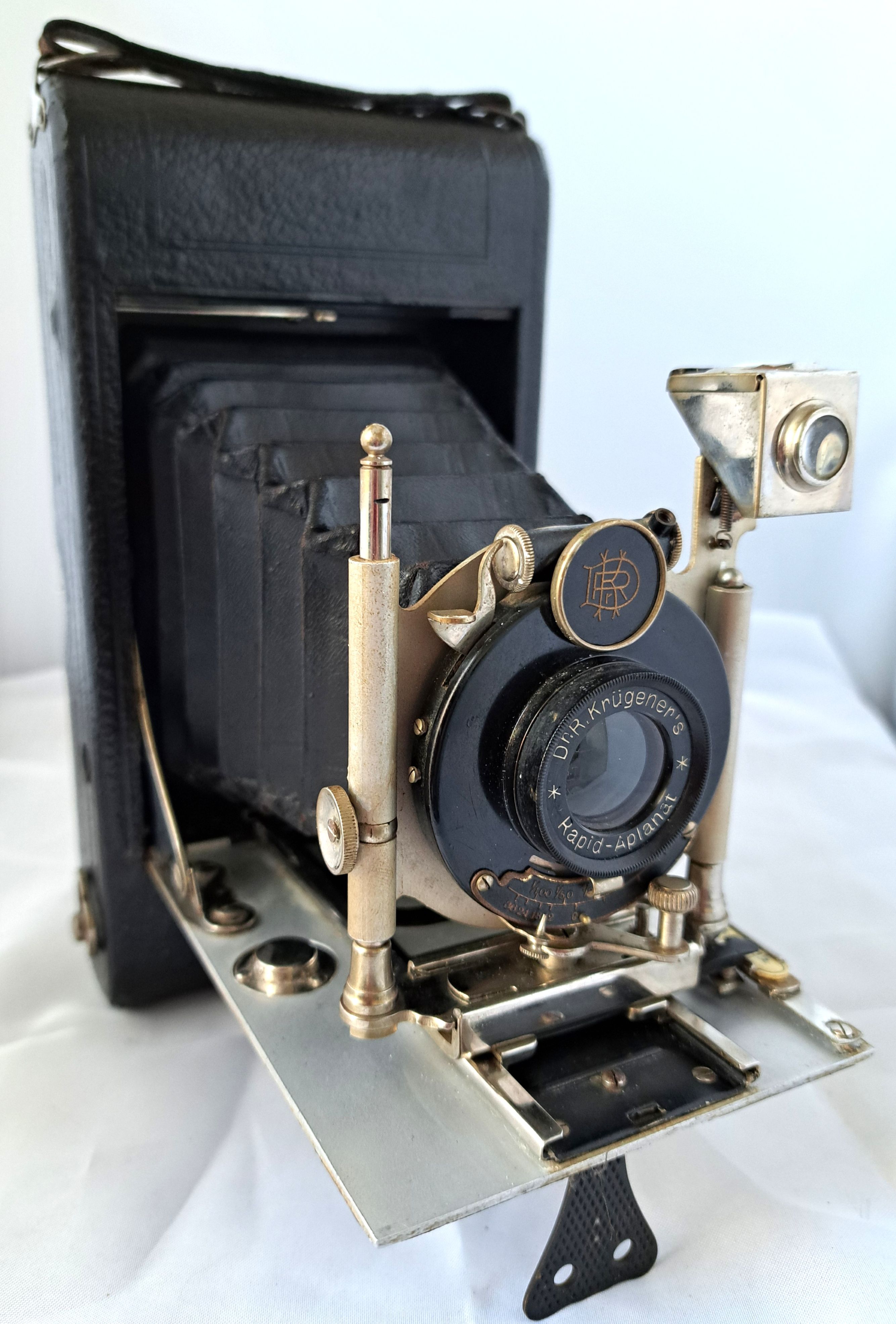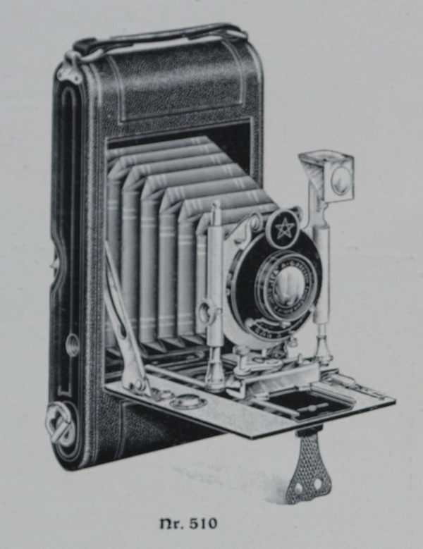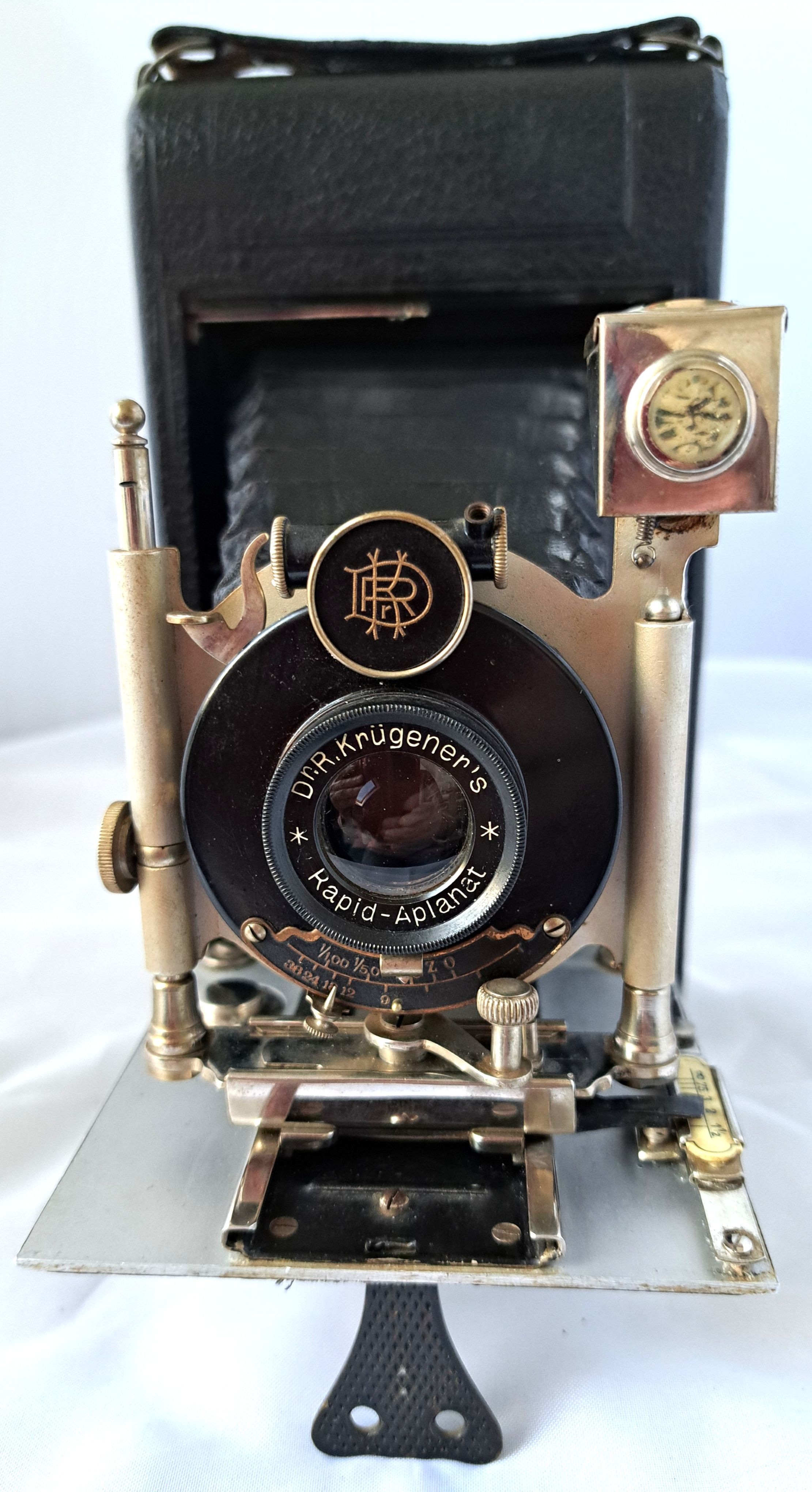 Hier zur Illustration eine Abbildung aus dem Ica-Katalog 1910. Dort ist es das Modell 510. Man erkennt sehr schön, dass lediglich das Markenzeichen auf dem Verschluss geändert wurde, er trägt jetzt das Ica-Pentagramm. Ansonsten ist die Kamera unverändert. Für die Variante mit Rapid-Aplanat 1:9 wird ein Verkaufspreis von 69 Mark genannt; die Krügener-Kamera wird 1908/09 wohl einen ähnlichen Preis gehabt haben.