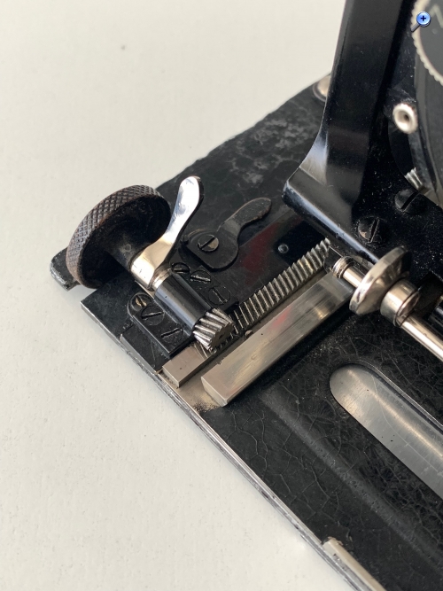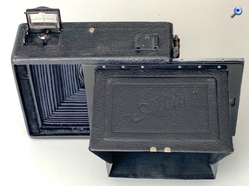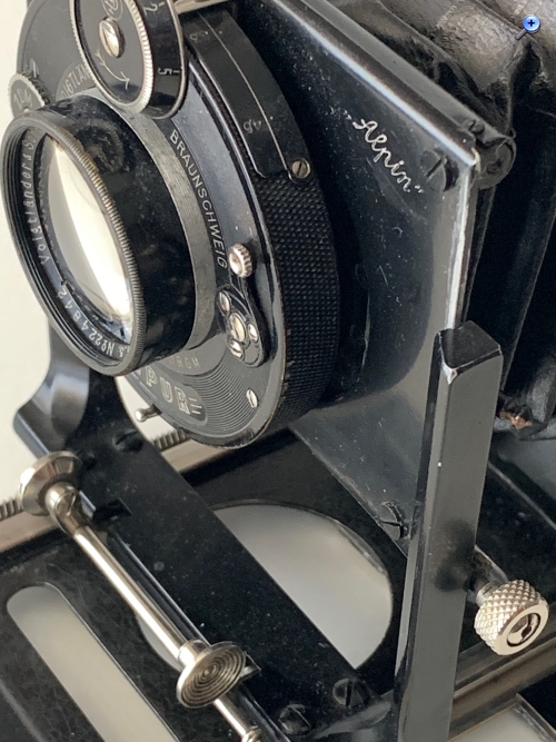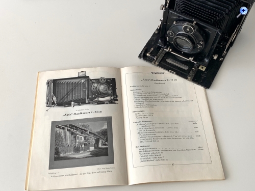 Merkmale dieses zweiten Modells ist, wie erwähnt, die gegossene U-Standarte. In dieser Form wurde die Kamera von 1912 an angeboten. Darüber hinaus gab es während der Bauzeit zahlreiche Änderungen im Detail. Gegenüber einem anderen im Forum gezeigten Exemplar (--> https://blende-und-zeit.sirutor-und-comp...&thread=161), das mit Compound ausgestattet ist, zeigt das vorliegende Exemplar Änderungen bei den Handhaben, und der Laufboden ist nun schwarz emailliert und wirkt etwas moderner. Das passt zu den Seriennummern von Objektiv und Verschluss, die eine Datierung um 1925 nahelegen. Verbaut ist ein Heliar 4,5/13,5 in Compur (1–1/200). In dieser Ausstattung war die Kamera im Jahr 1927 für 227 RM zu haben; in diesem Jahr endete auch die Produktion. Die Alpin hatte kein Nachfolgemodell – die Bergheil 9x12 war hinsichtlich Anspruch und Ausstattung vergleichbar, wurde aber nur im Hochformat angeboten.