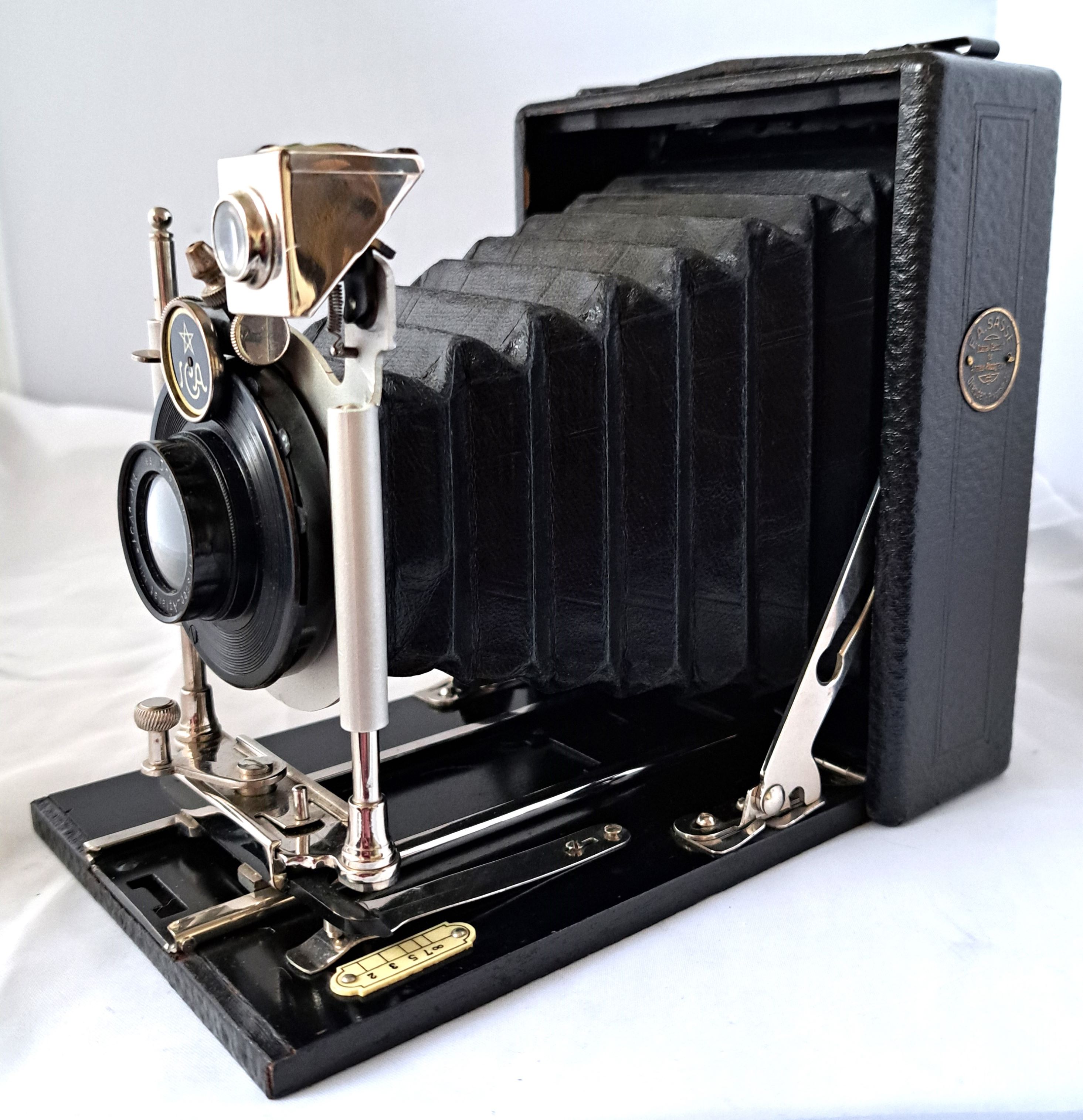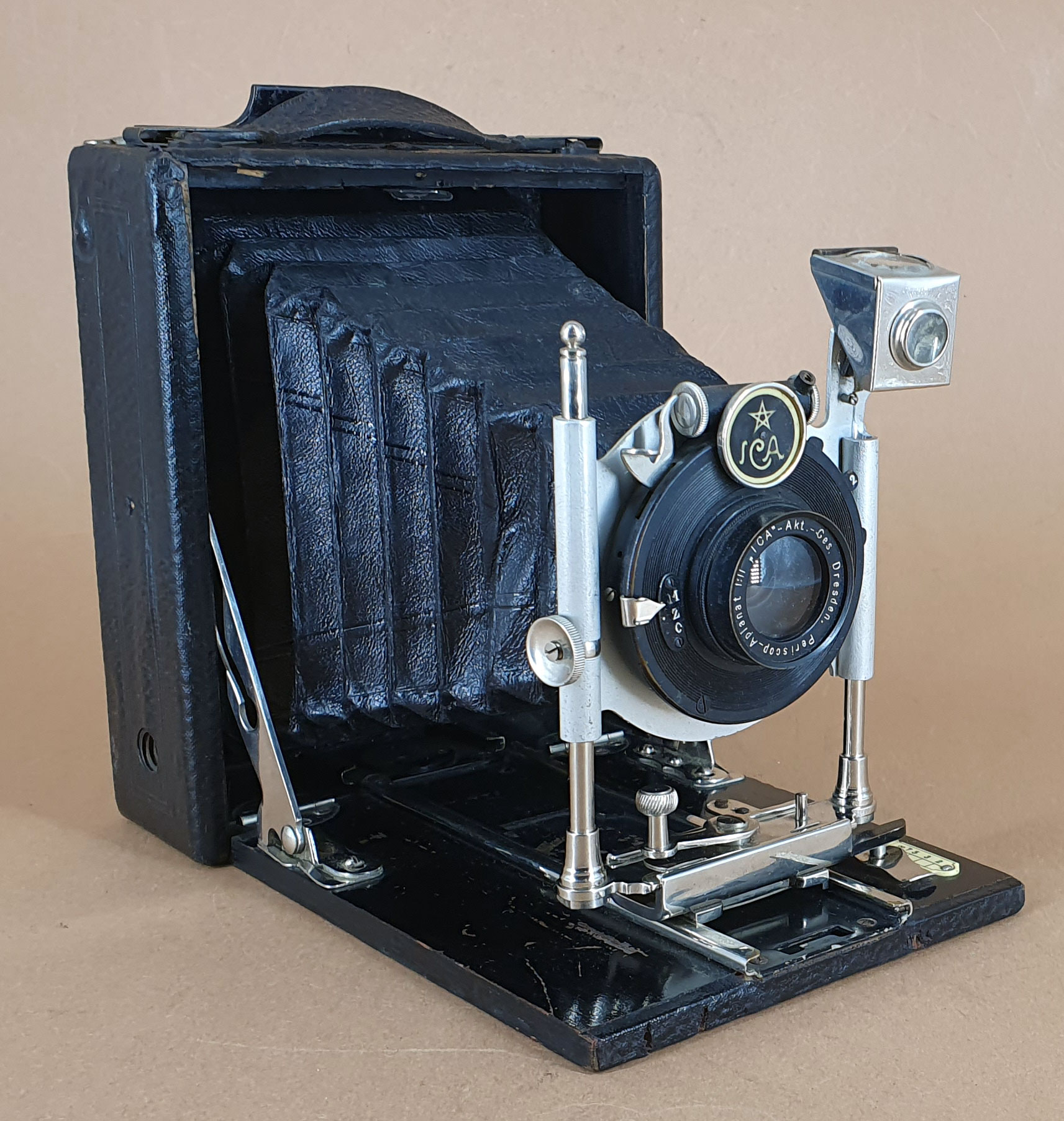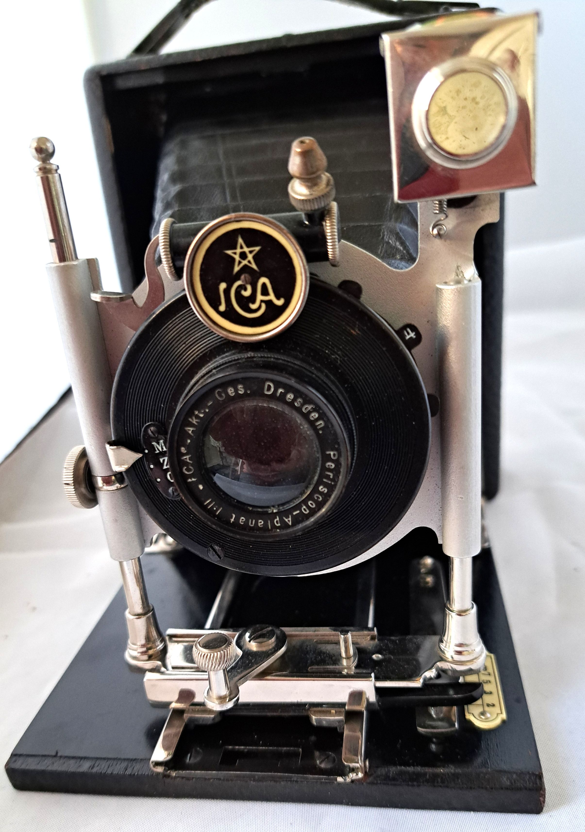 Die Kamera wurde der Standartenform zufolge wahrscheinlich aus dem Programm von Hüttig oder Krügener übernommen. Der Verschluss, die Griffbefestigung und die Spreizen sehen nach Krügener aus. Zur Ausstattung der vorliegenden Kamera passen bei Hüttig 1909 die Modelle Jul und Ingo. Von ICA habe ich leider keine frühen Katalogdaten. Die ICA-Plakette trägt das Jahr 1910, aber die Seriennummer beginnt mit einem „B“ was eher ins Jahr 1912 weist. Ich glaube jedoch nicht, dass ICA 1912 noch derartige Standarten gefertigt hat.