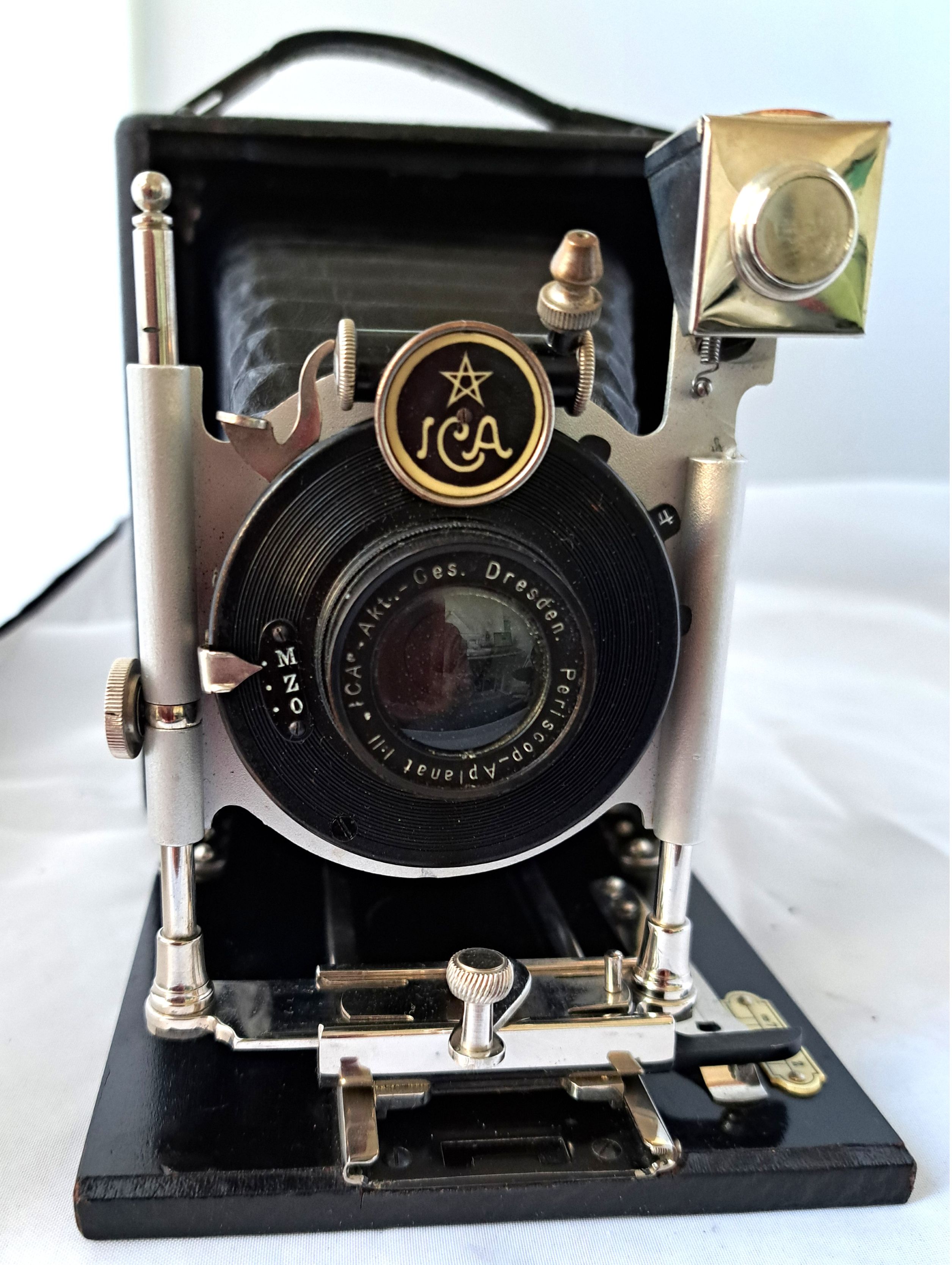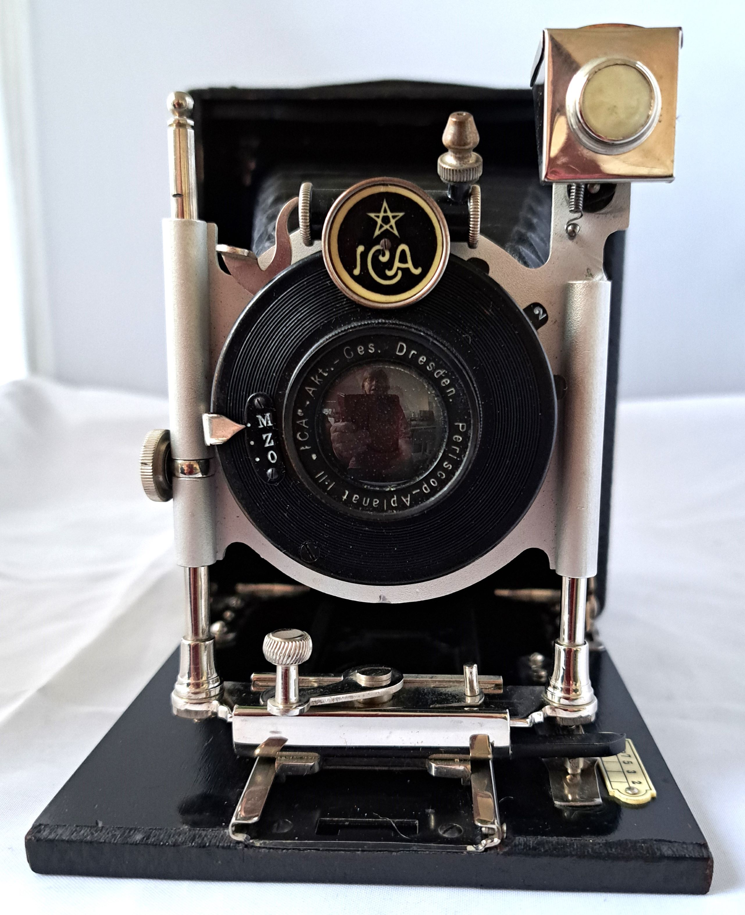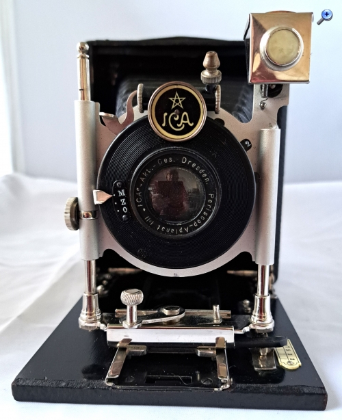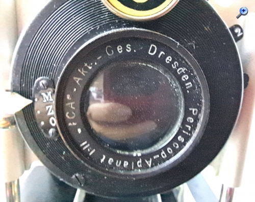 Natürlich ist es zweifellos eine ICA, aber beim Modell brauche ich Bestimmungshilfe. Es ist eine sehr einfache 9x12 Plattenkamera mit einfachem Auszug, Periscop-Aplanat 1:11, vier Blendenstufen und einfachem Verschluss. Das Rückteil der Kamera fehlt.