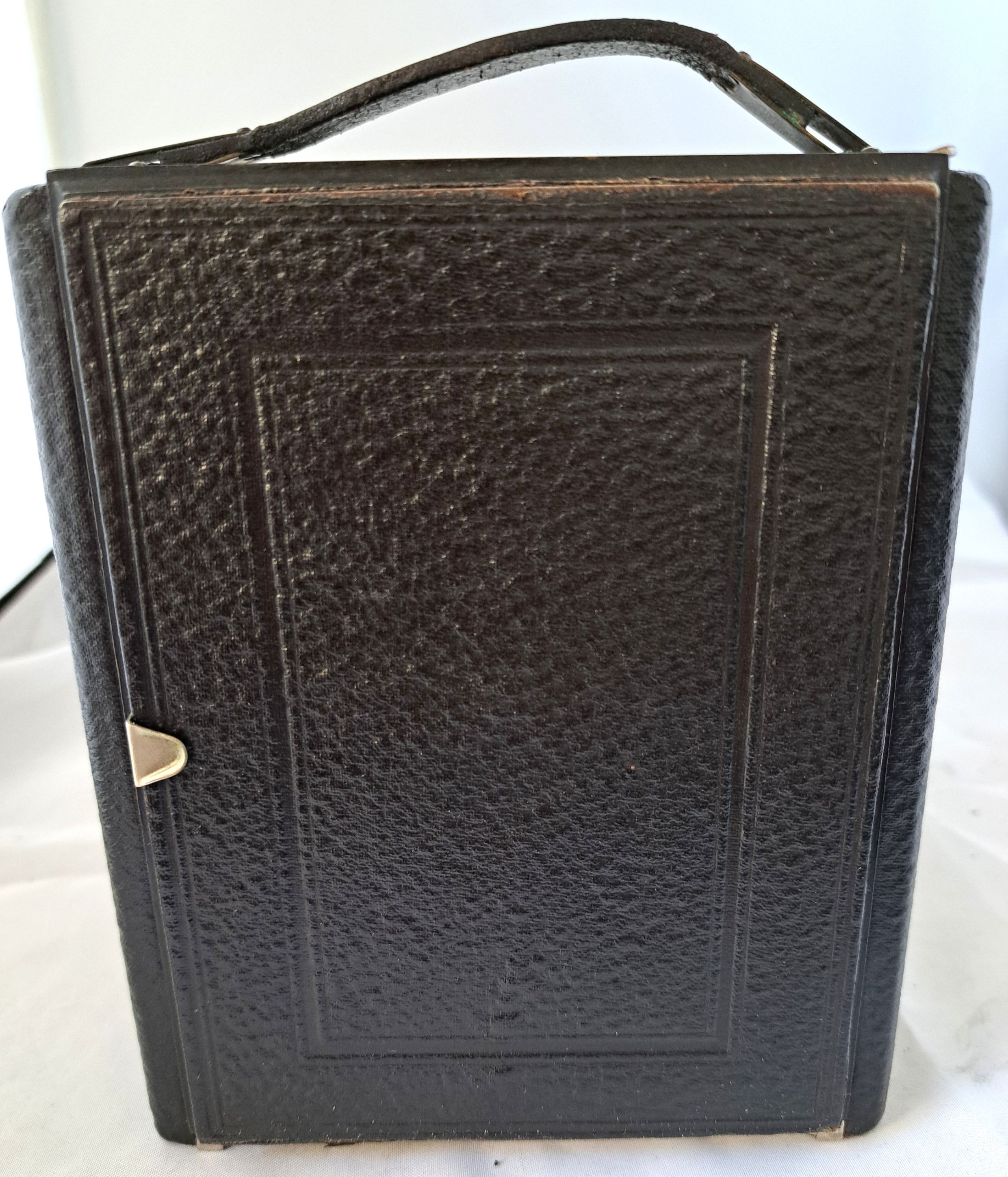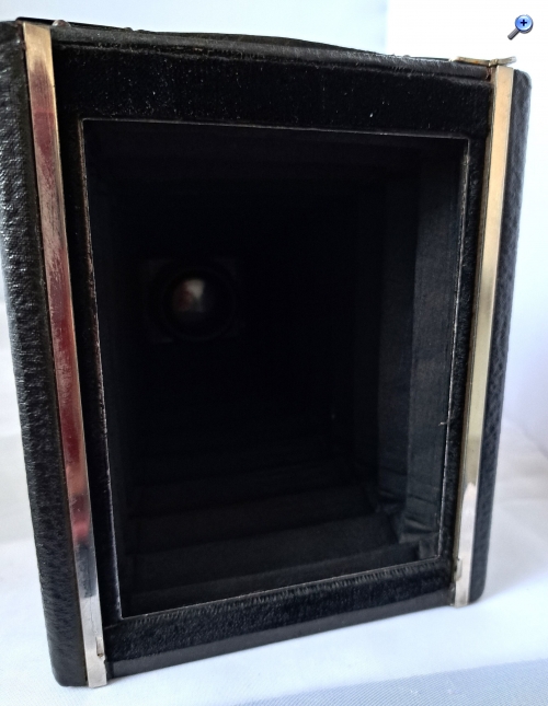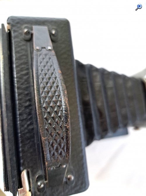 und lenkt den Blick auf den mit Metallband gefassten Gehäuserahmen in Richtung des Balgeninneren.