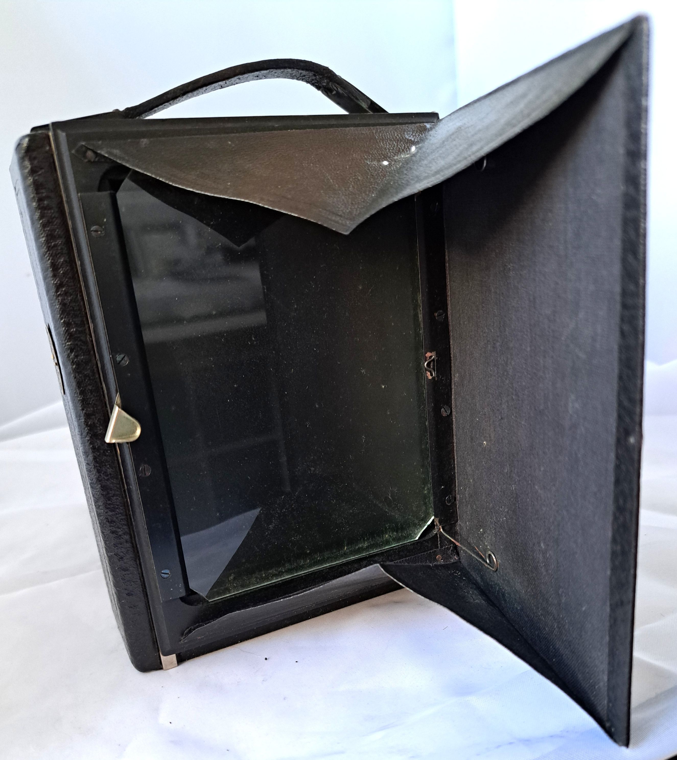 Beim Öffnen der Rückwand entfaltet sich der Lichtschacht mit Mattscheibe.