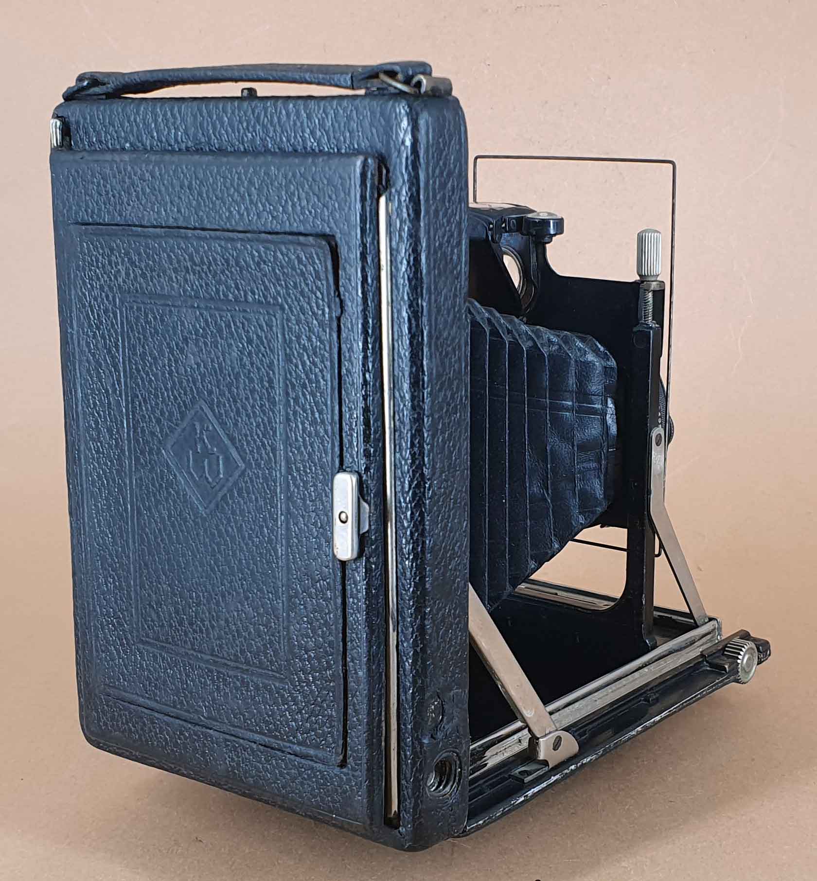 Für die technischen Spezifikationen und die historische Einordnung kann ich also getrost auf die bereits im Forum vorgestellten Kameras verweisen: https://blende-und-zeit.sirutor-und-comp...1&thread=71 https://blende-und-zeit.sirutor-und-comp...&thread=254 Das vorliegende Exemplar ist mit einem Tessar 4.5 (datiert 1929) im Compur-Verschluss bestückt und besitzt einen doppelten Auszug. Das Rückteil trägt die übliche KW-Beschriftung.
