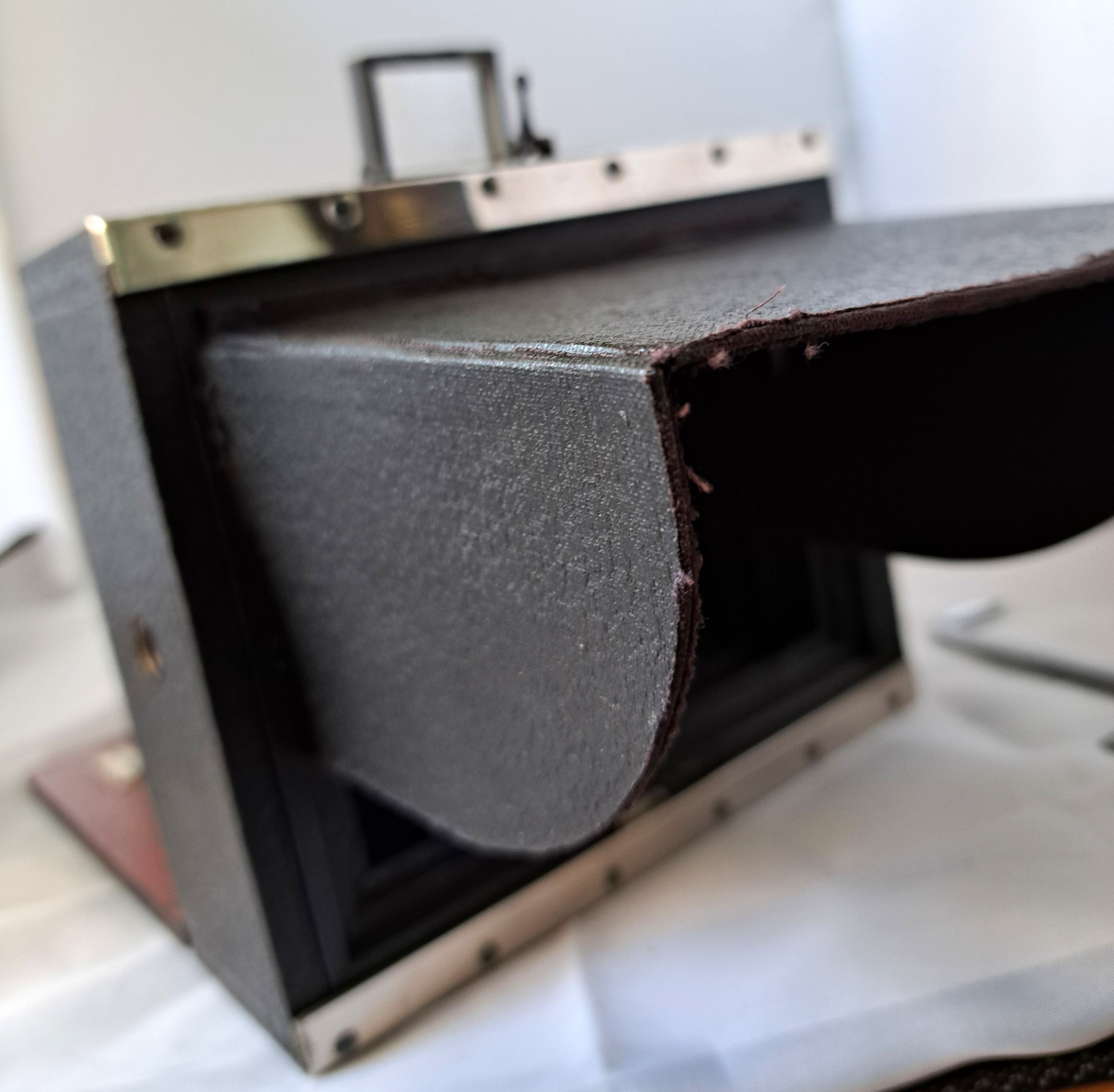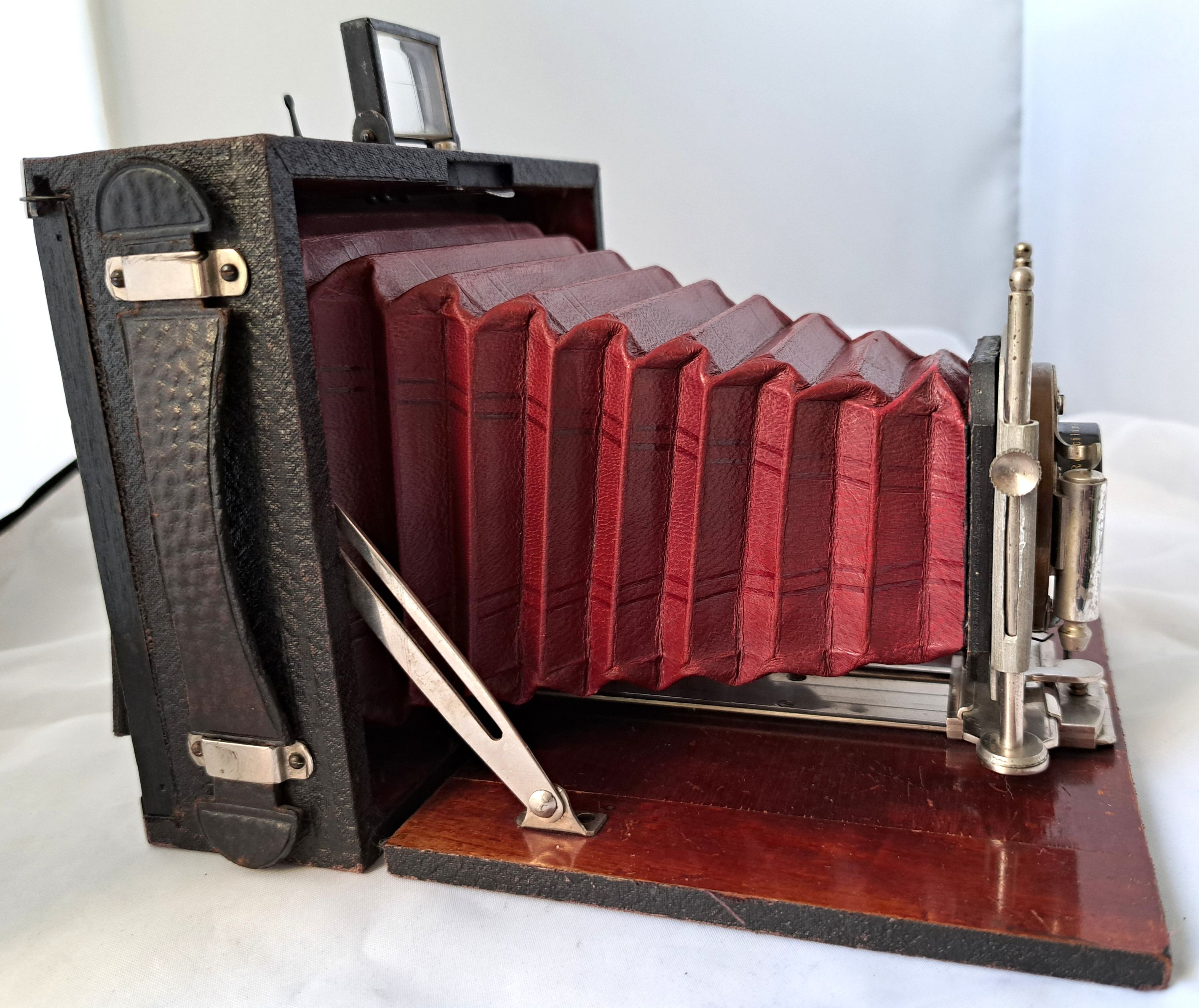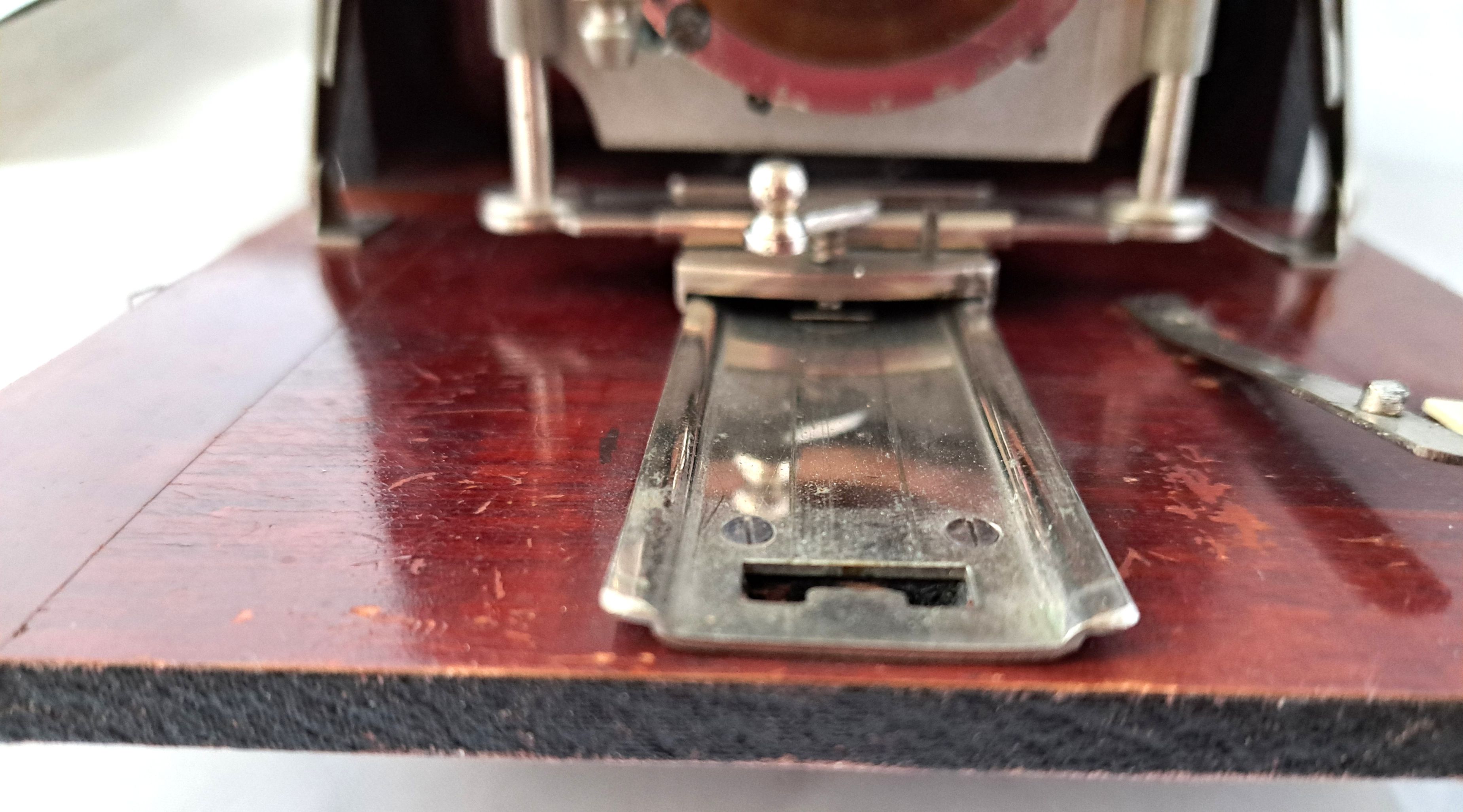 Das Gehäuse ist 9x12 Querformat und aus relativ leichtem Holz mit dünner Belederung (vermutl. Kunstleder), der Laufboden mit einfachem Auszug ist auch aus mit Schellack lackiertem Holz und an der Unterseite mit Kunstleder bezogen.