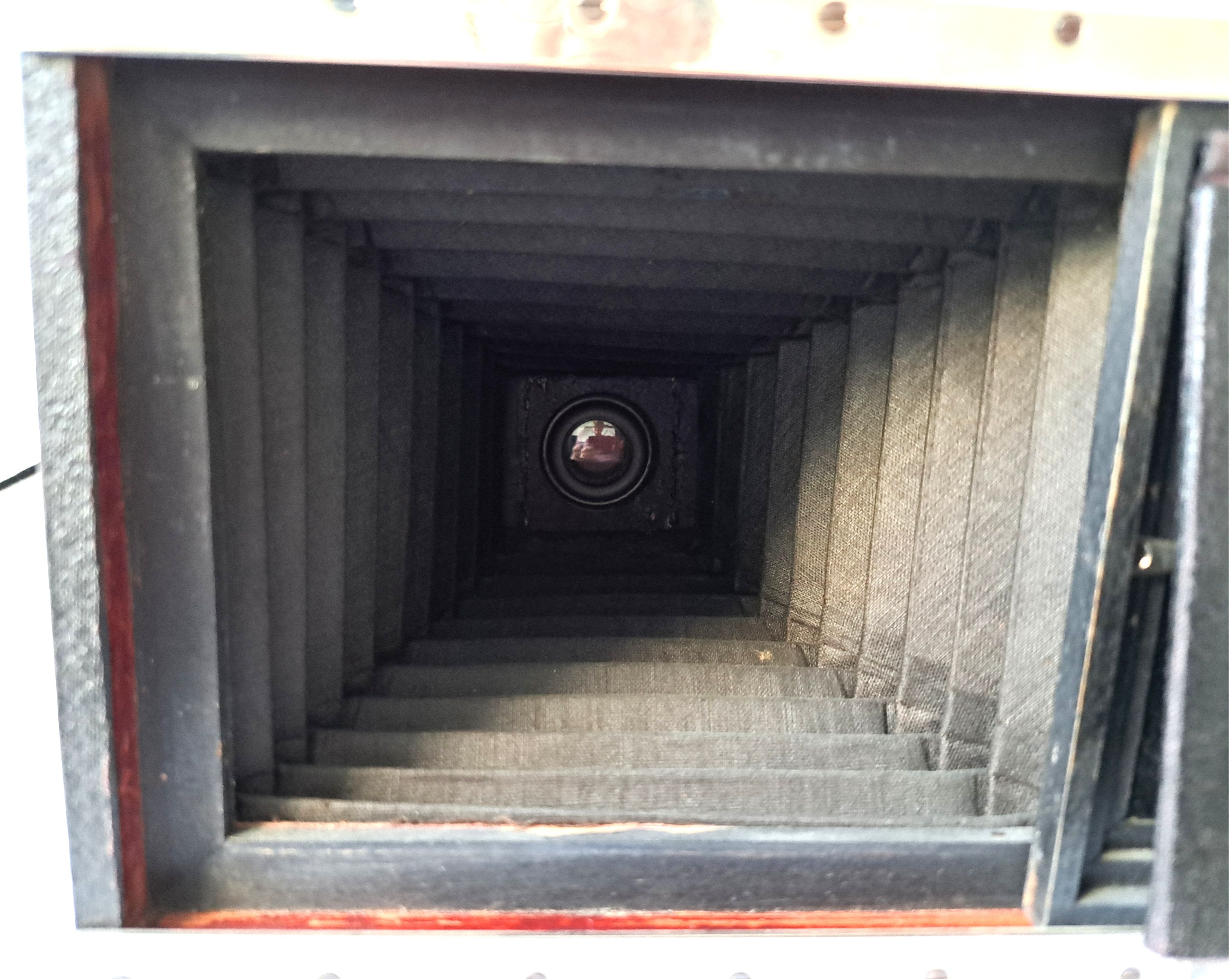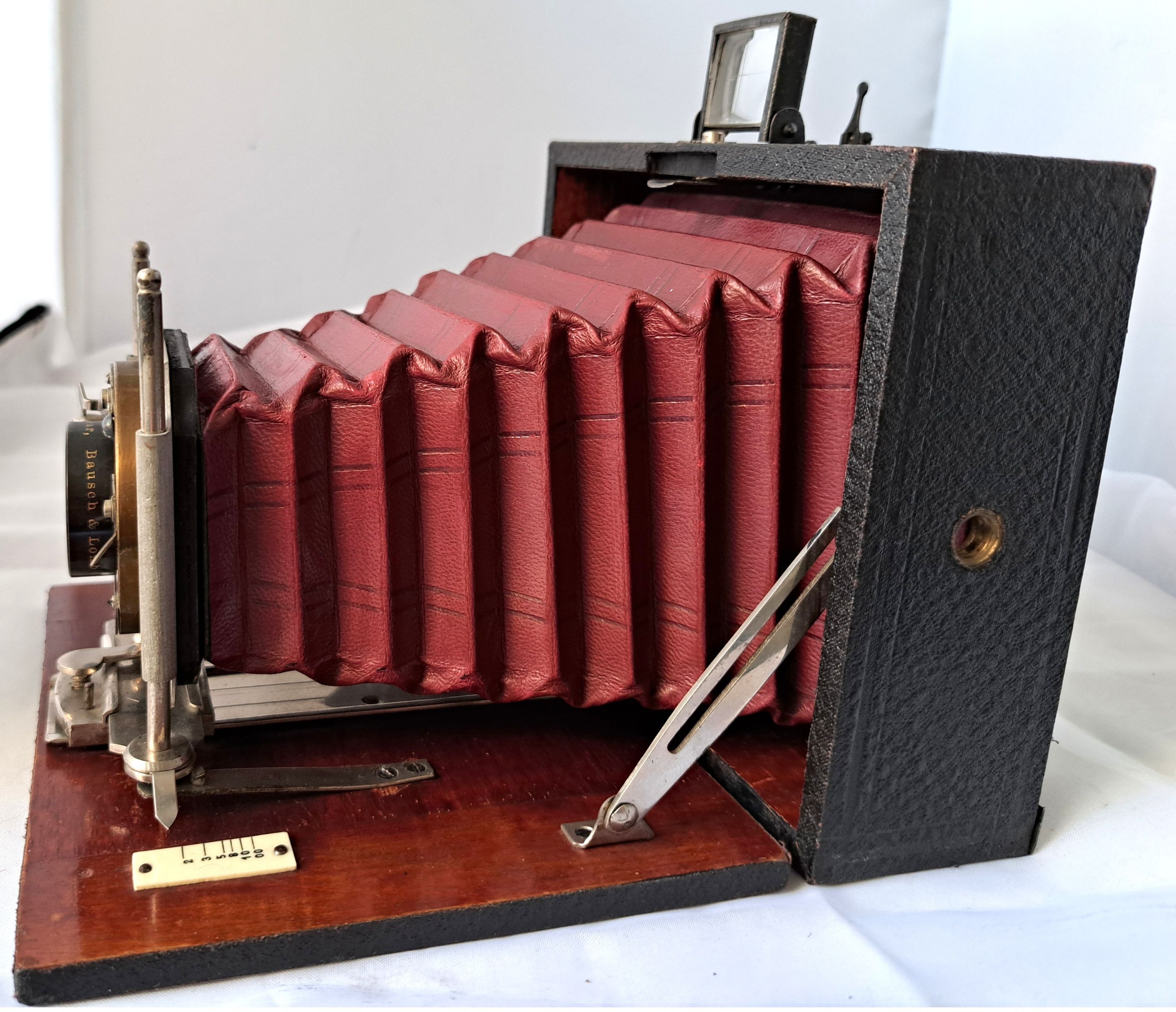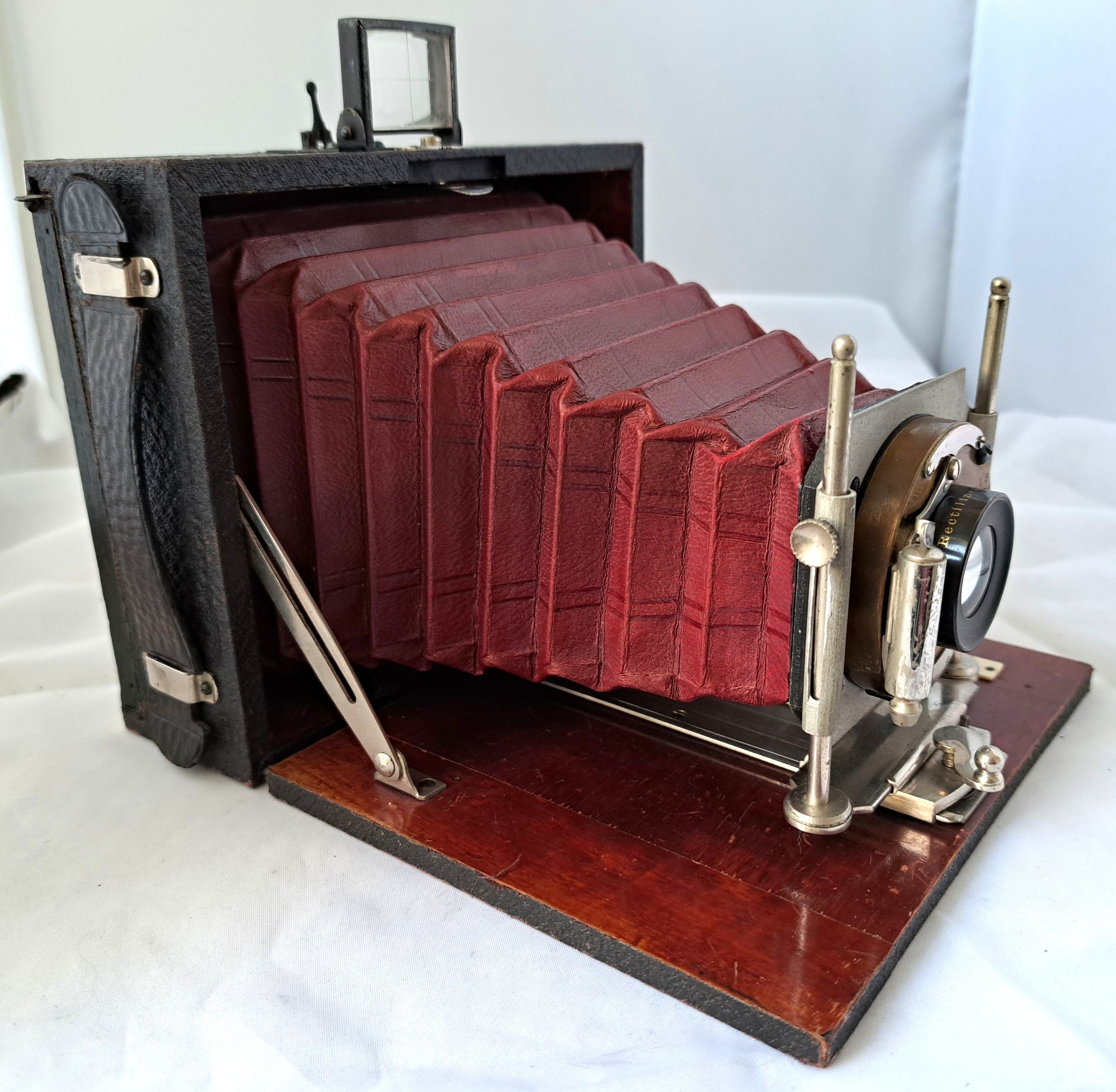 Das Gehäuse ist 9x12 Querformat und aus relativ leichtem Holz mit dünner Belederung (vermutl. Kunstleder), der Laufboden mit einfachem Auszug ist auch aus mit Schellack lackiertem Holz und an der Unterseite mit Kunstleder bezogen.
