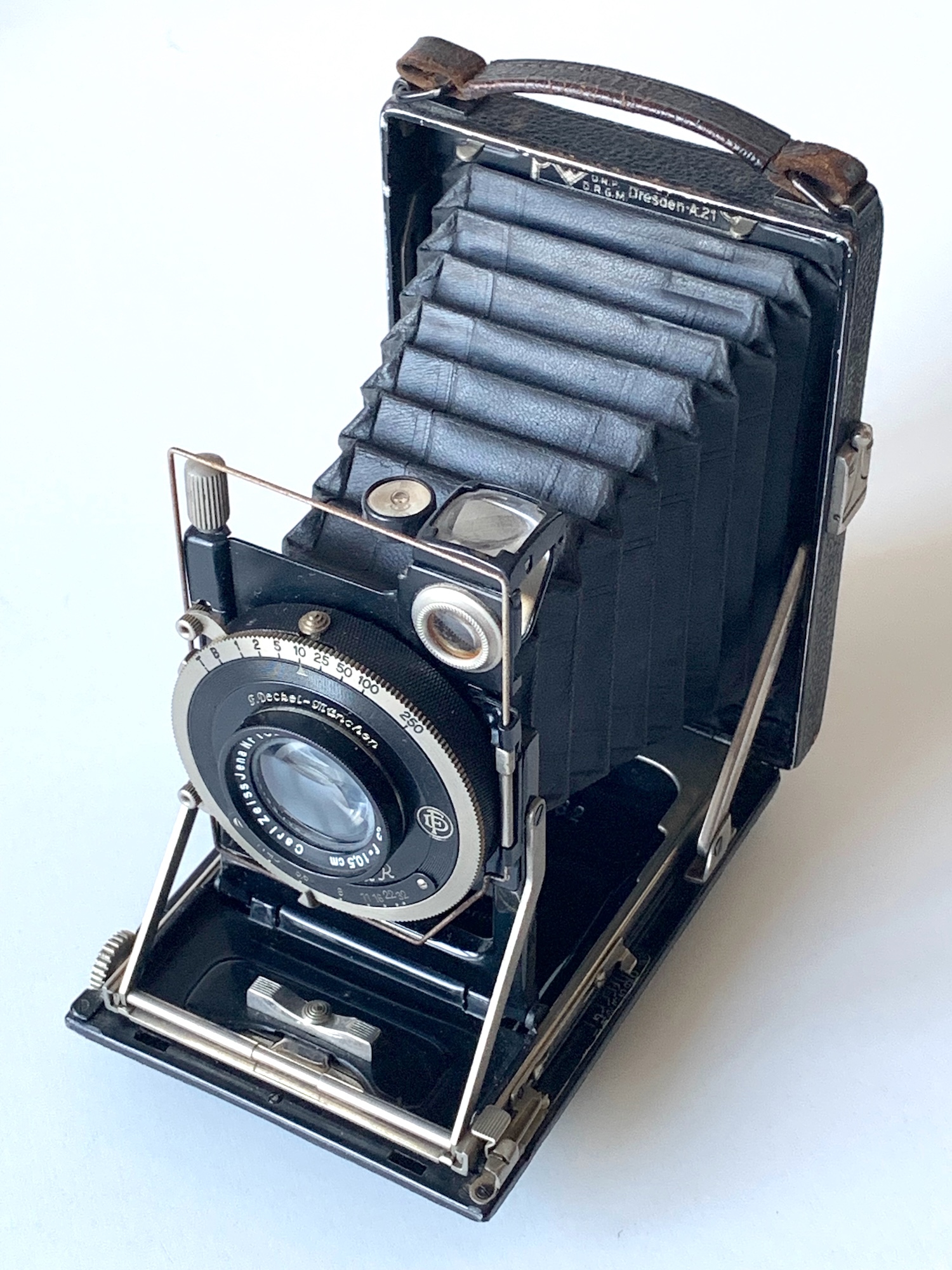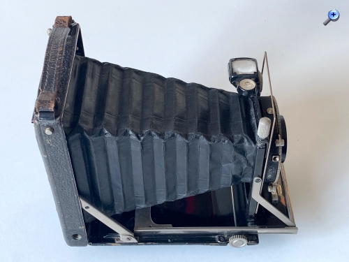 Hier sei ein Exemplar in der Größe 6,5x9 vorgestellt. Die Kamera besitzt zweifachen Auszug mit Zahntriebfokussierung, das Objektivbrett lässt sich mittels Spindeltrieb vertikal verstellen. Als Sucher stehen ein Brillantsucher mit Libelle und ein Ikonometer zur Verfügung. Ausgestattet ist die Kamera mit einem Tessar 4,5/10,5 von 1928 in Ring-Compur mit Selbstauslöser. Die Bestückung ist auf der noch vorhandenen Originalverpackung feinsäuberlich notiert. In dieser Kombination war die Kamera im Jahr 1932 für 126 RM zu haben (Katalog bei Kerkmann Nr. 01089).
