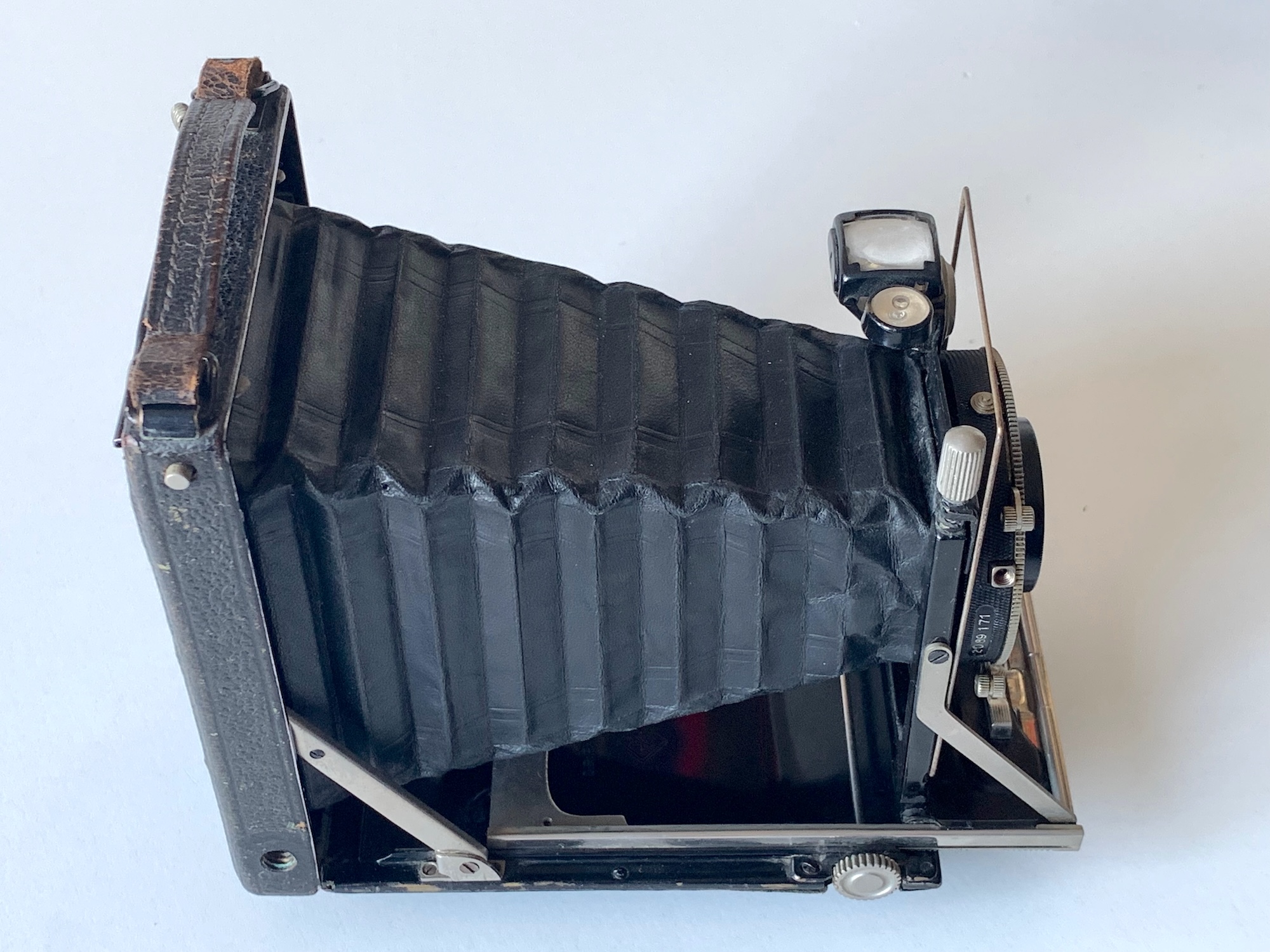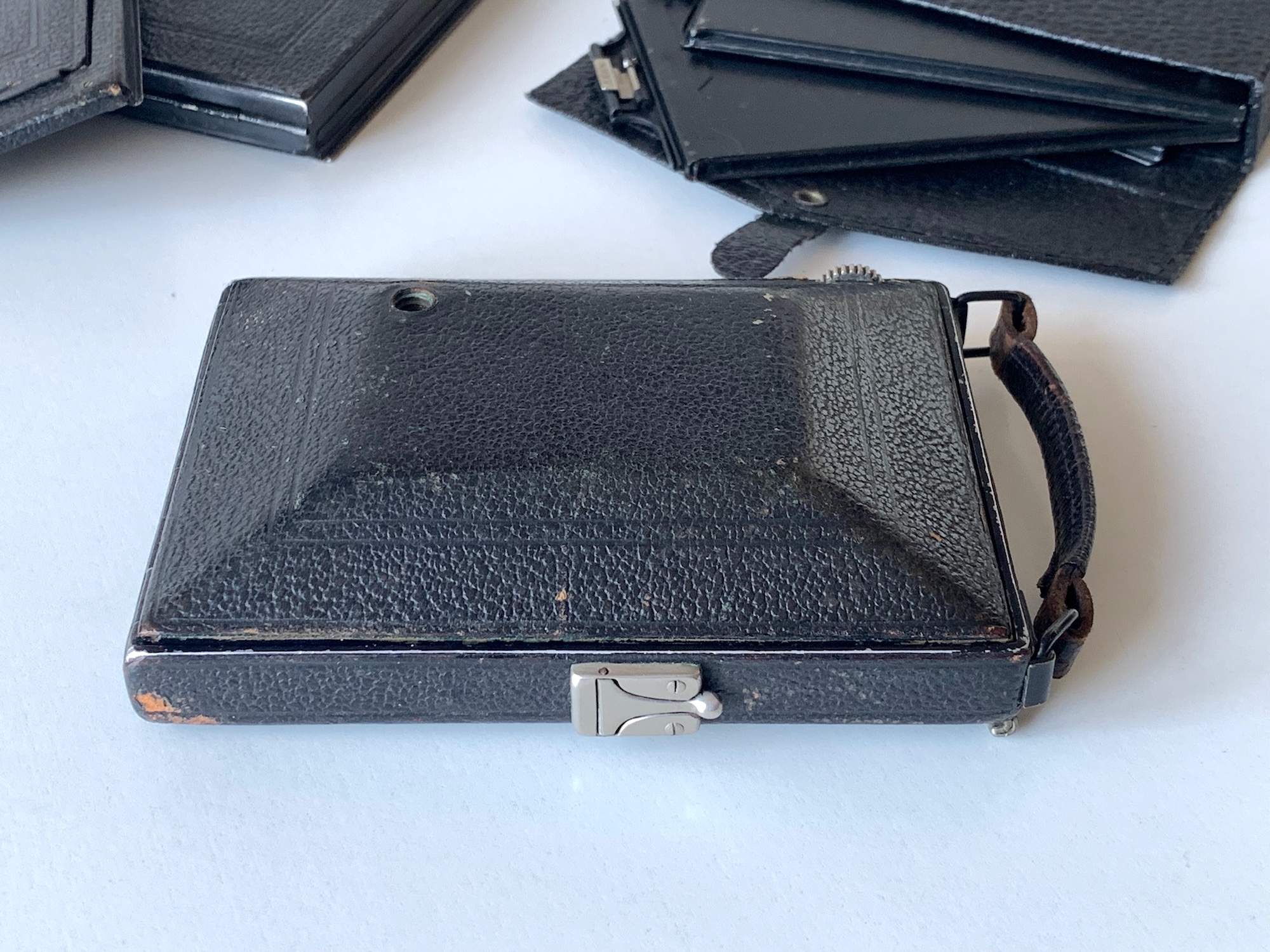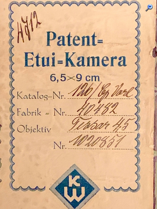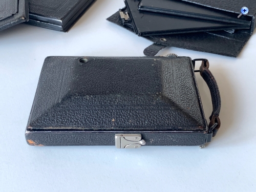 Hinzu kommt, dass die 1,6 cm Gehäusedicke nur erreicht werden, wenn keine Kassette und kein Mattscheibenrückteil eingeschoben ist, sondern ein (nicht auftragender) Gehäusedeckel; so etwas habe ich an keiner anderen Kamera gesehen. In der Regel wird man die Kamera natürlich mit Platten- oder Packfilmkassetten bestückt haben, wie sie oben im Hintergrund zu sehen sind; und ganz so flach ist sie dann nicht mehr. Die Patent-Etui weist einen besonderen Falz auf; die Rückteile passen an keine meiner anderen 6,5x9-Kameras. Ich meine, dass es sich um den Contessa-Falz handelt, bin mir aber nicht sicher.