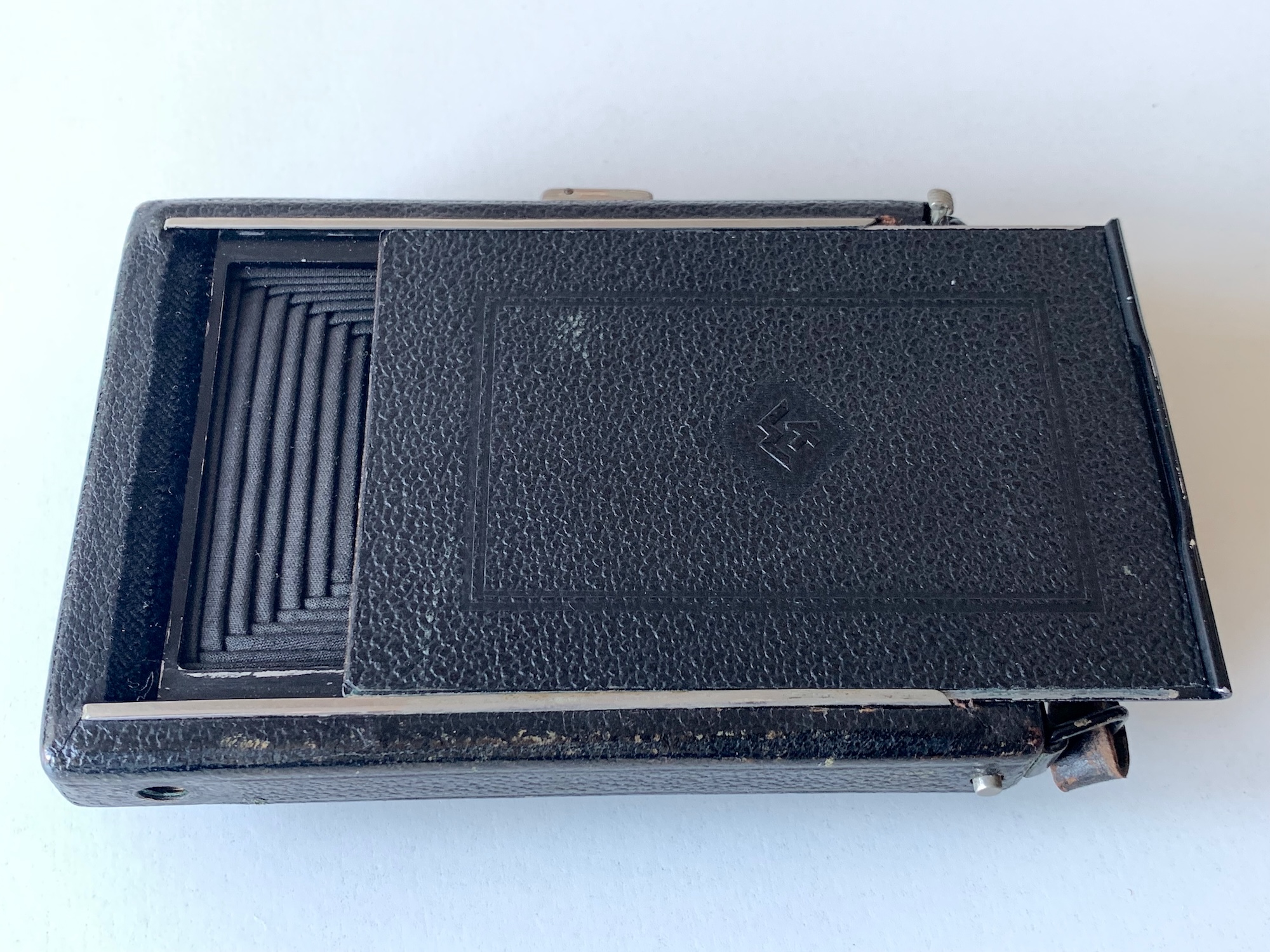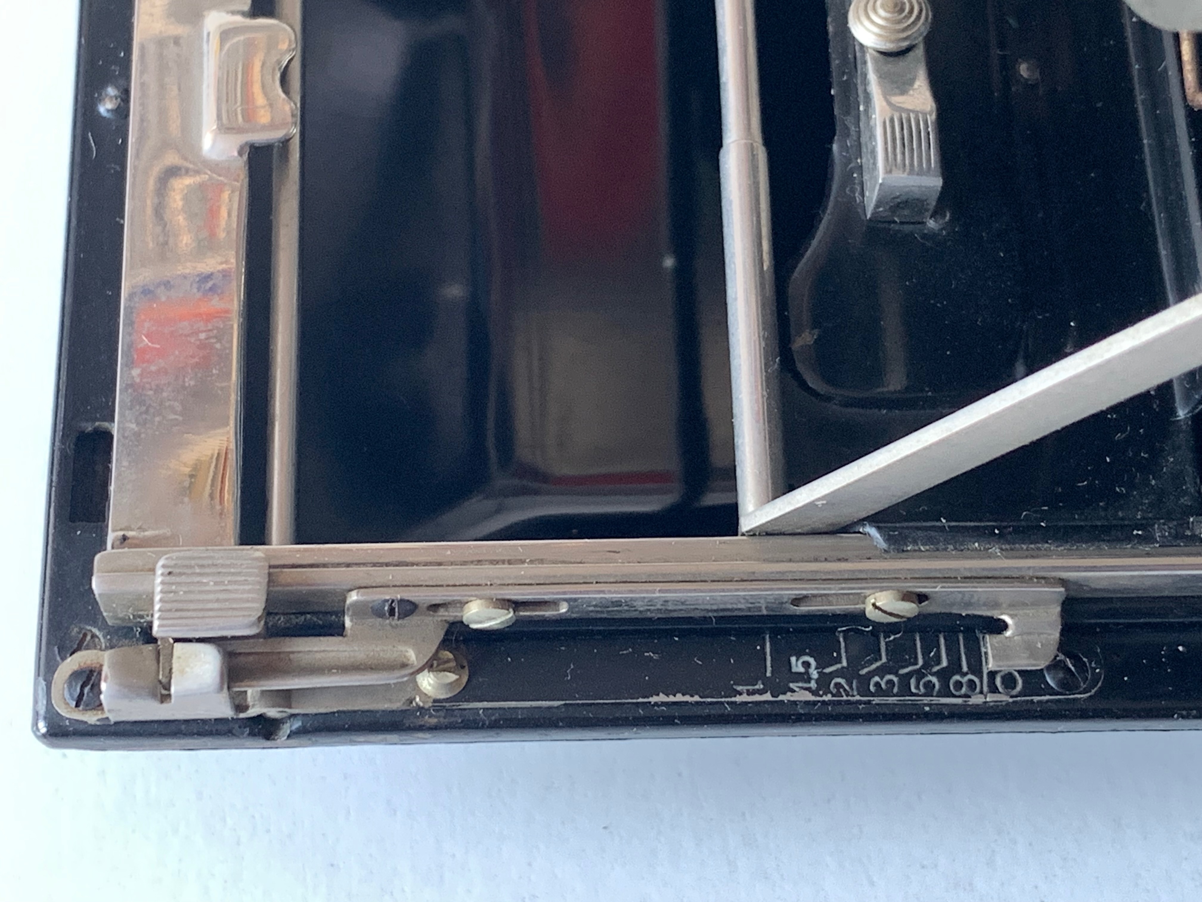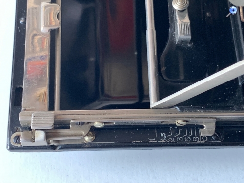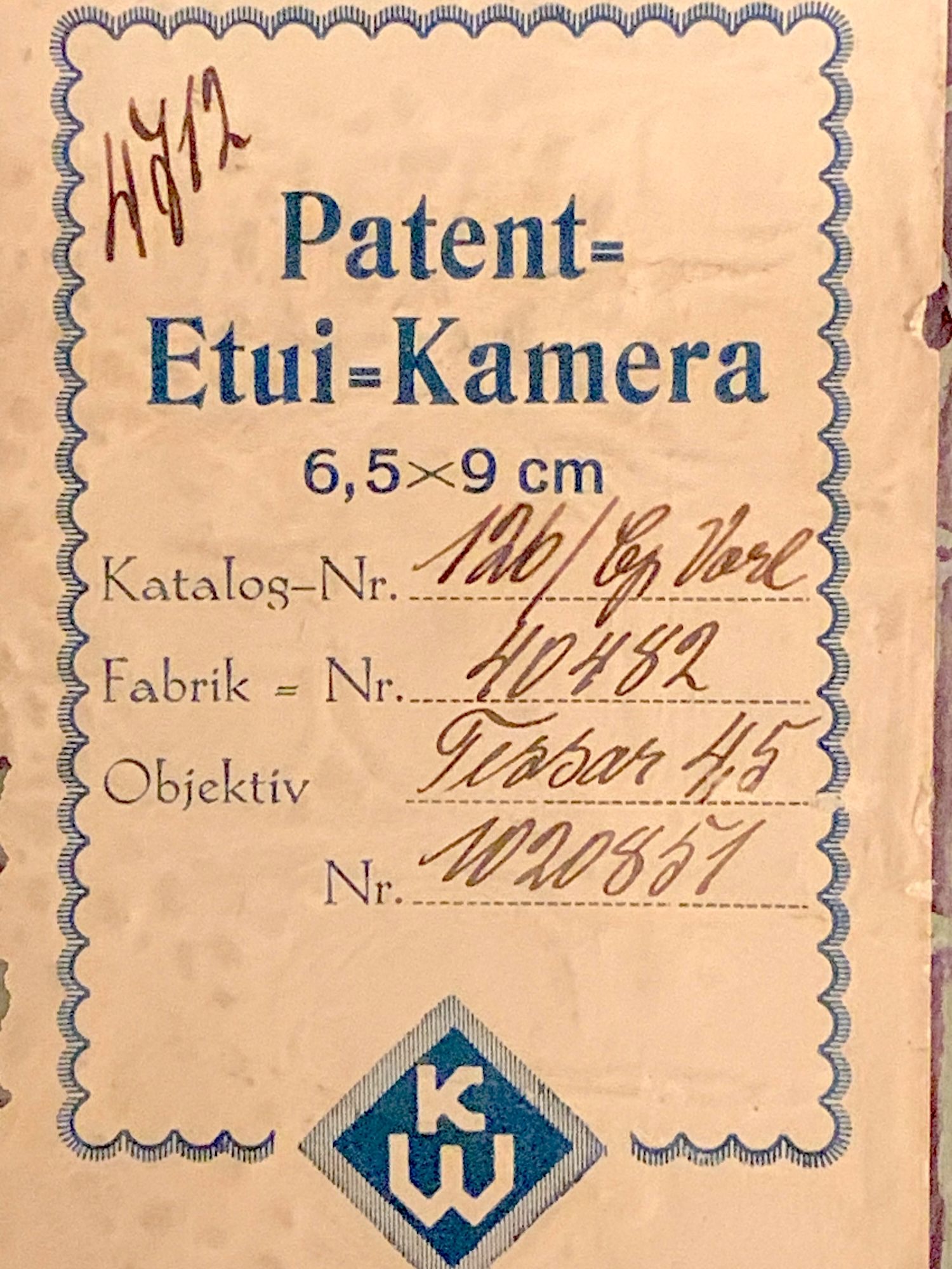 Hinzu kommt, dass die 1,6 cm Gehäusedicke nur erreicht werden, wenn keine Kassette und kein Mattscheibenrückteil eingeschoben ist, sondern ein (nicht auftragender) Gehäusedeckel; so etwas habe ich an keiner anderen Kamera gesehen. In der Regel wird man die Kamera natürlich mit Platten- oder Packfilmkassetten bestückt haben, wie sie oben im Hintergrund zu sehen sind; und ganz so flach ist sie dann nicht mehr. Die Patent-Etui weist einen besonderen Falz auf; die Rückteile passen an keine meiner anderen 6,5x9-Kameras. Ich meine, dass es sich um den Contessa-Falz handelt, bin mir aber nicht sicher.