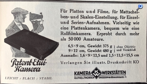 Es handelt sich um eine Laufbodenkamera in besonders flacher und zugleich stabiler Bauweise, die 1920 von den Kamera-Werkstätten Guthe & Thorsch in Dresden auf den Markt gebracht wurde. Sie wurde bis 1938 produziert und war offenbar ein großer Erfolg, wie die große Zahl der Exemplare auf dem Sammlermarkt zeigt. Die Kamera wurde in den Formaten 9x12 und 6,5x9 produziert. Es gab sie in unterschiedlichen Ausstattungsvarianten – mit einfachem und doppeltem Auszug, mit Zahntrieb- und Frontlinsenfokussierung, mit und ohne Höhenverstellung und natürlich mit zahlreichen Objektiv-Verschluss-Bestückungen.
