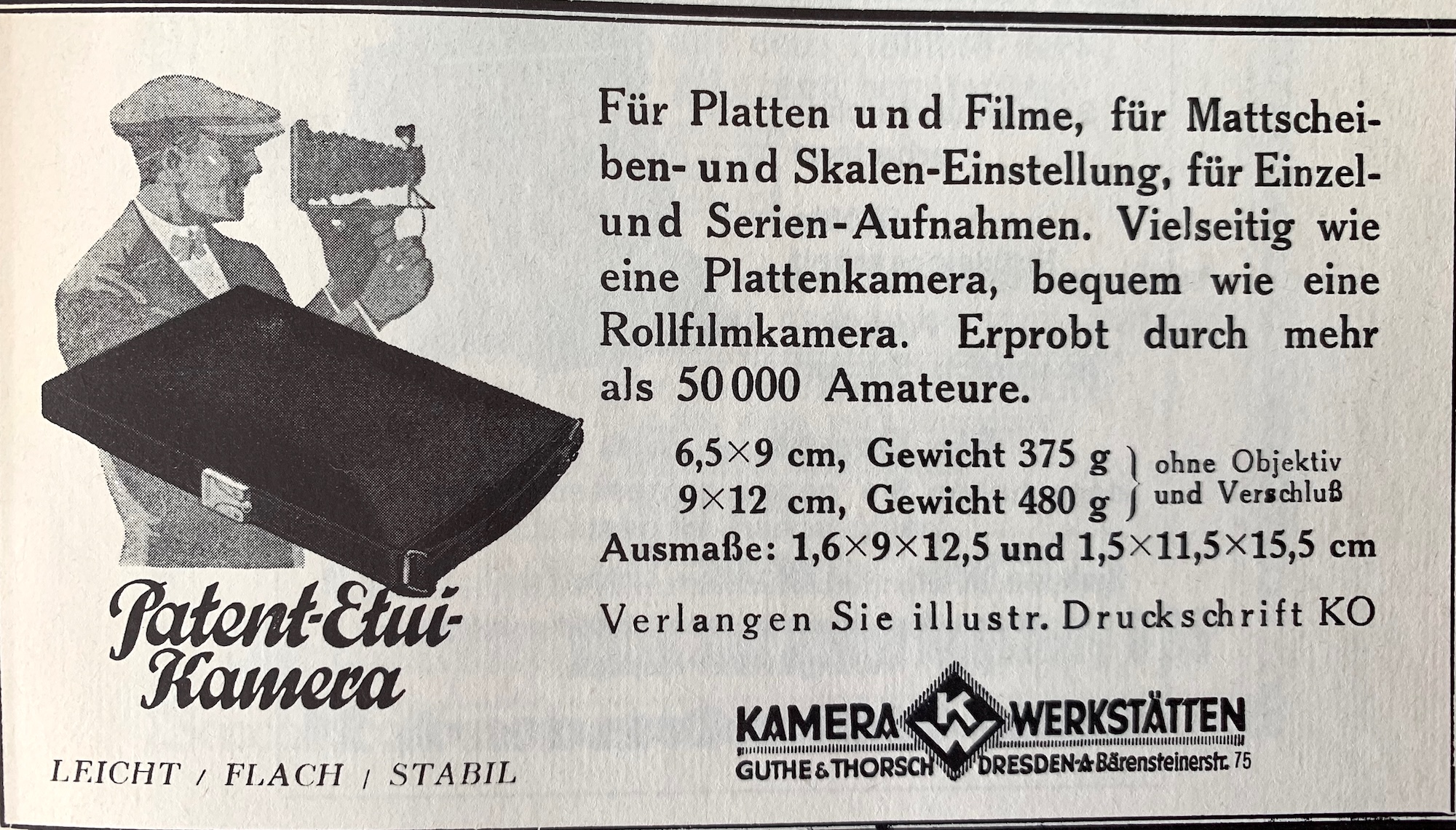 Stabilität und flache Konstruktion wurden in der Werbung entsprechend hervorgehoben, aber das muss doch etwas relativiert oder zumindest kommentiert werden. Laut Werbeanzeige von 1929 ist das Gehäuse nur 1,6 cm tief, und die nebenstehende Abbildung suggeriert, die gesamte Kamera sei so flach.