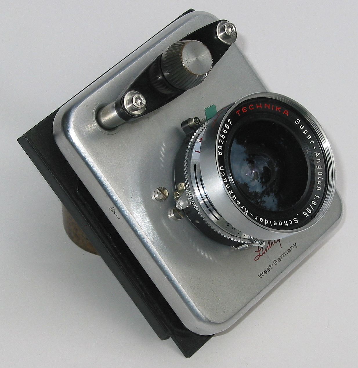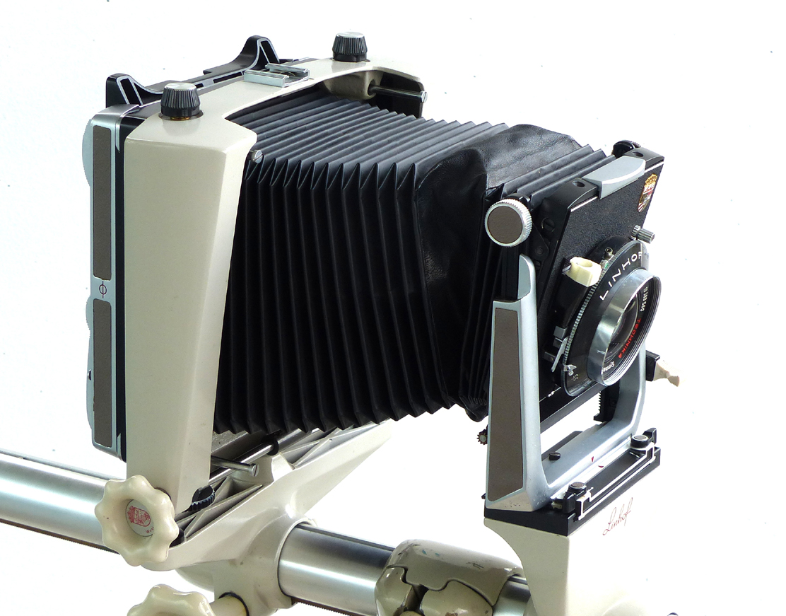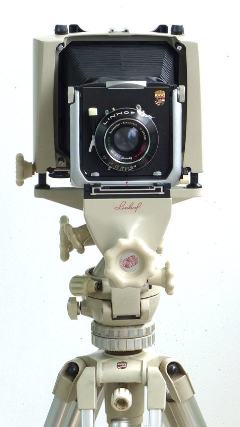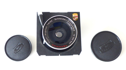 Als Objektive benutze ich ein Standardobjektiv, das alte sechslinsige Schneider-Symmar 1:5.6/150mm und ein Weitwinkelobjektiv, Schneider-Super-Angulon 1:8/65mm. Das Super-Angulon erfasst einen Winkel von knapp 100° in der Diagonalen ohne störende Verzerrung.