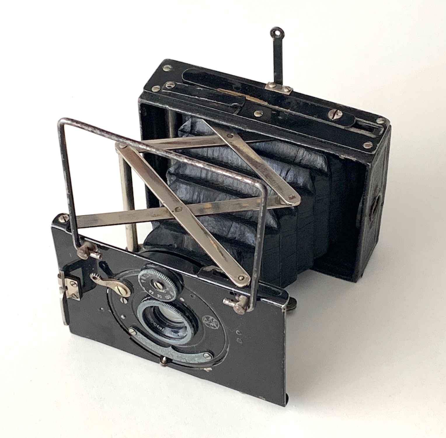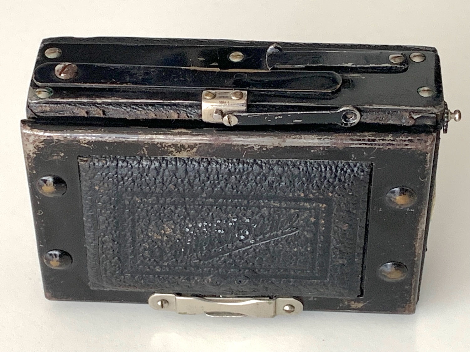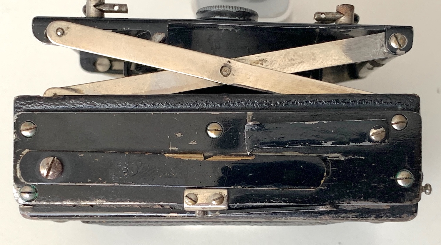 Ob nun also Errtee oder Nettix: Es handelt sich um eine Spreizenkamera für Platten im Format 4,5x6. Sie ist mit einem Scherenspreizensystem ausgestattet; beim Ausziehen wird die Mechanik in Unendlich-Position durch einen gefederten einrastenden Hebel fixiert. Eine Naheinstellung ist möglich, allerdings besitzt die Kamera keine Entfernungsskala. Man erkennt zwar auf der Oberseite ganz schwach ein paar Ziffern, aber das scheinen keine Entfernungsangaben zu sein. Eine Skala scheinen aber auch andere Exemplare, die ich gesehen habe, nicht zu besitzen.