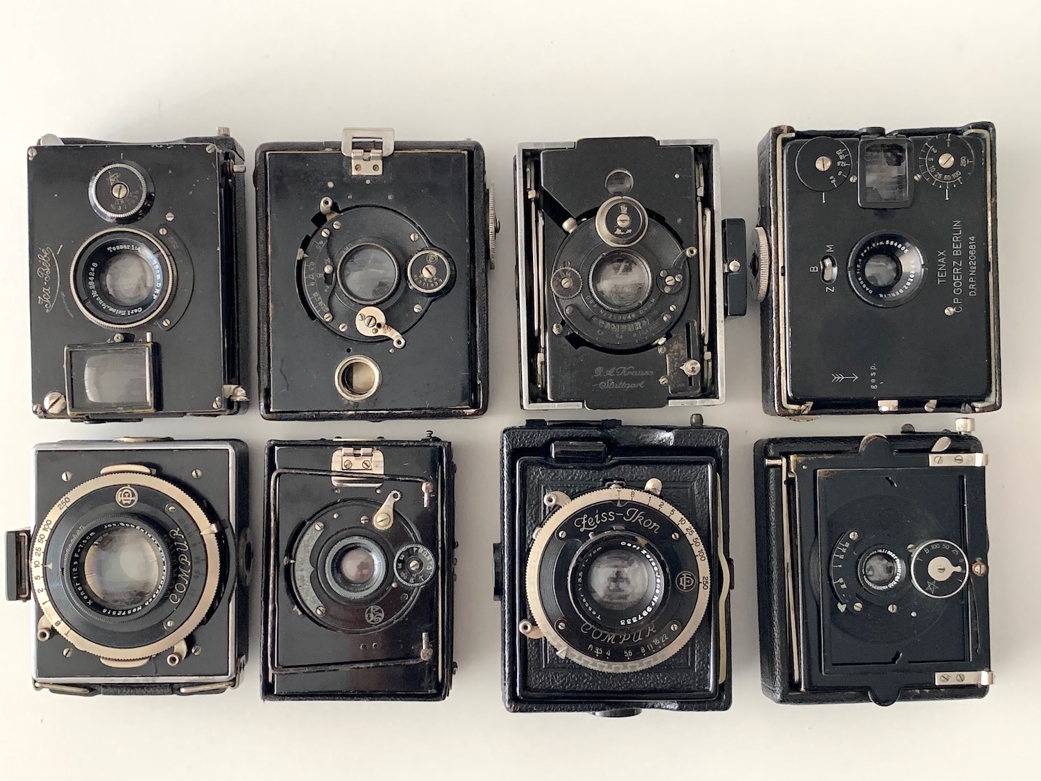 Die Errtee/Nettix ist mit 8,3 x 6,2 x 2,5 cm eine der kleinsten Spreizenkameras für das Format, wie ein direkter Vergleich mit ähnlichen Modellen (von links oben bis rechts unten: Ica Bébé, Contessa Duchessa – hier in der Steinheil-Version –, Krauss Nanos, Goerz Westentaschen-Tenax, Kochmann Korelle-P, Zeiss Ikon Bébé 342 und Hüttig (??) Spreizenkamera 4,5x6) eindrucksvoll zeigt.
