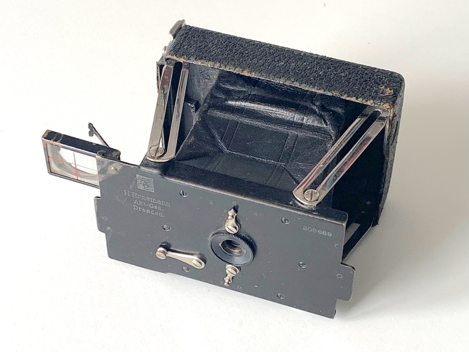Es handelt sich um eine Spreizenkamera in Querbauweise für Platten 4,5x6. Das Objektiv ist eine achromatische Linse im Einfachverschluss, der eine Momentzeit und Z (bei Ernemann die Bezeichnung für B) liefert. Eine Entfernungseinstellung erübrigt sich. Der mittige Hebel dient zur Einstellung einer der drei Revolverblenden. An der rechten Seite des Metallgehäuses befindet sich ein ausklappbarer Newtonsucher. Die Kamera besitzt Stativgewinde für Quer- und Hochformataufnahmen. Der rückwärtige Falz nimmt Einzel- oder Packfilmkassetten auf.