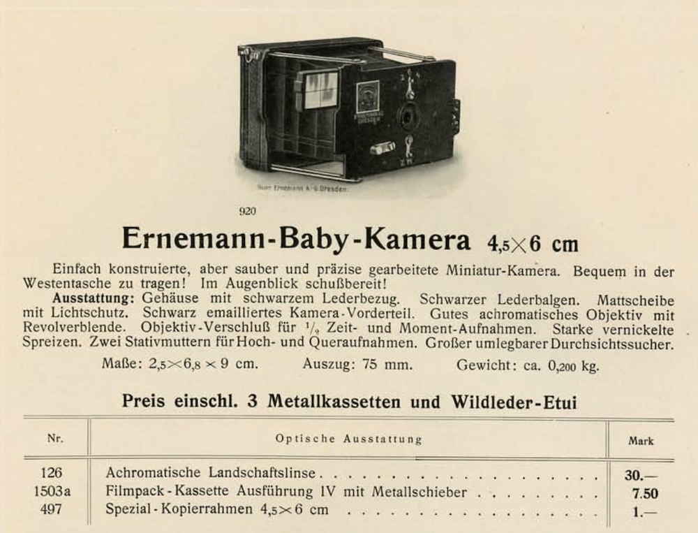 die hier vorzustellende Kamera wird im Ernemann-Katalog von Oktober 1912 (Liste 225) als "Ernemann Baby-Kamera 4,5x6" offeriert und folgendermaßen charakterisiert: "Einfach konstruierte, aber sauber und präzise gearbeitete Miniatur-Kamera. Bequem in der Westentasche zu tragen! Im Augenblick schußbereit!"