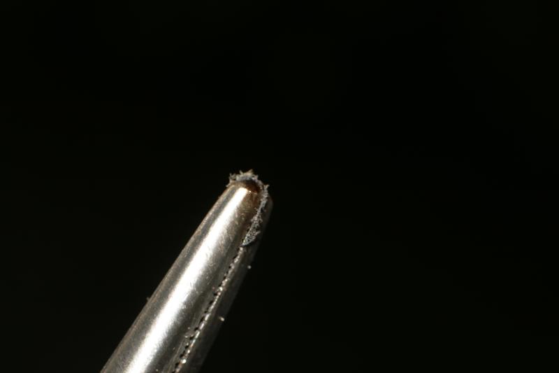 die russische GOMZ Fotokor-1 gilt als Kopie deutscher Laufbodenkameras. Das erscheint mir als relativ - auch deutsche Hersteller haben über den Tellerrand geblickt. Die Kamera ist für robusten Gebrauch ausgelegt - und das erscheint als durchaus nötig, wenn ich mir die zwei Exemplare anschaue, die ich habe. Sie enthalten eigenständige technische Details, insbesondere Vereinfachungen, die allerdings eine Reparatur erschweren (einen Hammer zum Austreiben von Stiften hatte ich sonst nie gebraucht). Die ersten Fotokors hatten deutsche Verschlüsse, Compur bzw. Vario, und sind sehr selten und gesucht (und öfter wohl auch gefälscht). Aber zuerst der russische Verschluß, eine Vario-Kopie von GOMZ, mit Ortagoz-Objektiv (asymmetrischer Dialyt - die hinterste Linse ist erheblich dicker als die vorderste, bei gleich erscheinenden Reflexen vorne und hinten). Einleitend eine Frage an Radio Eriwan: "Kann man mit einer Kamera von 1939 ein Haus sprengen?". Antwort: "Im Prinzip ja, aber nur mit einer russischen!". Und damit bin ich beim heutigen Thema. Bei meiner Fotokor-1, Modell PK245 (1939, evtl. 1940) hakte die Blende anfangs etwas - und dann blockierte sie, ein Blendenblatt war defekt. Nach Öffnen des Gehäuses zeigte sich, daß eines der beiden Verschlußblätter gebrochen war, ein paar der Splitter lagen noch im Gehäuse. (links GOMZ/Ortagoz 4.5/135 von 1939 - vereinfacht, kriegsbedingte Mangelwirtschaft? - rechts das weit konventionellere GOMZ/Ortagoz 4.5/135 von 1938) Bei meiner Fotokor-1, Modell PK235 (1938, evtl. 1937) war die Blendenbewegung sofort beschränkt. Das kann man normalerweise beheben - ggf. mit einem Blendenblatt weniger, auch mit 9 Blättern statt 10 ist die Blende noch ziemlich rund. Leider ist das Blendengehäuse von der unangenehmeren Art - kein beidseitiger Käfig. Und hier ging nichts, obwohl alles zwar ein wenig krumm, aber brauchbar aussah. Doch die Blendenblätter sind dort, wo die Stifte sind, stark gekrümmt (geschrumpft oder gequollen?). Ich hätte bei der einen das kaputte Blendenblatt ohne Öffnen des Käfigs soweit möglich herausoperieren müssen. Das Ende vom Lied: bei beiden ist die Blende nur bis etwa Blende 6.3 zu schließen, und die eine muß mit 6 Blendenblättern auskommen. Ich rätselte, etwas mußte anders sein als sonst. Mit 12x-Lupe schaute ich die Trümmer des Verschlußblatts an. Hoppla - die Bruchfläche war schwarz! Kein Irrtum möglich - Kunststoff! Kunststoff? 1939?! Da fiel mir nur ein möglicher ein: Zelluloid! Das basiert auf Nitrozellulose, ist also verwandt mit Sprengstoff. Wird im Alter zunehmend brüchig und leichter entflammbar. Bei ungünstigen Bedingungen selbstentflammend, im Extremfall genügen 30°. Es gab schwere Unfälle damit, deshalb wurde der Sicherheitsfilm entwickelt und Filme aus Zelluloid verboten. In Deutschland wurde in WKII verboten, Negative aus Zelluloid im Haus aufzubewahren. Ein deutscher Zelluloid-Hersteller hatte die Abfälle aus der Produktion vergraben - das ergab einige unterirdische Brände (vorangehend Erwärmung durch die Emissionen). Filmarchive haben noch heute ihre Not damit trotz strenger Sicherheitsbestimmungen. Nur Puppen waren noch länger daraus .. Ob's das sein konnte, probierte ich mit den Trümmern aus, siehe Bilder. Mit brennendem Streichholz ging ich heran. Einen Kerzendocht hätte ich mit der fast erlöschenden Flamme nicht beeindrucken können. Doch die Bruchstücke fingen unmittelbar zu brennen an und brannten in Sekundenbruchteilen ab.