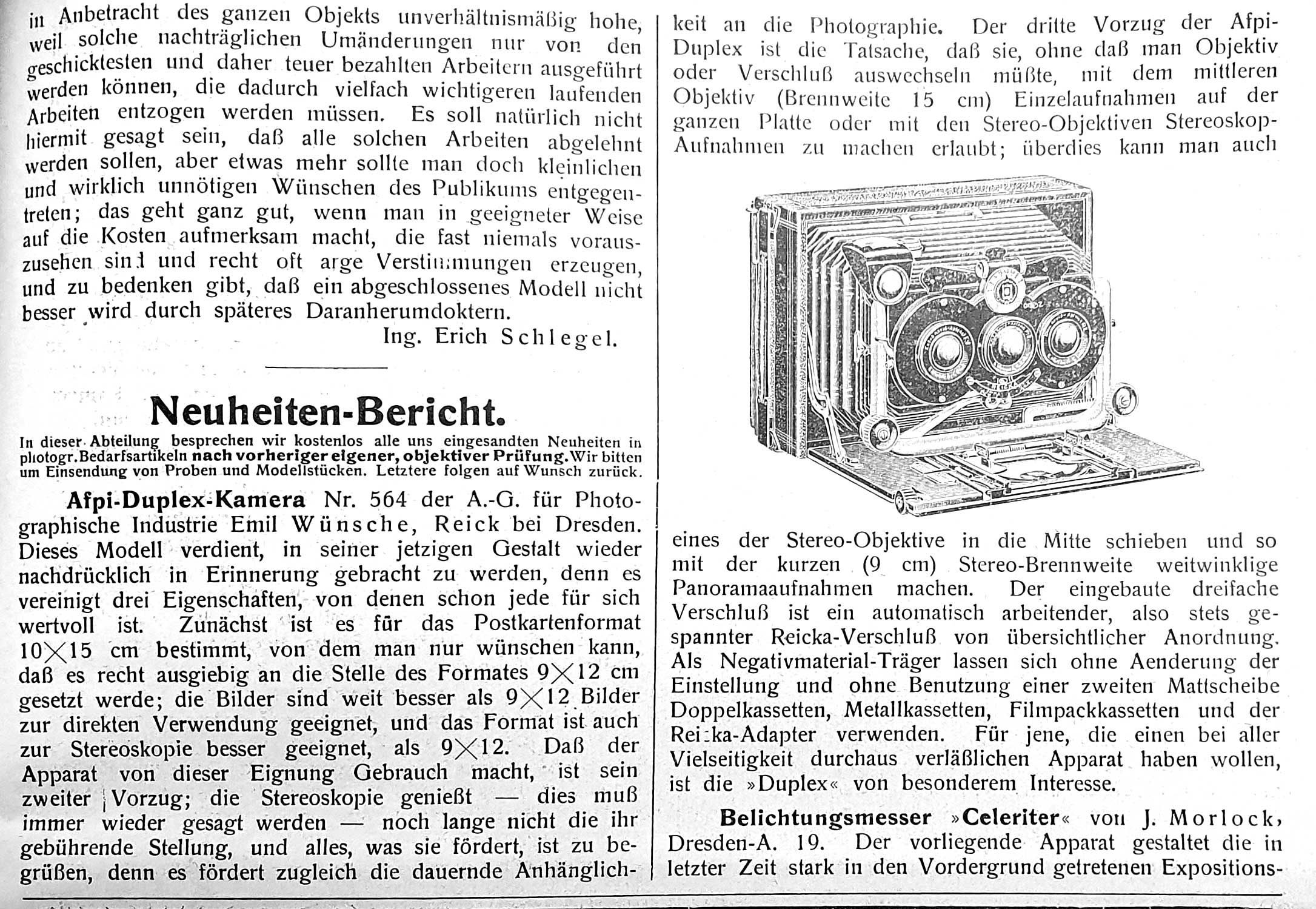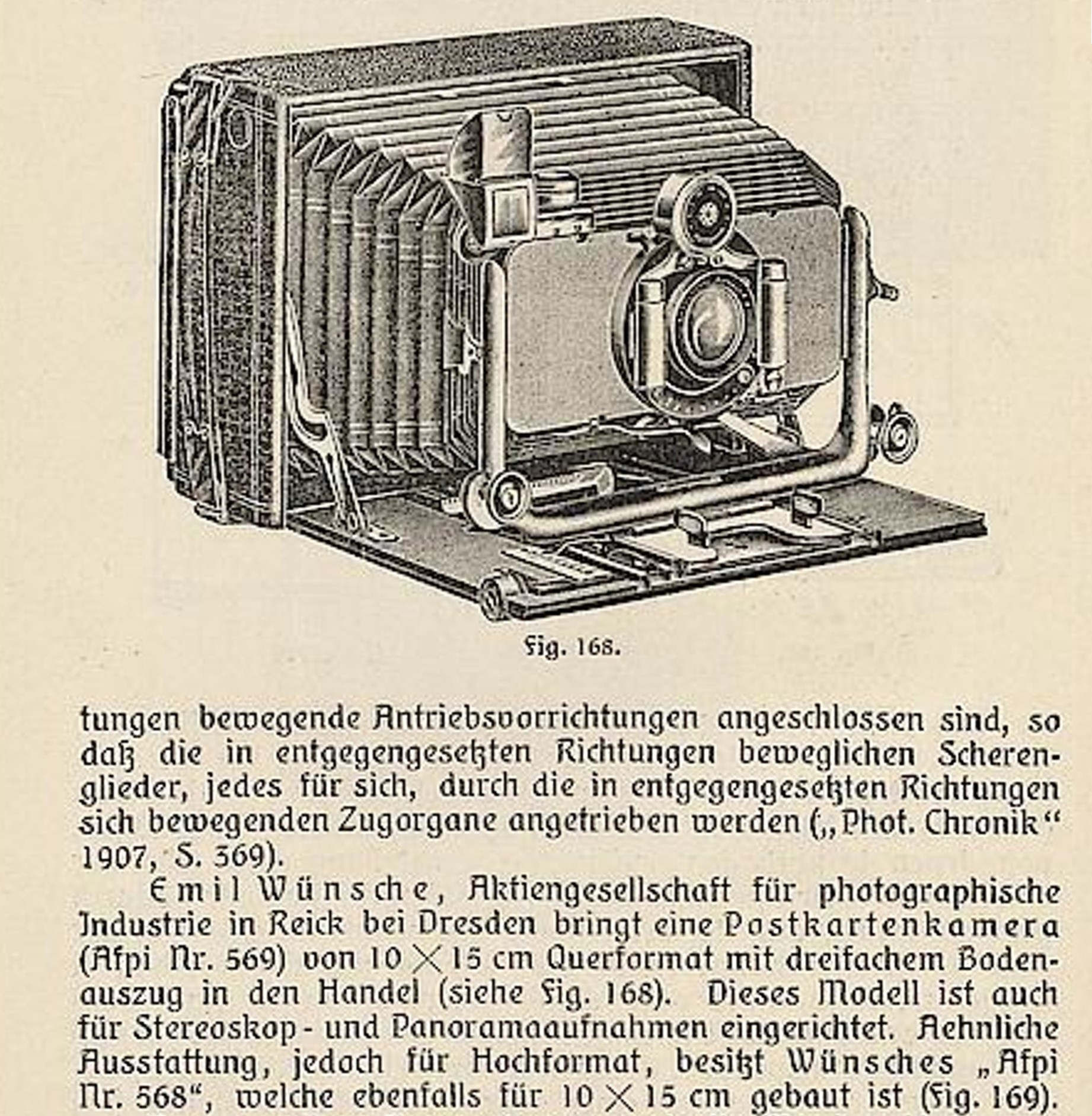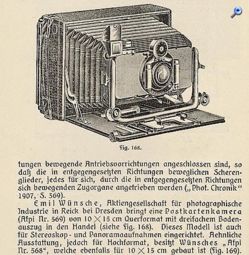 Ich füge dieses weitere Bild hinzu, falls es von Interesse sein sollte. Es handelt sich um eine weitere Afpi-Kamera von Emil Wünsche mit der Katalognummer 569 im Querformat für 10x15-Bilder, die auch für stereoskopische Aufnahmen verwendet werden konnte.