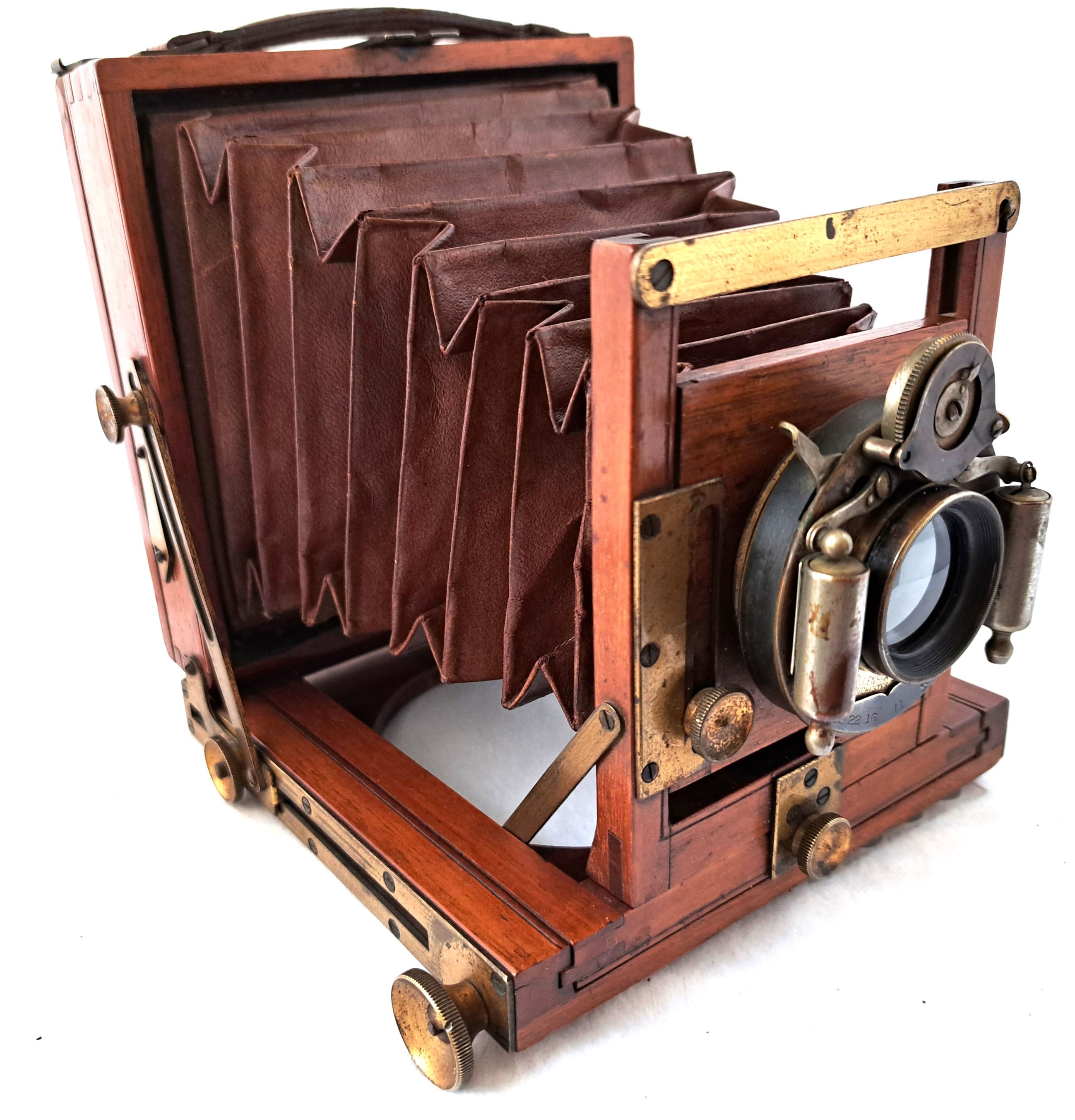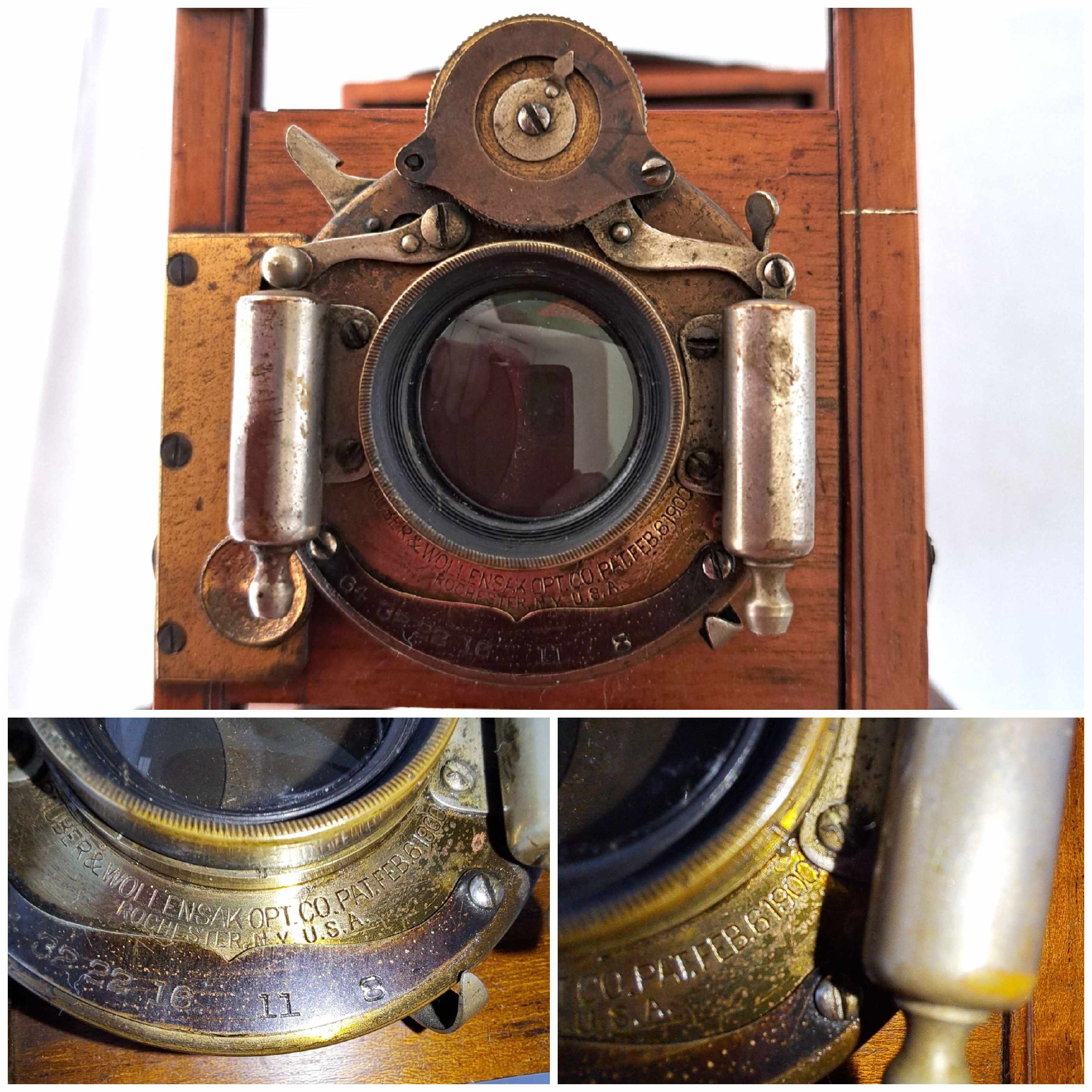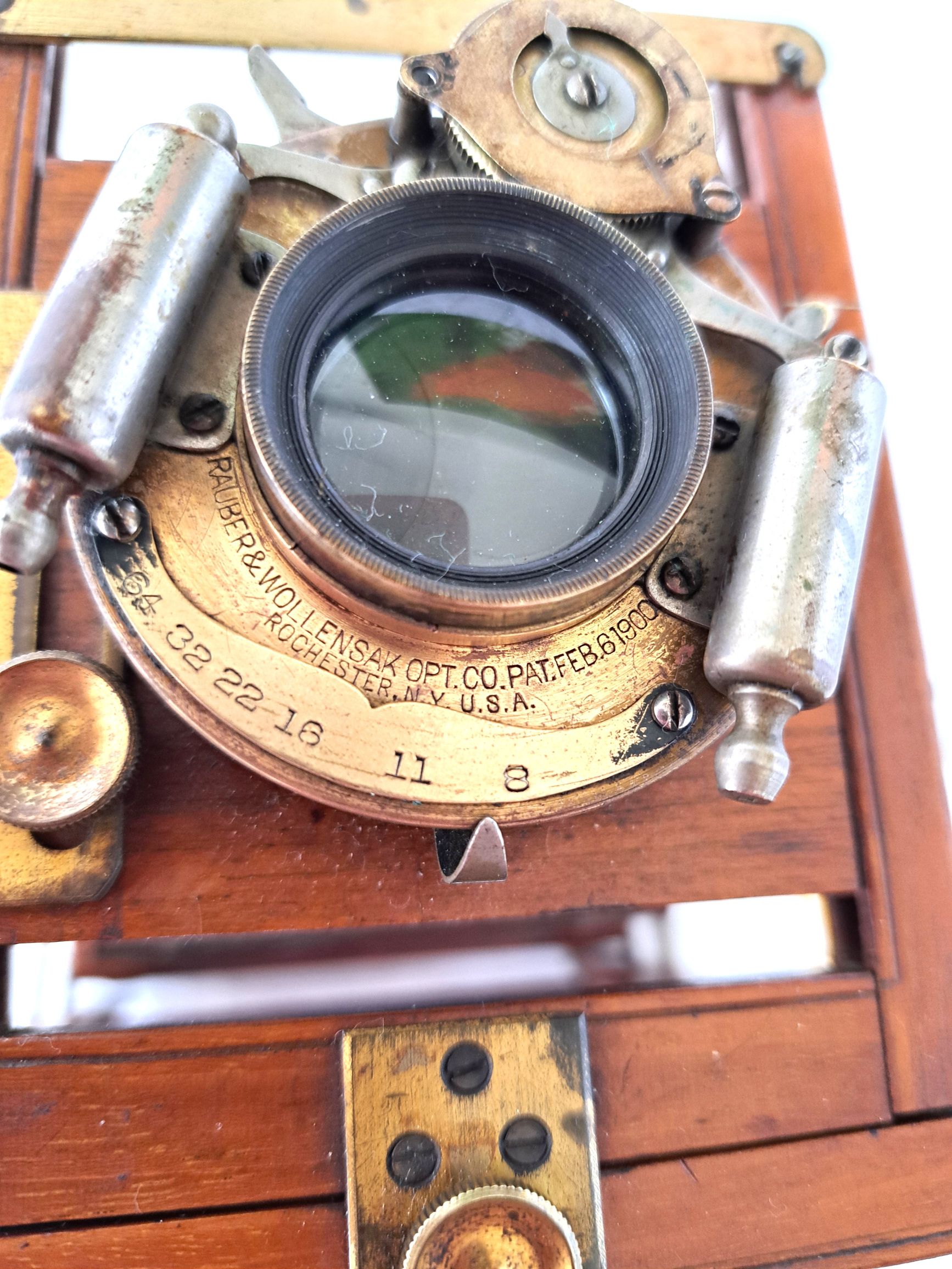 heute möchte ich eine kleine Reisekamera/Studiokamera mit quadratischem Gehäuse, dem Bildformat 8x10,5 und mit einem Objektiv von Rauber&Wollensak Opt.Co. Pat. 1990 Rochester N.Y. USA vorstellen. Ich hatte mir diese Plattenkamera aus Holz vor einiger Zeit zu reinen Dekozwecken gekauft, ihr wenig Beachtung geschenkt und mir auch keine Gedanken über Alter und Herkunft gemacht. Ich habe einen Thread von Rainer gefunden, der mich ermutigt hat, diese kleine Kamera im Forum vorzustellen.