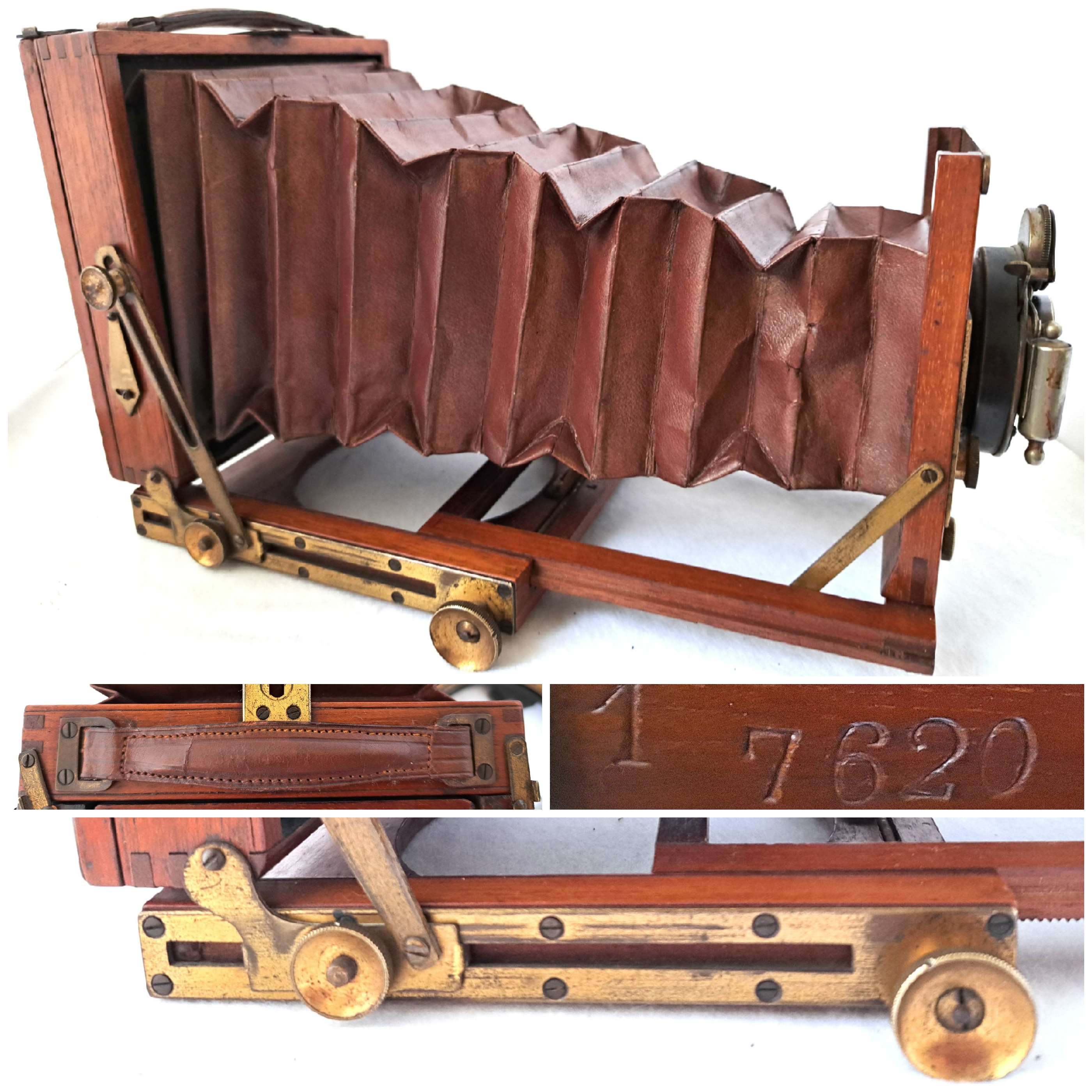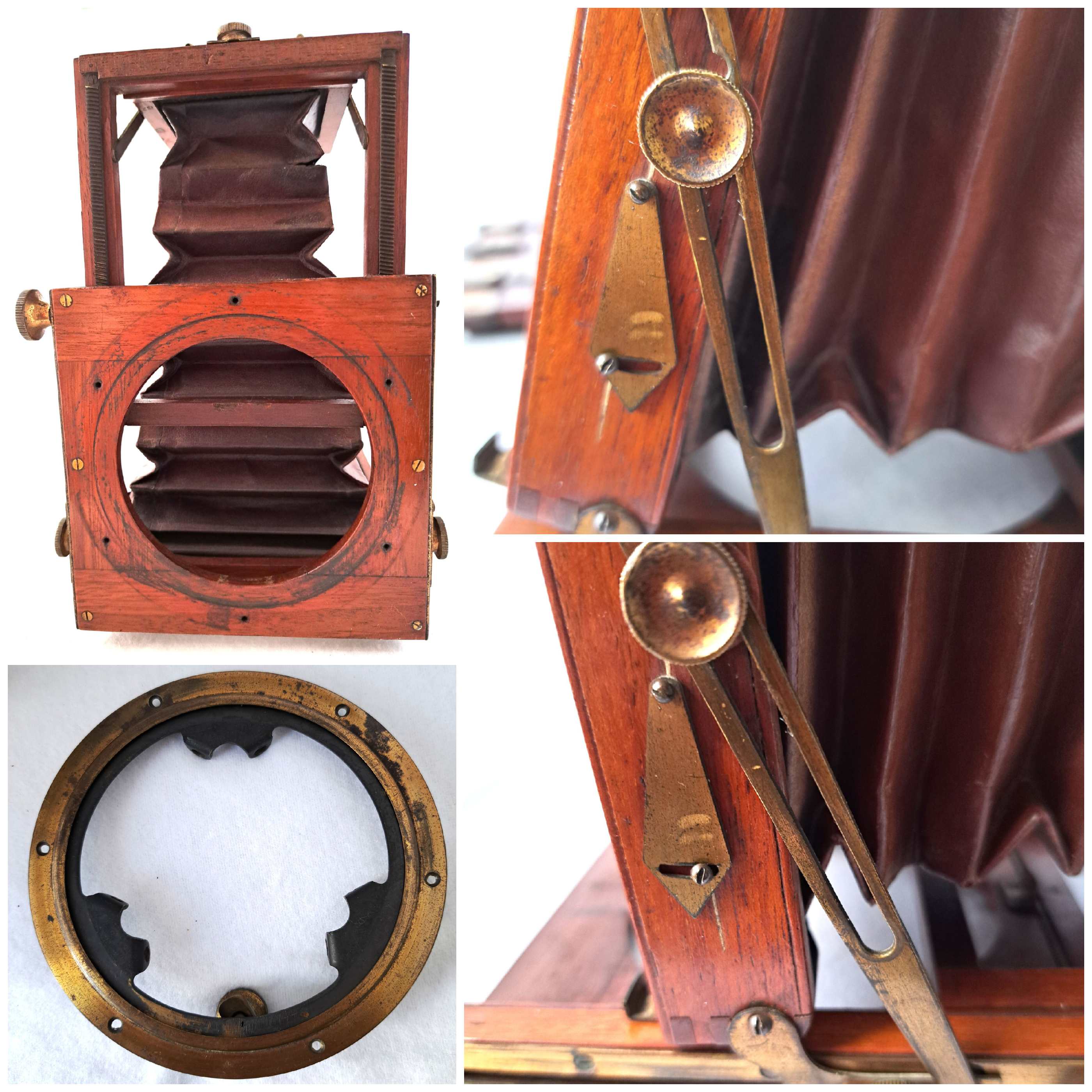 Für eine Reisekamera/Studiokamera hat sie ein recht kleines Format. Am unteren Gehäuserand ist eine Seriennummer eingestanzt. Mittels Rändelschraube über einen Zahntrieb offenbart diese Kleine ihre wahre Größe, wenn der Laufboden auf die doppelte Länge herausgefahren wird. Das Gehäuse, Laufboden, Laufschlitten und Standarte sind, wie ich vermute, aus Mahagoni und erkennbar an der rötlichen Farbe der unlackierten Ausfräsungen für den Laufschlitten. Der Objektivträger ist auch aus Holz gefertigt und in die Standarte durch Fräsung eingepasst. Er wird durch Lösen der Rändelschraube vertikal verschoben. Die Rückwand kann über Rändelschrauben und eine Art Spreizen geneigt werden.