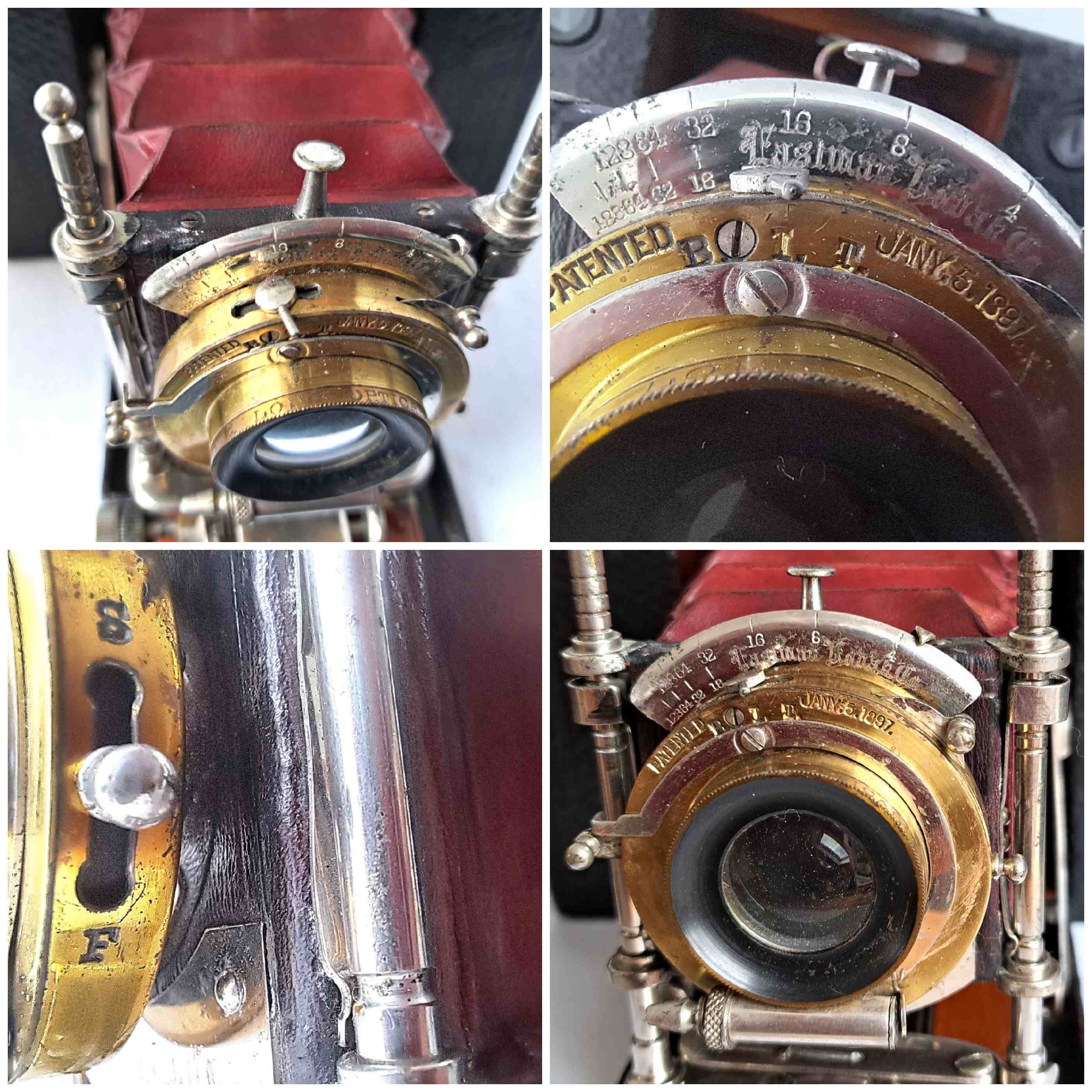 Alle Metallteile sind vernickelt, das Objektiv ist aus Messing. Das Objektivbrett ist aus Metall und lederbezogen. Oberhalb und unterhalb sind vernickelte Kreisring-Sektoren mit Blendenbeschriftung oben und Eastman Kodak unten.