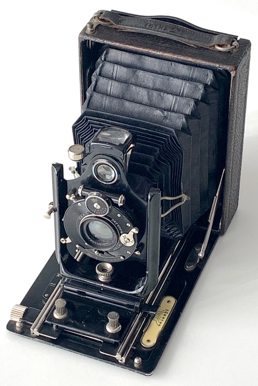 die hier vorzustellende Kamera ist ein Beleg für die verwirrende Modell- und Bezeichnungsvielfalt, die mit der Fusion zur Ica AG 1909 entstand und eine Programmbereinigung erforderlich machte. Schon im Katalog 1911 finden sich zwei ganz unterschiedliche Modelle mit der Bezeichnung Toska – das Modell 330, eine Querformat-Kamera im Format 10x15 (--> https://blende-und-zeit.sirutor-und-comp...&thread=182), und eine hochformatige 9x12-Kamera. Die Toska 330 lief im Katalog 1910 noch als Reicka, und wie der Name (< Dresden-Reick) andeutet, stammt sie aus dem Programm von Wünsche. Die Toska 9x12 hingegen wurde aus dem Sortiment von Hüttig übernommen; zugrunde liegt wohl die Toska 112.