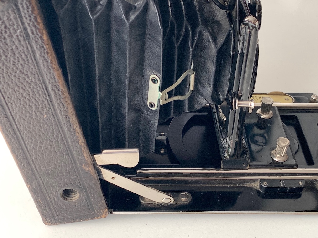 Die Kamera wurde in unbekanntem Zustand mit nicht passendem Vario und Enna-Objektiv annonciert, immerhin war die Originalschachtel dabei. Daher war ich zunächst weniger an der Kamera als an den beiden mitgelieferten Anlegekassetten interessiert; die werden sonst mit Gold aufgewogen. Nach einer ersten Reinigung präsentiert sich die Kamera in einem recht ansprechenden Zustand, und zufälligerweise hatte ich aus einer defekten Kamera noch einen zeitlich exakt passenden Compound mit Hekla 6,8/13,5 da, sodass ich sie wieder komplettieren konnte.