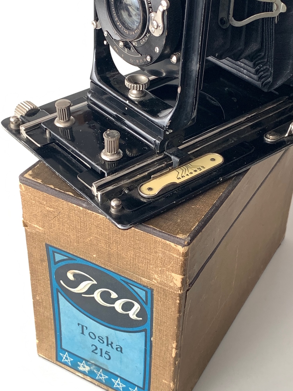 Es handelt sich um eine Laufbodenkamera im Leichtmetallgehäuse für Platten 9x12. Die Kamera besitzt eine gehobene Ausstattung; dazu gehören der doppelte Auszug, der absenkbare Laufboden und die komfortablen Anlagekassetten, die den ‚besseren‘ Modellen vorbehalten waren. Beim vorliegenden Exemplar konnte der Verschluss mittels Bajonettanschluss schnell gewechselt werden (der Entriegelungshebel wurde jedoch leider demontiert). Die Kamera ist also weitgehend vergleichbar mit Modellen wie der Nelson (später Ideal) 225, Minimal 235 oder Ideal 246. Nur die Verstellung des Objektivbretts weicht ab: Bei der Toska wird es verschoben, bei den anderen Modellen gibt es einen Spindeltrieb bzw. eine andere Mechanik. Das Design der Kamera und konstruktive Details wurden in den ersten Ica-Jahren sukzessive verändert, wie ein Vergleich der Abbildungen in den Katalogen zeigt. Das vorliegende Exemplar dürfte gem. Seriennummer aus dem Zeitraum 1912–13 stammen; es besitzt ein Metallgehäuse (frühe Exemplare hatten ein Holzgehäuse) und schon die ‚modernen‘ zylinderförmigen Handhaben, aber noch die alte Klemm-Mechanik für die Höhenverstellung.