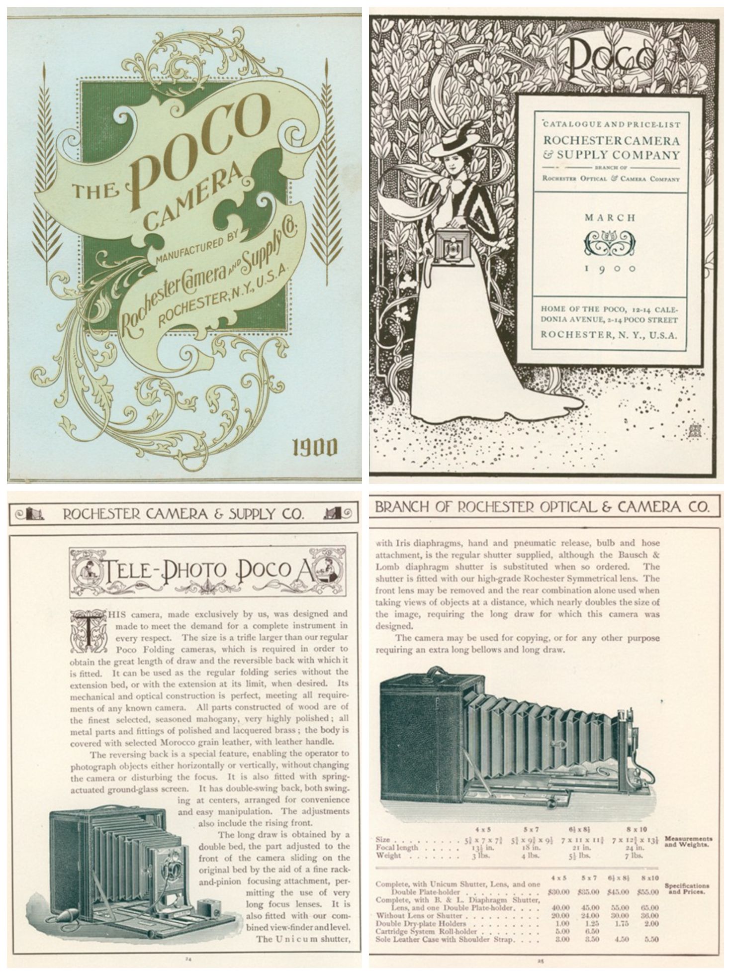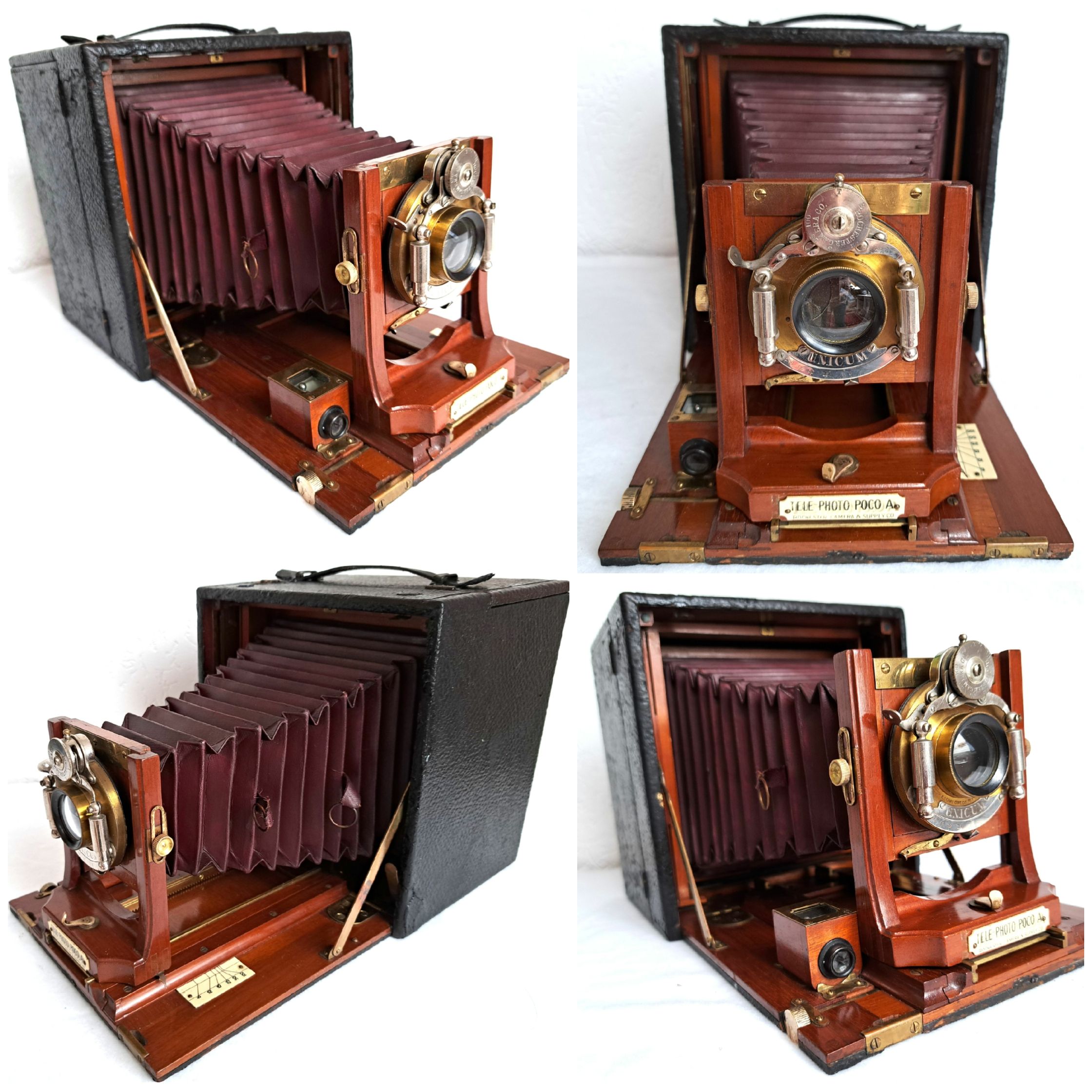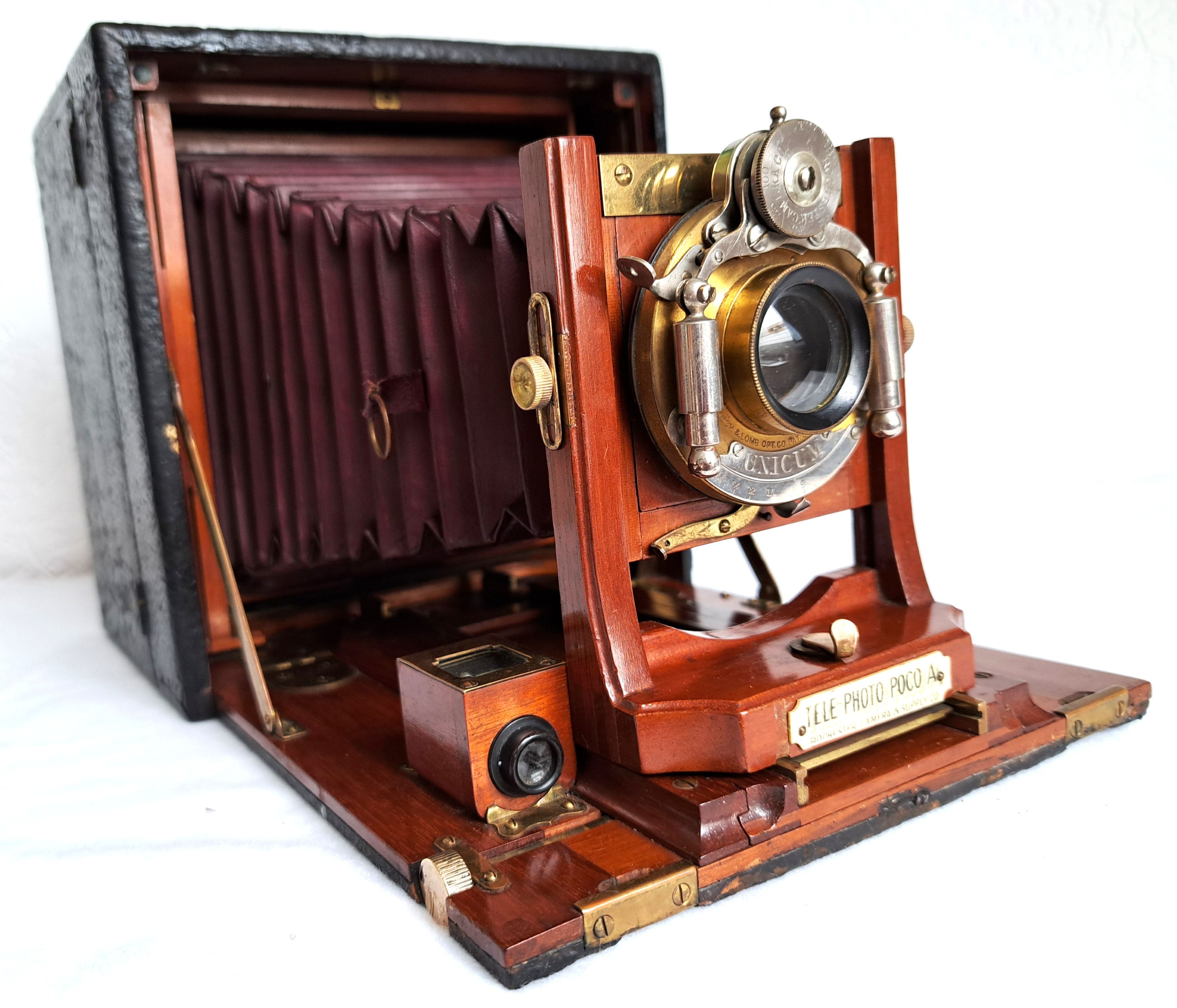 Katalog Rochester Camera and Supply Company:Diese Kamera wurde entwickelt, um die Anforderungen einer vollständigen Kamera für professionelle Fotografen und fortgeschrittene Amateure zu erfüllen. Obwohl sie etwas größer als die regulären Poco-Faltkameras ist, erfüllt sie alle Anforderungen und ist in mechanischer und optischer Hinsicht bis ins kleinste Detail perfekt gefertigt. Sie wurde als Spitzenmodell konzipiert und kombiniert mechanische Raffinesse mit luxuriösen Materialien. Die Kamera ist ein beeindruckendes Beispiel für die Innovationen im Kamerabau um 1900 und zeigt, wie Fotografen damals mit mechanischen Lösungen eine hohe Flexibilität und Präzision erreichen konnten.